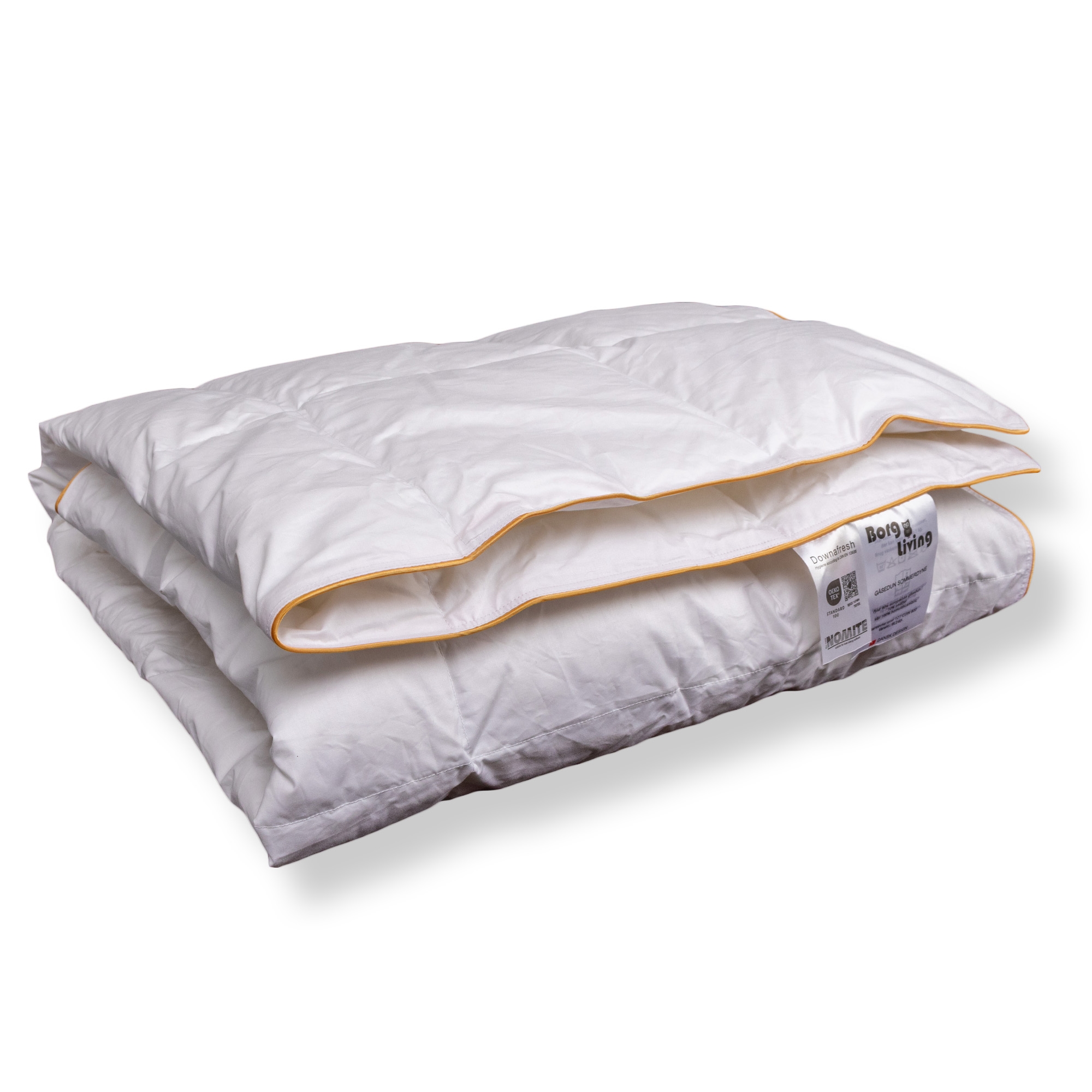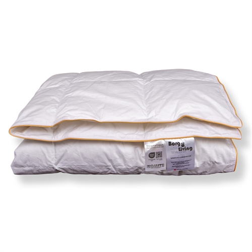 Forside »Innredning » Barnerommet » Juniordyne 100x140 cm Allergivennlig junior sommerdyne 100x140 cm - Lett sommerdyne med hvite europeiske gåsedun - Borg Living baby gåsedunsdyne Spar48% Borg Living 2.299,001.199,00NOKSpar 1.100,- På lager Trustpilot Antall Legg i kurv Se mer fra: Borg Living Artikkelnummer:BL240-8 Les vår dyneguide Les om vedlikehold av dyner og puter Se vårt store utvalg av puter Har du spørsmål om produktet? Lett, luftig & pustendeRene, hvite gåsedunAllergivennlig Størrelse: 100x140 cm Type: Sommerdyne - sval Fyll: 90% nye europeiske hvite gåsedun Fyllvekt: 130g Bæreevne: Over 12 (Gammel målemetode) CUIN: 800 (Ny målemetode) Bolster: 100% bomullscambric 80/80 Konstruksjon: 5x7 kassettedyne med gull piping kant Merke: Borg Living Vask: 60° (Viktig å bruke enzymfritt vaskemiddel) Tørketromling: Tørketromles med tørkeballer Garanti: 5 år Sertifisering: NOMITE - Fri for husstøvmidd Sertifisering: Downafresh - 100% rene dun Sertifisering: Downpass - Høyeste dyreetiske forhold Sertifisering: STANDARD 100 by OEKO-TEX® (BJ025 147484 TESTEX). Din garanti for at produktet er fri for helseskadelig kjemi. Luftig og lett juniordyne En luftig og lett junior sommerdyne fylt med nye, hvite, europeiske gåsedun. De fine dunene og det tettvevde bomullsbolsteret i cambric-kvalitet gir en dyne som føles silkemyk og faller lett rundt barnets kropp. Med en bæreevne på over 12 får man en dyne av høy kvalitet som gir den ideelle balansen mellom pusteevne og letthet. Bomullscambric bolster Det myke bolsteret i 100% bomullscambric er vevd i små, tette kassetter som sikrer jevn fordeling av dunene og optimal ventilasjon gjennom natten. Den tette vevingen gjør også at juniordynen er NOMITE-sertifisert, da støvmidd ikke kan trenge gjennom bolsteret, noe som også gjør dynen velegnet for allergikere. Se vårt store utvalg av junior sengetøy i 100x140 cm her En lang rekke sertifiseringer Denne serien av sommerdyner med gåsedun har en lang rekke sertifiseringer som er din garanti for en god og hygienisk kvalitetsdyne. Dynen er både NOMITE- og Downafresh-sertifisert, noe som garanterer at dunene er renset og bearbeidet etter strenge europeiske standarder, og at de kommer fra produsenter som overholder regler for dyrevelferd. For enkel oppbevaring leveres dynen i en praktisk oppbevaringstaske, slik at du kan beskytte og bevare dynens egenskaper når den ikke er i bruk. Husk bare å sikre at dynen er helt tørr før du pakker den bort - eventuelt etter en tur i tørketrommelen. Det danske merket Borg Living produserer eksklusive serier av dyner, puter og boligtekstiler til hjemmet ditt. Merket, etablert i 2013, er blant annet kjent for sin nytenkning innen kvalitet og design. Borg Livings fantastiske produkter bidrar til optimal og behagelig nattesøvn samt pynter opp hjemmet ditt med moderne og lekkert boligtilbehør. Tilbake til Juniordyne 100x140 cm