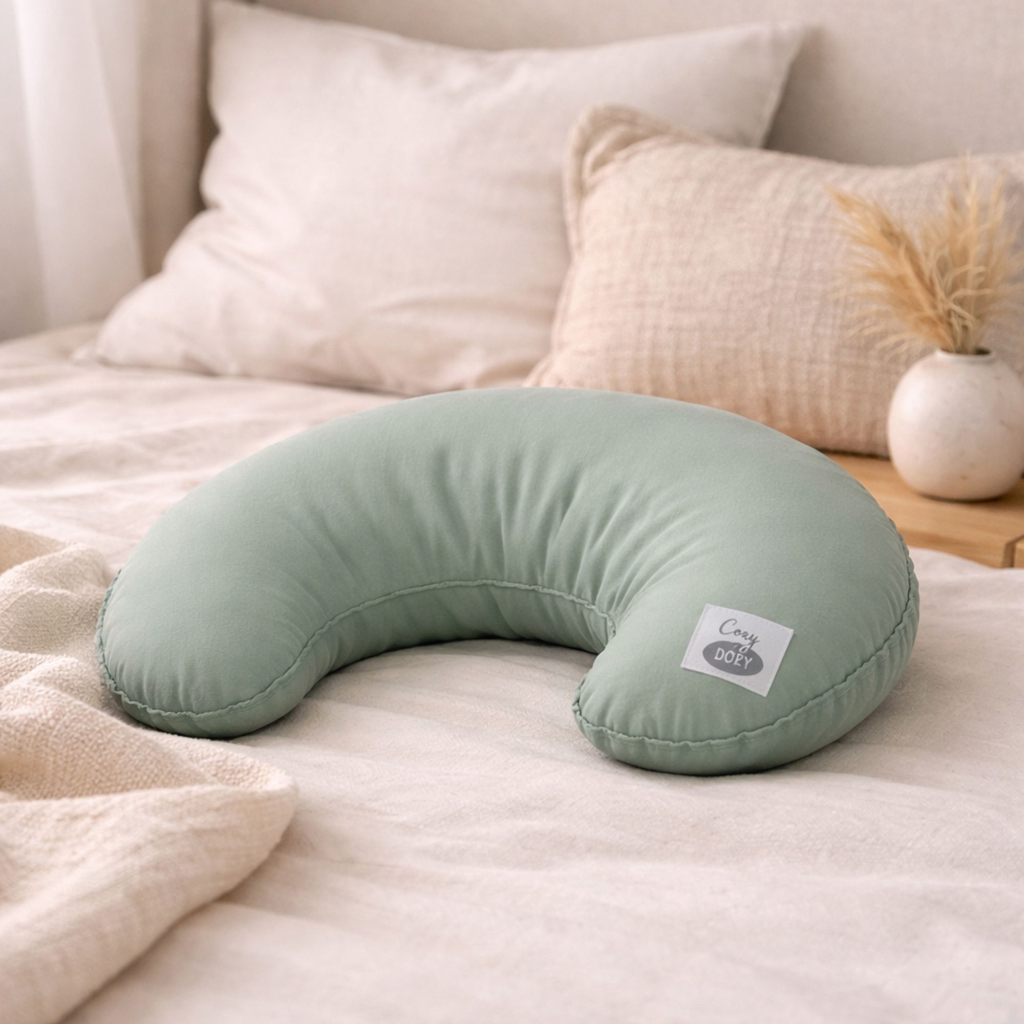 Ammeputen fra Cozy by DOZY er utviklet for nybakte foreldre som ønsker en kombinasjon av komfort, støtte og kvalitet under amming. Med sitt myke, ensfargede støvete grønne trekk i 100 % økologisk bomull får du en ammepute som både er skånsom mot babyens sarte hud og behagelig for mor å bruke over lengre tid. Bomullskvaliteten er pustende, naturlig og fri for skadelige stoffer, noe som skaper de beste forutsetninger for en trygg og komfortabel amming.