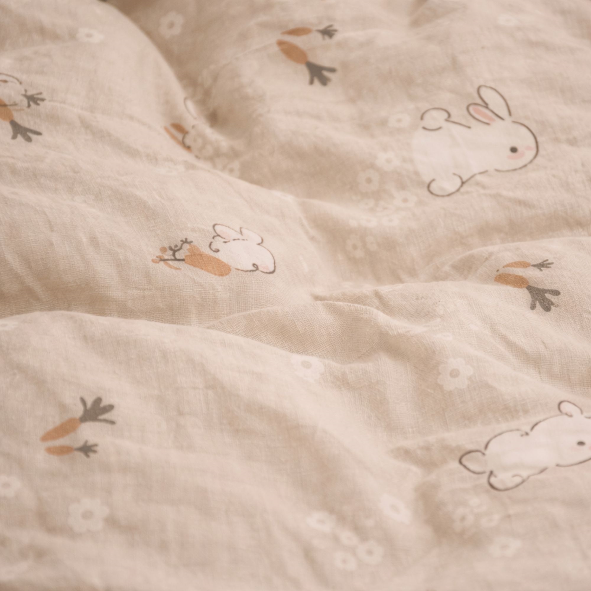 Deilig sengesett med print av kaniner. Baby sengetøyet passer til en vanlig babydyne størrelse og kan brukes i sengen, i babyreden, i barnevognen eller hvor enn dynen tas med. Babydynen er ofte fast rundt barnet i mange av døgnets timer, da den skaper stor ro, gjenkjennelighet, trygghet og varme for babyen - ikke bare den første tiden, men ofte opp til 2-3 års alder. Det brukes derfor mye og vaskes ofte, og derfor ønsker de fleste også mykt sengetøy i bomull av høy kvalitet.