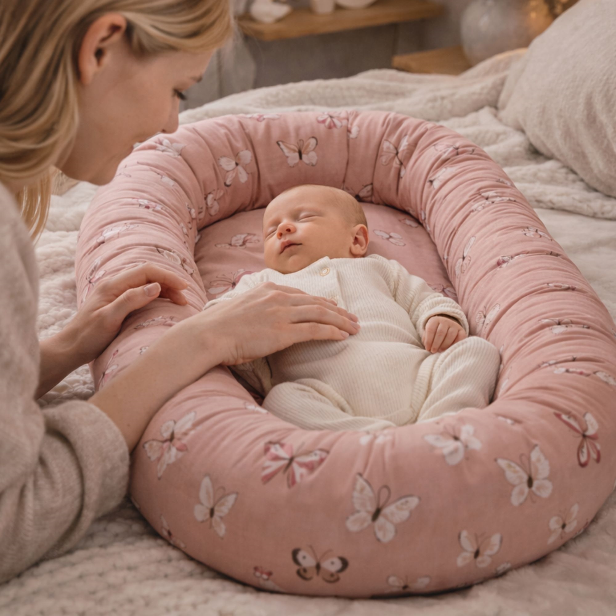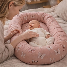 Det fine lyserosa designet med sommerfugler skaper et rolig og koselig uttrykk som passer perfekt inn på barnerommet. Babynesten kan brukes i babysengen, i sofaen under tilsyn eller som en trygg base når dere er på farten.