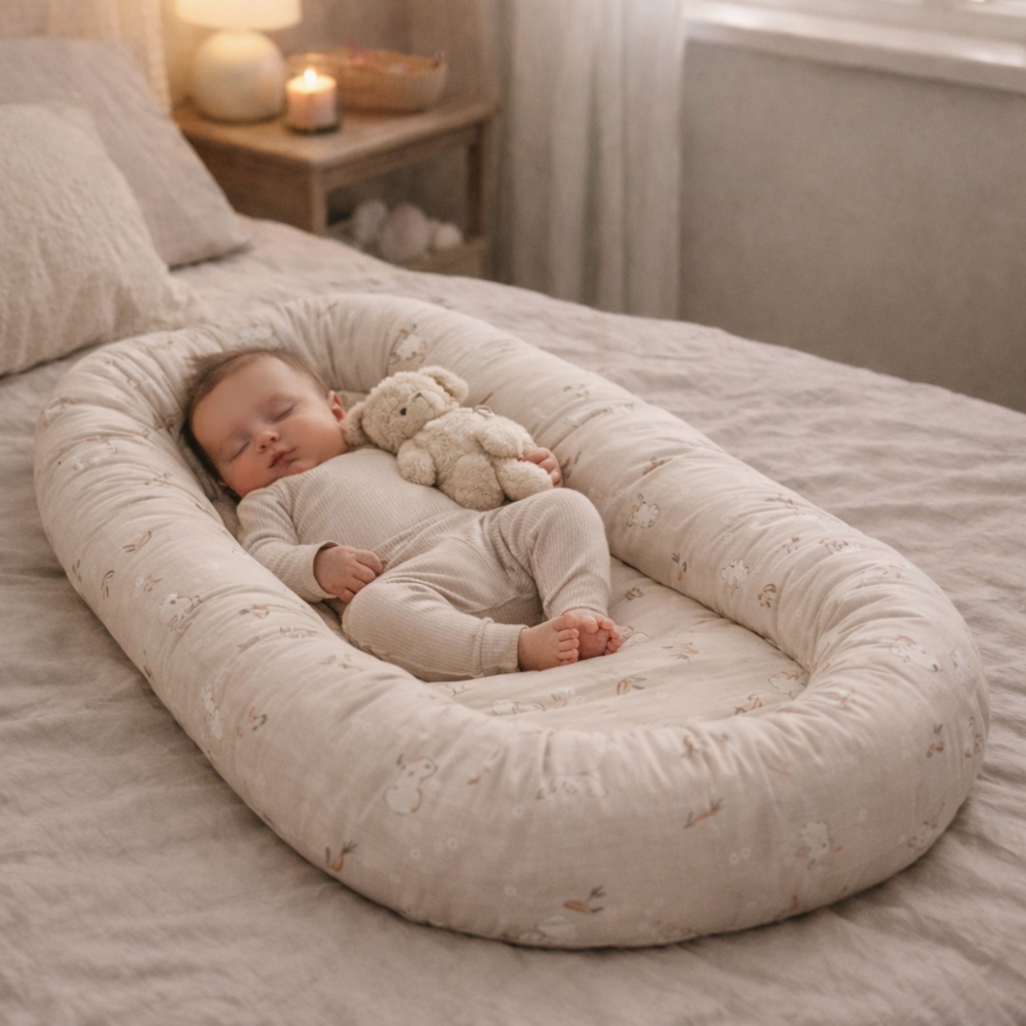 Behagelig og trygg babynest 86x46 cm i sandfarget med kaniner