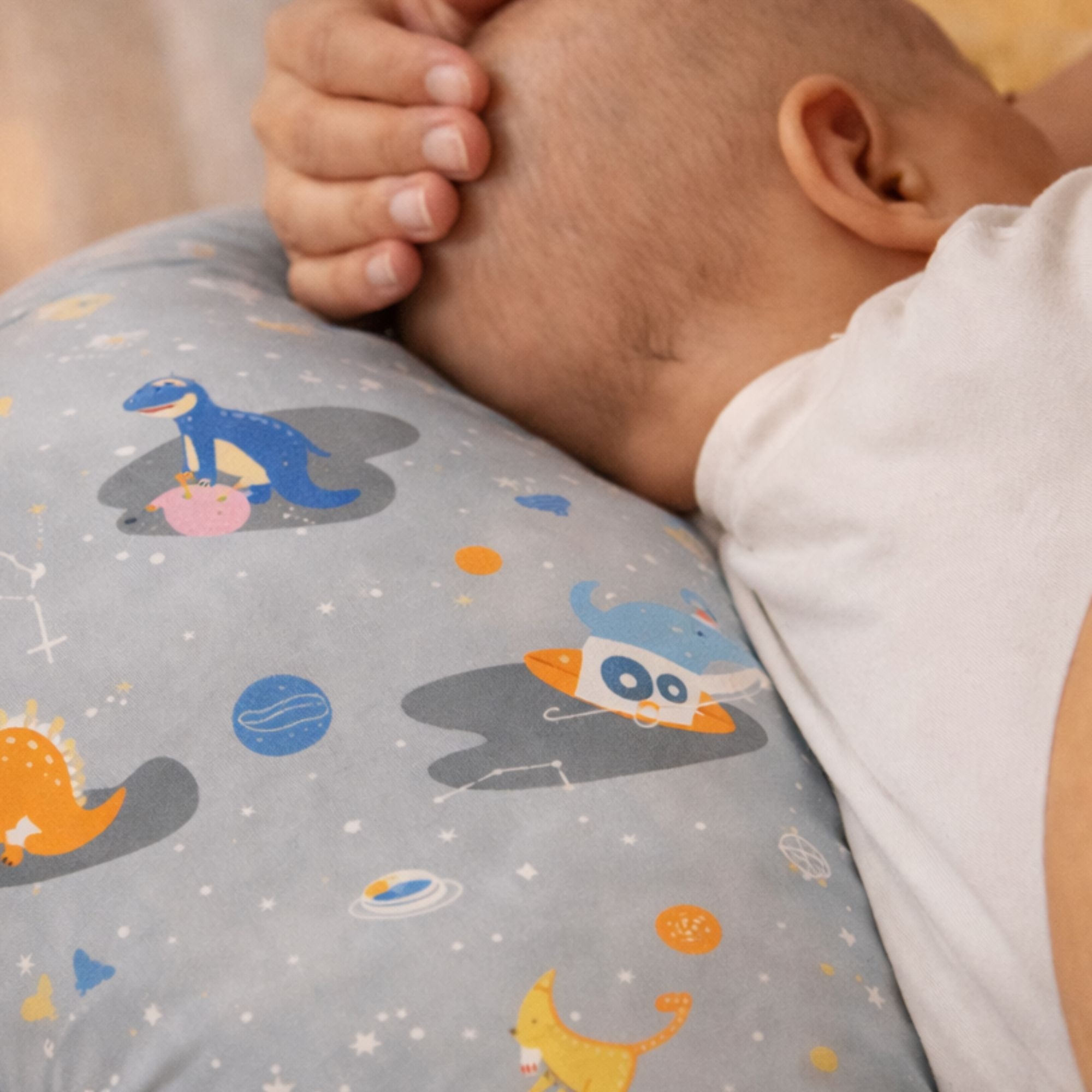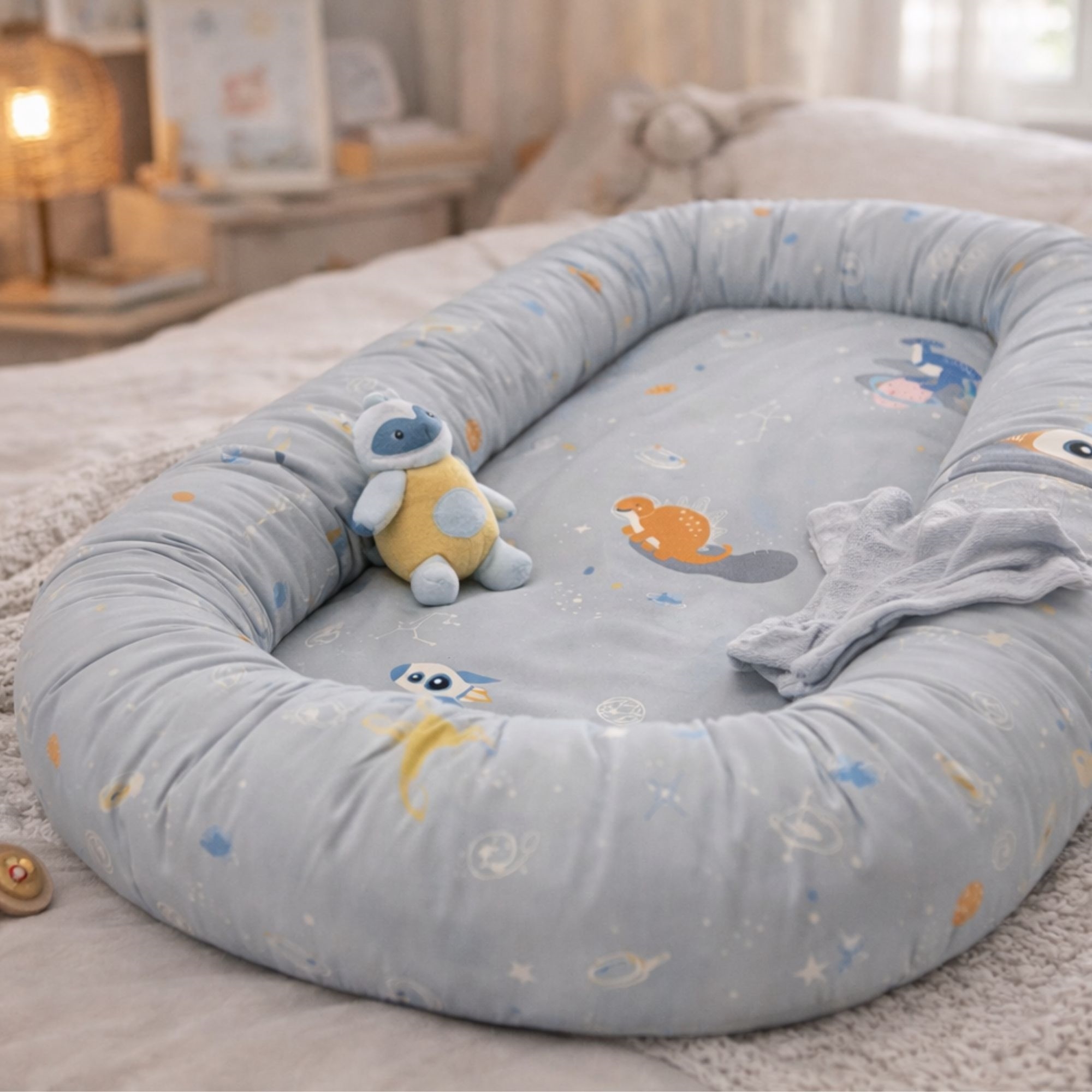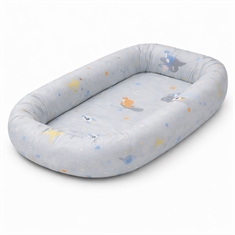Behagelig og trygg babynest 86x46 cm i grå med romdinosaur