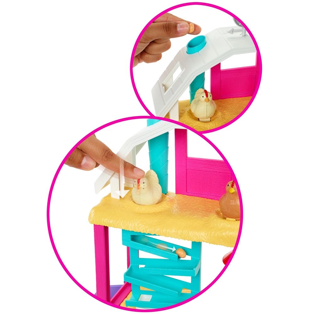 Settets innhold inkluderer Barbie®-dukken, et rugingshus, to farger modellervoks, en gressform, en spade, en bøtte, en kurv, eplegodbiter, en fôrautomat, en kalv, en kanin, to høner og seks kyllinger.