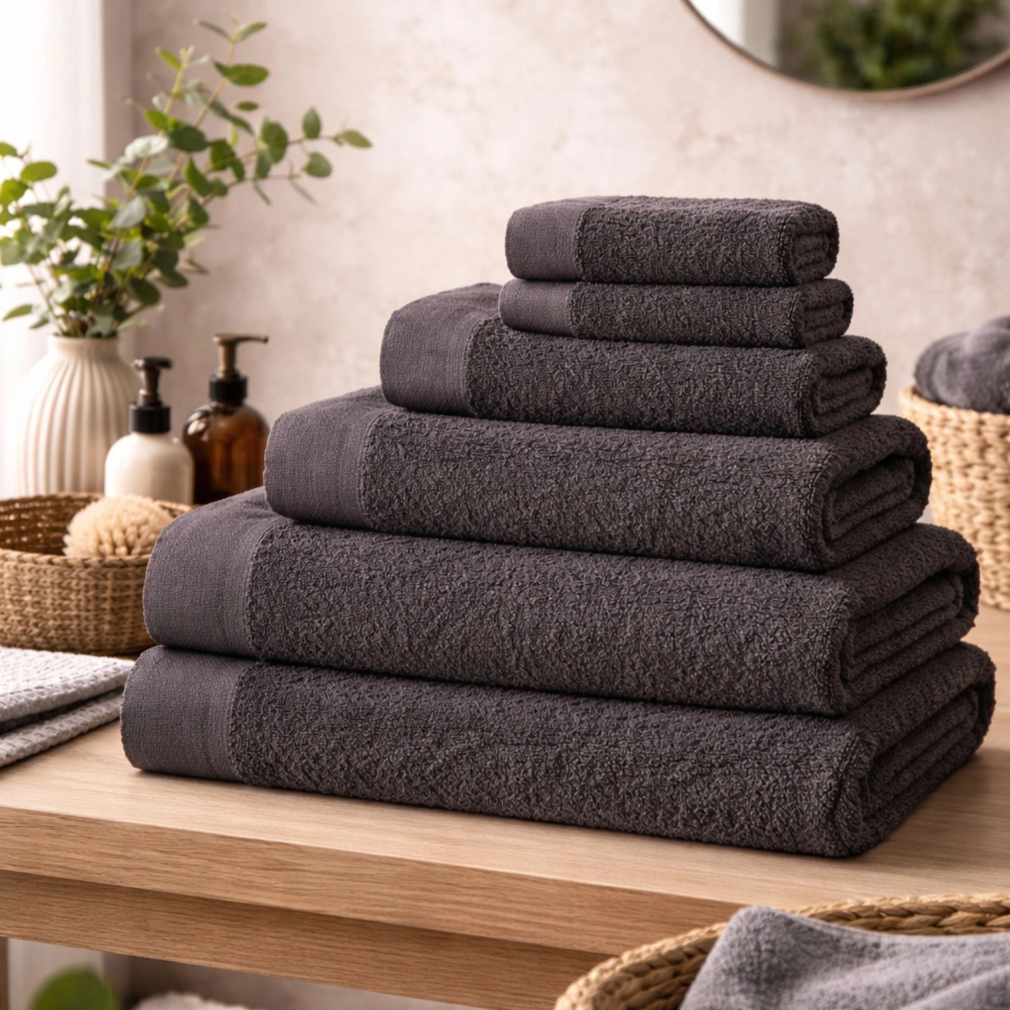 Skjem bort baderommet ditt med dette elegante håndklesettet fra By Borg. Med denne 6-pakken får du både funksjonalitet og stil samlet i ett - perfekt for deg som ønsker en pen og innbydende innredning. Denne 6-pakken består av 2 stk. 40x60 cm gjestehåndklær, 2 stk. 50x100 cm håndklær og 2 stk. 70x140 cm badehåndklær. Håndklærne er laget i 100% bomull, som gir en myk og behagelig overflate som føles deilig mot huden etter dusjen. Den praktiske opphengshempen gjør det enkelt å henge håndkleet opp, så det alltid er klart til bruk. Et åpenbart valg for deg som ønsker myke, slitesterke og stilfulle håndklær i hverdagen.