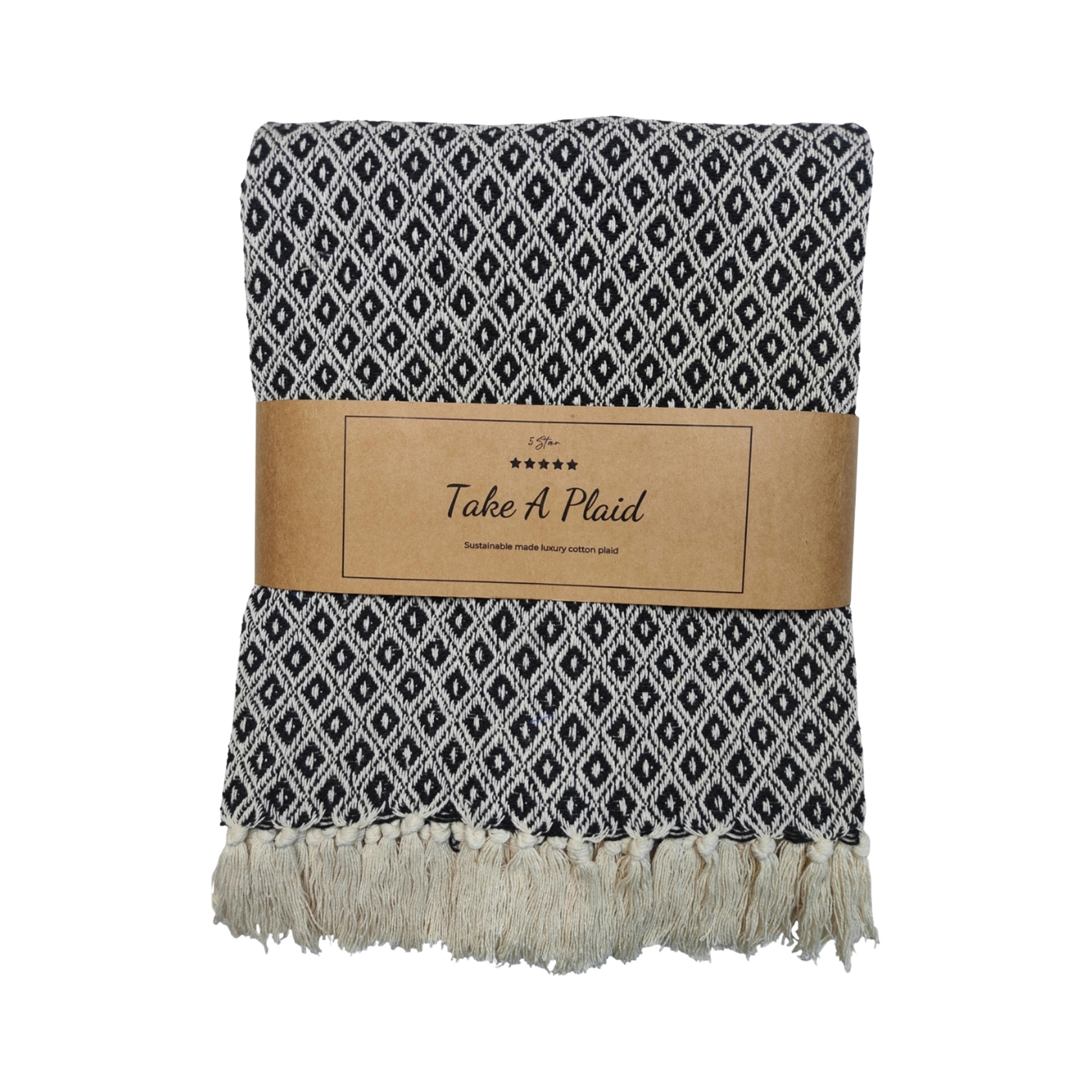 Skap en hyggelig og stilfull stemning i hjemmet ditt med dette vakre bomullspled fra Take a plaid. Pleddet er produsert i 100% resirkulert bomull, noe som gjør det både mykt, komfortabelt og til et mer bærekraftig valg.
