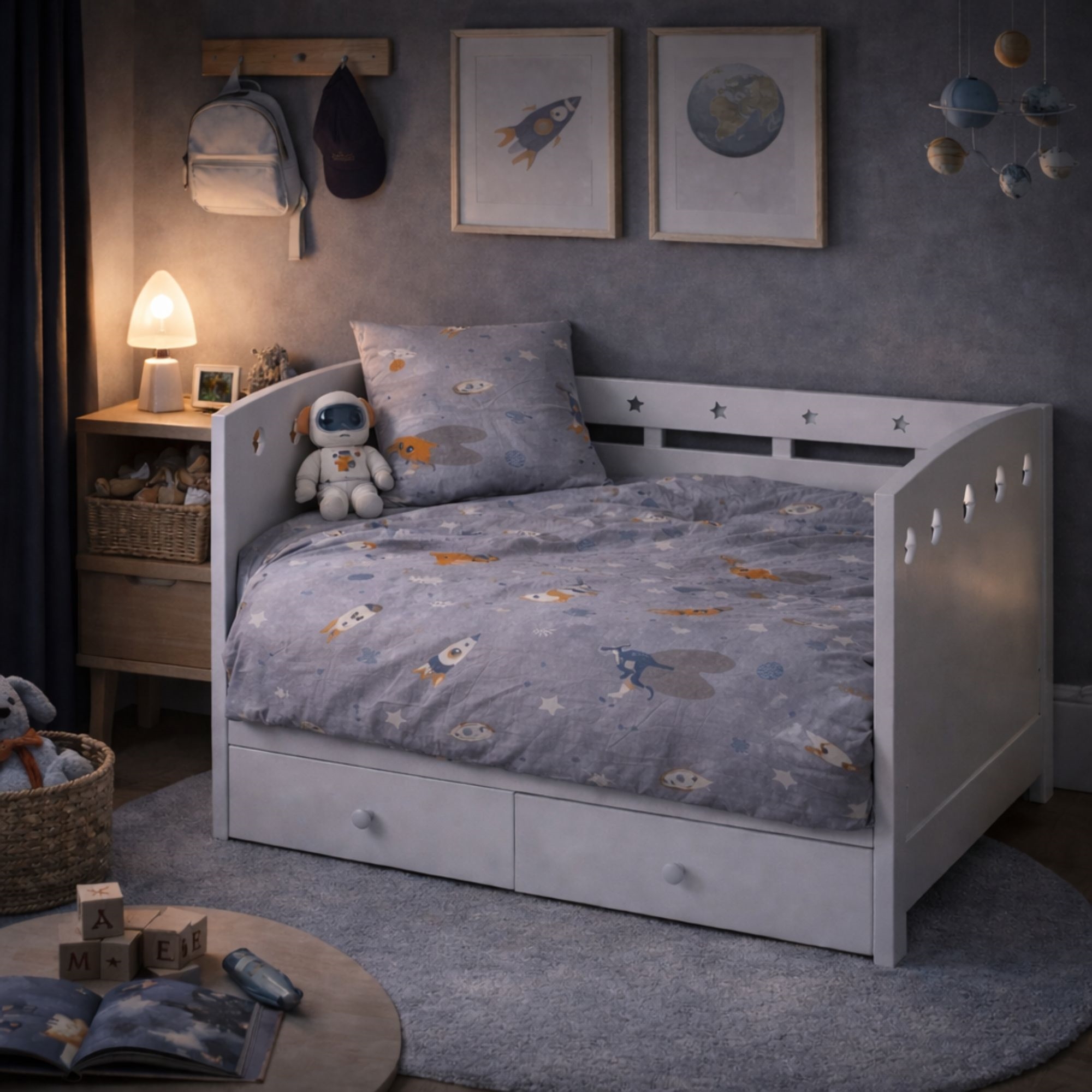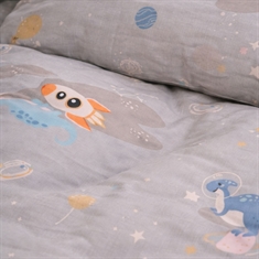 Dette fine junior sengesettet har et tøft og rolig design med små romdinosaurer. Den myke grå bakgrunnen gir sengesettet et naturlig og harmonisk uttrykk som passer perfekt til et koselig barnerom.