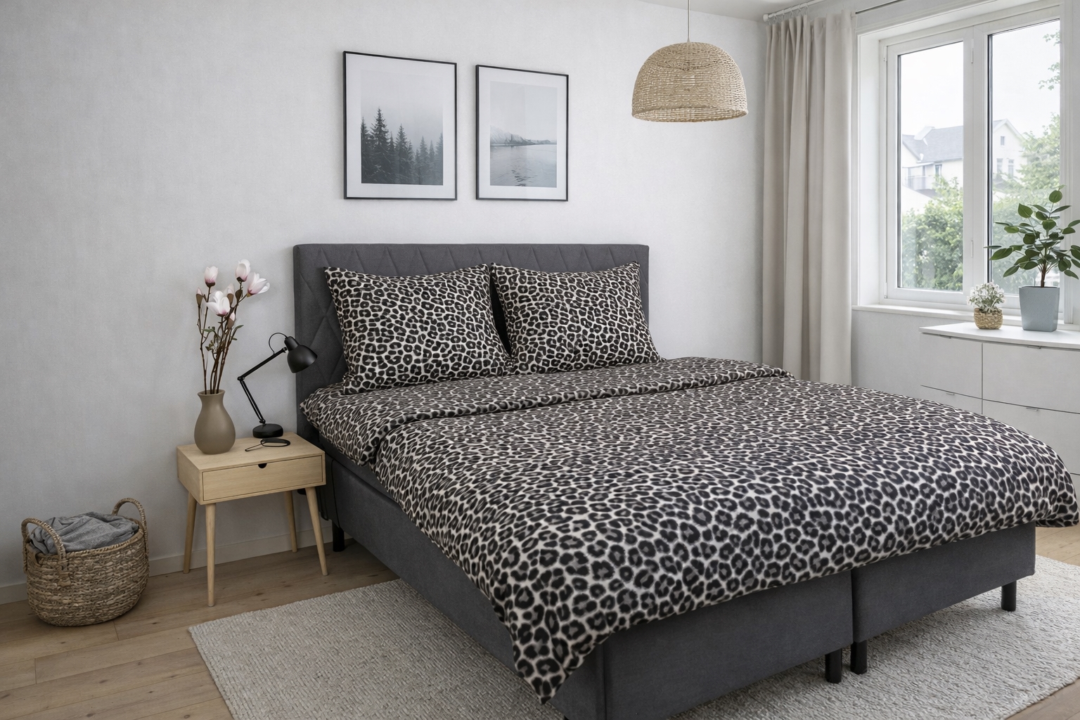 Det trykte leopardmønsteret er påført stoffets overflate og gir et jevnt og pent uttrykk som holder seg godt vask etter vask. Sengetøyet føles mykt mot huden og er velegnet til daglig bruk året rundt.