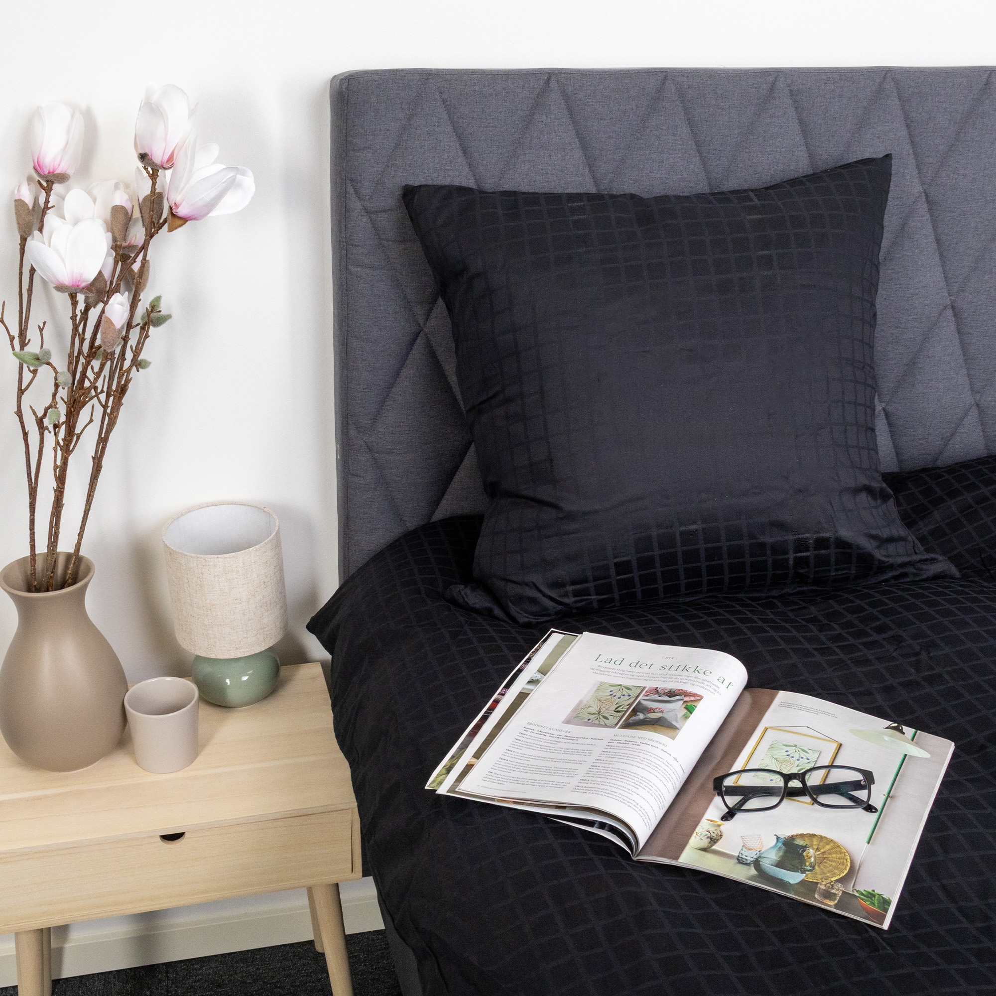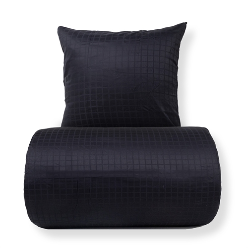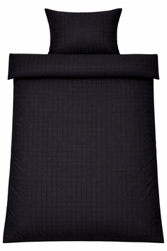 De svarte rutene gir et moderne og sofistikert uttrykk, som passer perfekt inn i både minimalistiske og klassiske soverom. Dynetrekk og putetrekk lukkes med skjult glidelås, som gir en pen finish og holder dynen sikkert på plass.