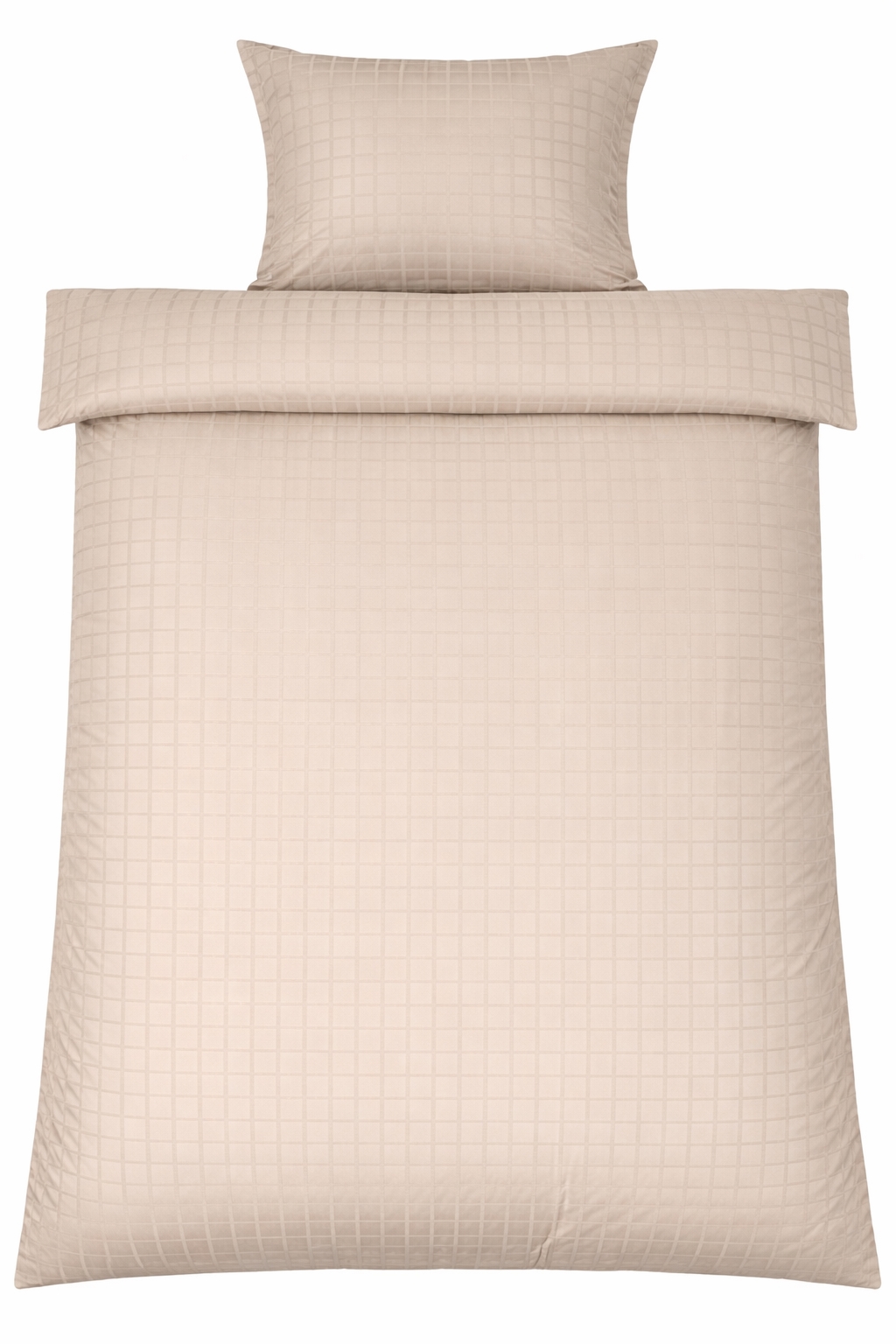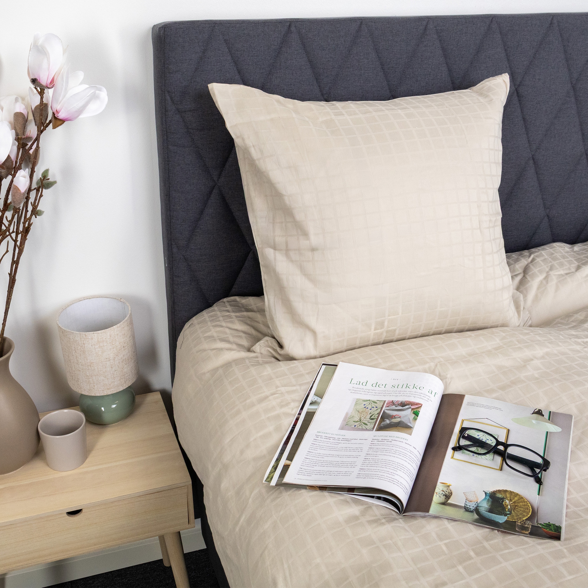 De sandfargede rutene gir et moderne og sofistikert uttrykk som passer perfekt inn i både minimalistiske og klassiske soverom. Dynetrekk og putetrekk lukkes med skjult glidelås, som gir en pen finish og holder dynen sikkert på plass.