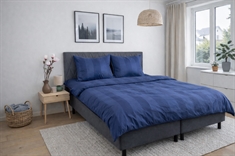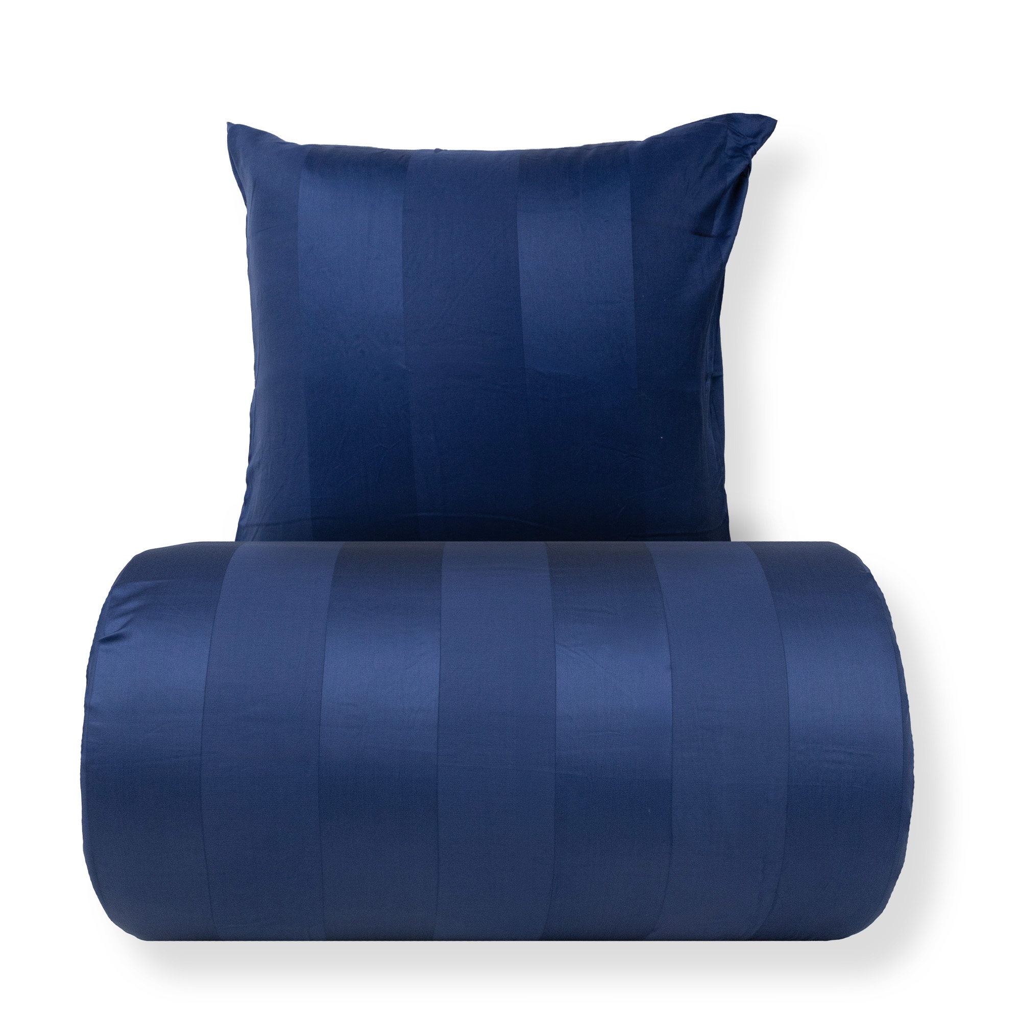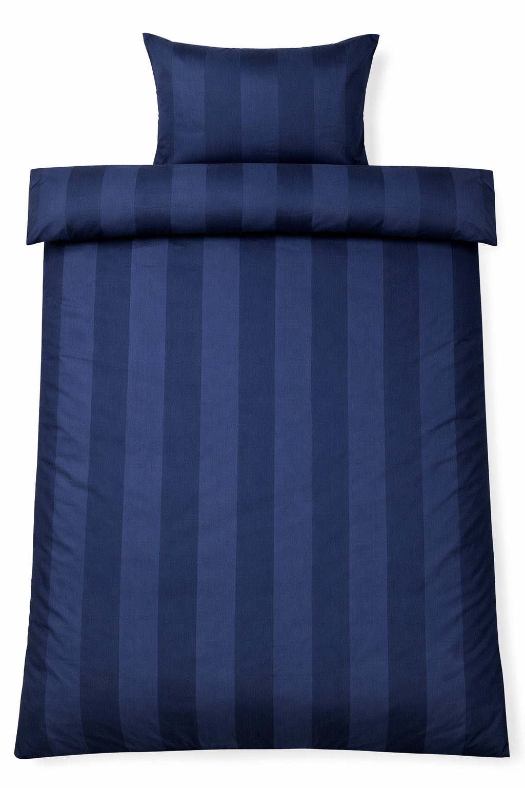 Skap en eksklusiv hotellstemning i soverommet med dette blå stripete sengetøyet til dobbeldyner i 100 % bomullssateng. Det elegante designet med brede jacquardvevde striper kombinerer tidløs minimalisme med luksuriøs komfort og er perfekt for deg som ønsker et stilrent og innbydende sovemiljø.