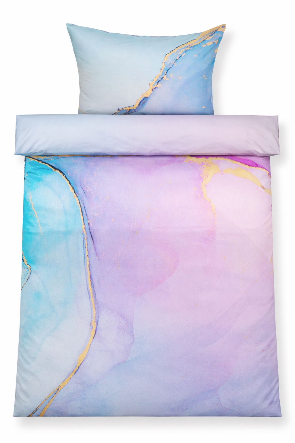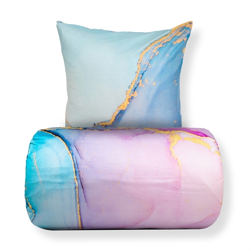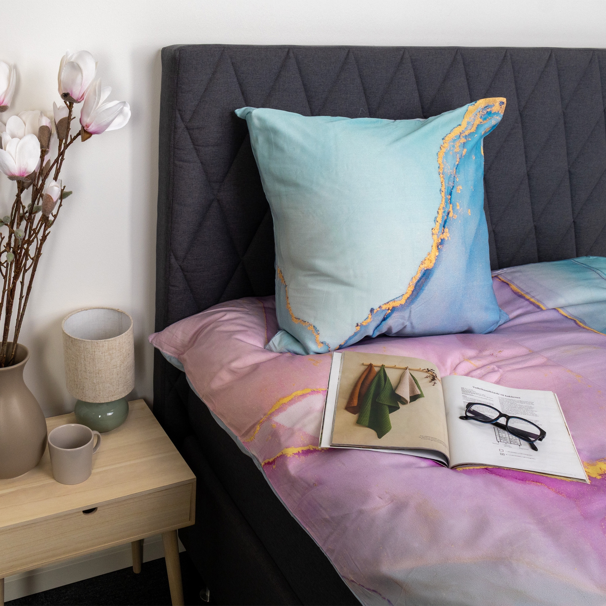 Gi soverommet et elegant og moderne uttrykk med dette bomullssatin sengetøyet til dobbeldyner i blått og rosa marmorlignende look. Det detaljerte marmor digitalprintet skaper en eksklusiv 3D-lignende dybde i designet, hvor de fine gyldne linjene og myke fargeovergangene gir et sofistikert og kunstnerisk uttrykk.