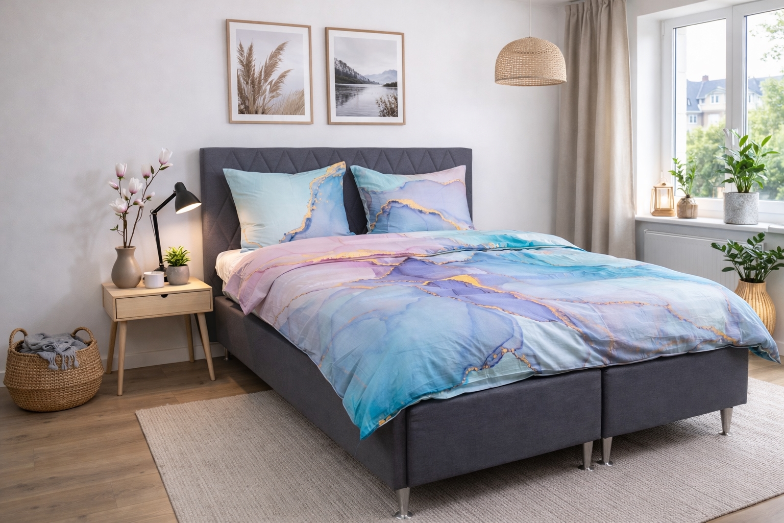 Dobbelt sengetøy i bomullssatin med marmor digitalprint