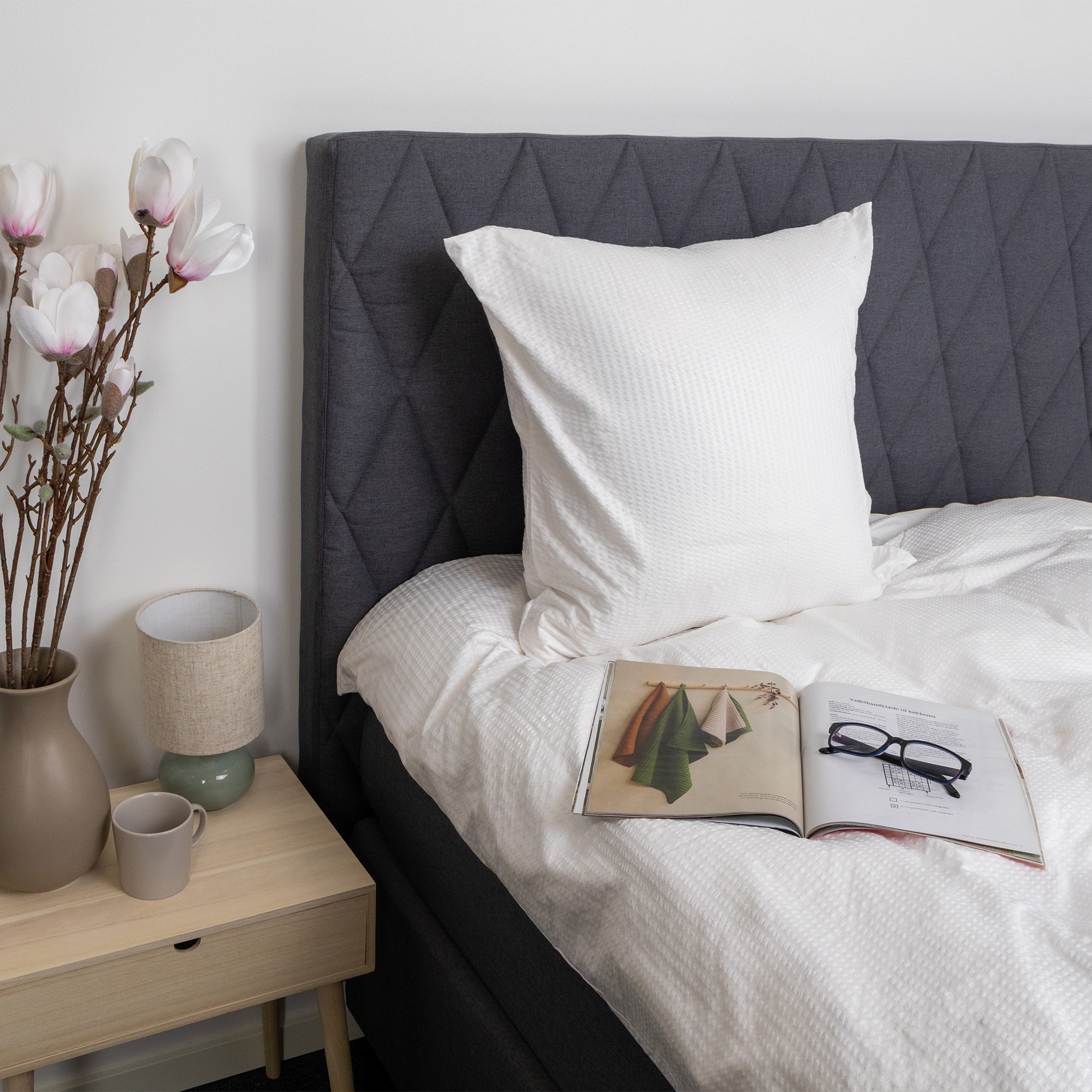 Det ensfargede hvite sengetøyet tilfører soverommet ro og harmoni og er lett å kombinere med både nøytrale og fargerike laken og puter.