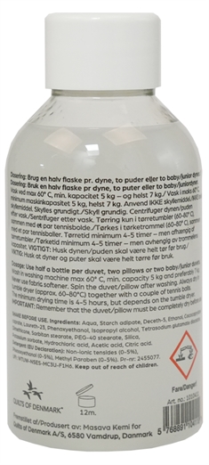 Forside »Dyner » Enkeltdyner » Enkeltdyne 140x200 cm Dunvaskemiddel for dyner og puter Spar8% Norvigroup 129,00119,00NOKSpar 10,- På lager Trustpilot Antall Legg i kurv Se mer fra: Norvigroup Artikkelnummer:39 Les vår dyneguide Les om vedlikehold av dyner og puter Se vårt store utvalg av puter Har du spørsmål om produktet? 100 ml dunsjampoEnzymfritt vaskemiddelParfymefri Type: Enzymfritt vaskemiddel - dunsjampo Innhold: 100 ml Bruk: Kan brukes til alle produkter som må vaskes skånsomt og/eller med enzymfritt vaskemiddel. Dosering: 50 ml per dyne, to puter eller to baby/junior dyner. Produsert i: Danmark Merke: Quilt of Denmark Vask av dundyner og puter: Alle dunprodukter kan vaskes på 60 grader i en vanlig vaskemaskin. Etter vask er det viktig at dynen eller puten tørkes grundig i en tørketrommel, hvor det legges 2-3 tennisballer samtidig. Tennisballene sørger for at sammenfiltrete dunballer, som kan ha dannet seg under vask, løsner og fluffes opp under tørkeprosessen. Vi anbefaler at du vasker puten 1-2 ganger i året, og dynen én gang i året, ved bytte mellom sommerdyne og vinterdyne. Vask av dunprodukter for allergikere: Samme prosess som beskrevet ovenfor, men oftere hvis du vil unngå husstøvmidd i sengen. European Down and Feather Association (EDFA) anbefaler å vaske dyner fire ganger i året og puter tolv ganger i året. Les mer om vedlikehold av dyne og pute Løpende vedlikehold: Med noen enkle huskeregler kan du forlenge dynens levetid. Når du våkner om morgenen, er det fortsatt fuktighet igjen i dynen/puten. La dem "dampe av" før du legger sengeteppet på Luft dynen og puten regelmessig - unngå å støvsuge eller banke dem Vask dynen (eller 2 hodeputer) alene i en vaskemaskin med en minimumskapasitet på 5 kg og helst 7 kg Hvis dynen eller puten din trenger flekkrengjøring, bruk en hardt oppvridd svamp Bruk et av dunvaskemidlene som finnes på markedet, f.eks. Quilts of Denmarks spesialutviklede "DUNVASKEMIDDEL" Bruk alltid et vaskemiddel uten enzymer. Vask på et skånsomt program ved 60°C eller et lignende program med høy vannstand og lav trommelrotasjon Sentrifuger dynen eller puten etter vask. Velg den mest skånsomme sentrifugeringen Tørking må kun gjøres i en tørketrommel. Temperaturen skal være ca. 60-80°C. Legg noen tennisballer i tørketrommelen sammen med dynen eller puten. Ballene sørger for at fyllet holdes i bevegelse ved tørking, og de gjør tørkingen mer effektiv Tørketiden bør være minimum 3-5 timer, men avhenger av tørketrommelen. Det viktigste er at dynen eller puten må være helt tørr, inkludert dunene inni, ellers 'går de i stykker'. Tilbake til Enkeltdyne 140x200 cm