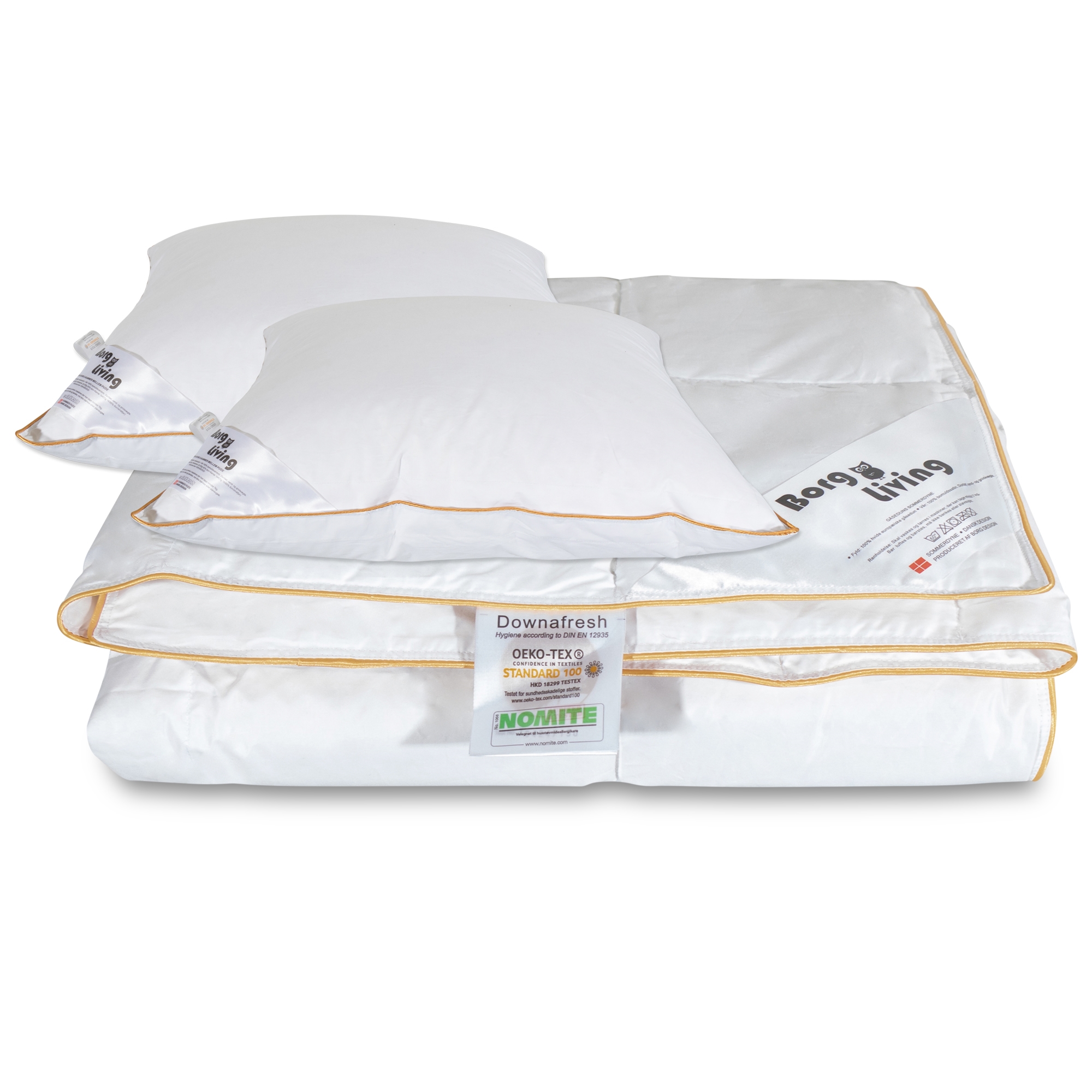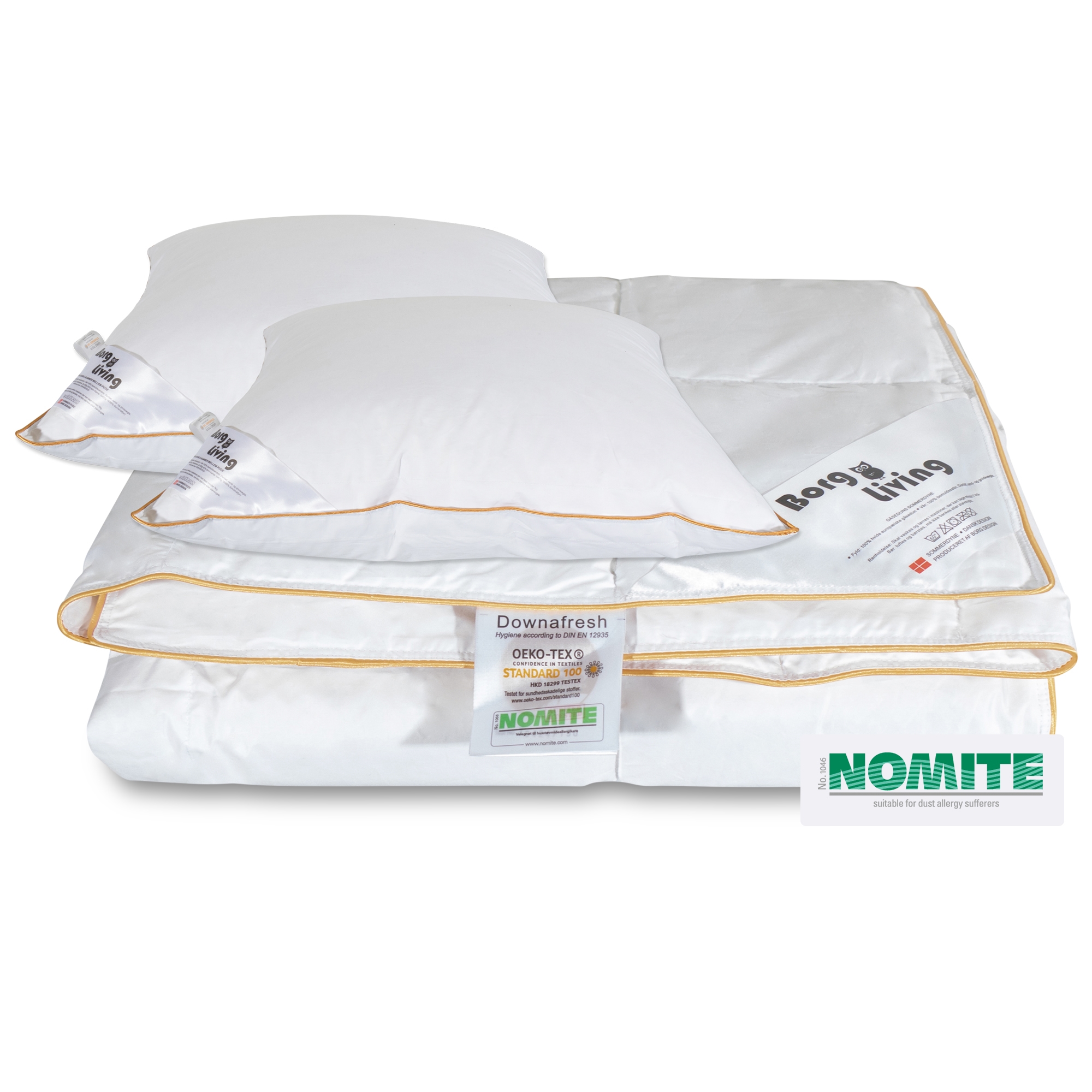 Forside »Dyner » Varmeklasse » Sommerdyner Dyne pute sett - Dobbel sommerdyne - 240x220cm + 2 puter 60x63cm - Gåseduns sommerdyne - Borg Living Spar56% Borg Living 10.399,004.599,00NOKSpar 5.800,- På lager Trustpilot Antall Legg i kurv Se mer fra: Borg Living Artikkelnummer:BL245+2xBL554 Les vår dyneguide Les om vedlikehold av dyner og puter Se vårt store utvalg av puter Har du spørsmål om produktet? Dyne - pute sett240x220 + 2x60x63 cm100% gåsedun sommerdyne Dyne: Størrelse: 240x220 cm Type: Sommerdyne Fyll: 100% nye hvite europeiske gåsedun Merke: Borg Living Fyldningsvekt: 500g Bæreevne: Over 12 (Gammel målemetode) Bæreevne: 800 (Ny målemetode) Bolster: 100% bomullssateng Konstruksjon: 11x12 kassettdyne med gull pipingkant Garanti: 5 år Pute: Størrelse: 60x63 cm x 2 stk Type: Medium hodepute Konstruksjon: 3 kammer gåsedunpute Merke: Borg Living Fyllvekt: 800g Ytre kammer: 2x75g Fyll i kjernen: 1x650g - småfjær Bæreevne: Over 10 (Gammel målemetode) 585 (Ny målemetode) Bolster: 100% bomullssateng (ekstra fin og myk) Garanti: 2 år Vask: 60° (Viktig å bruke enzymfritt vaskemiddel) Tørketrommel: Må tørketromles med tørkeballer Sertifisering: STANDARD 100 by OEKO-TEX® (BEHO-062282)/ HKD 18299 TESTEX & (HKX 19275) Sertifisering: NOMITE - Fri for husstøvmidd Sertifisering: DOWNAFRESH - 100% rene dun Sertifisering: Down pass - Høyeste dyreetiske forhold Dynen leveres i bæreveske Se alle våre hodeputer her Dette dyne og pute sett inneholder en deilig sommer dobbeltdyne med 100% myke gåsedun av høyeste kvalitet, samt 2 puter i medium høyde. De myke gåsedunene er kjent for sin høye isolasjonsevne og fine kvalitet. Dynen er en sommerdyne med 500g gåsedun med en bæreevne på over 12. Sommerdynen er laget med kassetter som jevnt fordeler fyllet, og sikrer optimal isolasjon og temperatur over hele dynens overflate. Trekket er sydd av 100 % bomullssateng i tettvevd stoff, noe som sikrer at dynen er duntett og har høy absorberingsevne. Et skikkelig lekkert dobbeltdyne- og putesett til de varme sommernettene + 2 puter. Dyne: Kjølig og luftig sommerdyne med europeisk gåsedun – Perfekt dyne for de varme sommernettene. Er du varm når du sover? Da kan vi anbefale denne sommerdynen fra Borg living. Dynen er fylt med myke, hvite gåsedun. De myke og lette dunene gjør at dynen faller lett rundt kroppen. Dynen er sydd i kassetter, slik at dunet fordeler seg jevnt i dynen. Sommerdynen har et deilig mykt trekk i 100% bomull Cambric som er så tettvevd at støvmidd ikke kan trenge igjennom. Se vårt store utvalg av kingsize sengetøy her Pute: Puten er bygget opp i 3 kamre for å sikre optimal støtte og komfort. Det innerste kammeret skaper støtte og høyde på puten, mens de ytre kamrene sørger for den myke og behagelige puteopplevelsen. Denne serien kommer i 3 høyder, slik at du kan finne den putehøyden som passer deg best. Dette er puten med 'middels høyde' i serien. Denne høyden passer godt for deg som ligger godt på siden, men også ofte våkner på ryggen. Den middels faste gåsedunputen gir deg en behagelig myk pute og god støtte for nakke, hode og kropp under søvnen. Det danske merket Borg Living produserer eksklusive serier av dyner, puter og boligtekstiler til hjemmet ditt. Merket ble etablert i 2013 og er kjent for sin innovasjon innen kvalitet og design. Borg Livings fantastiske produkter bidrar til en optimal og behagelig nattesøvn samtidig som de pynter opp hjemmet ditt med moderne og lekkert boligtilbehør. Tilbake til Sommerdyner Du kan også være interessert i: Vinterdyne 140x200 cm - Moskusdun dyne fra Borg Living med 100 % dunMoskusdundyne - Borg Living Bæreevne: Over 12 100 % moskusdun Veiledende utsalgspris : 3.333,00 Spar : 1.148,00 5.299,00 NOK2.185,00 NOK