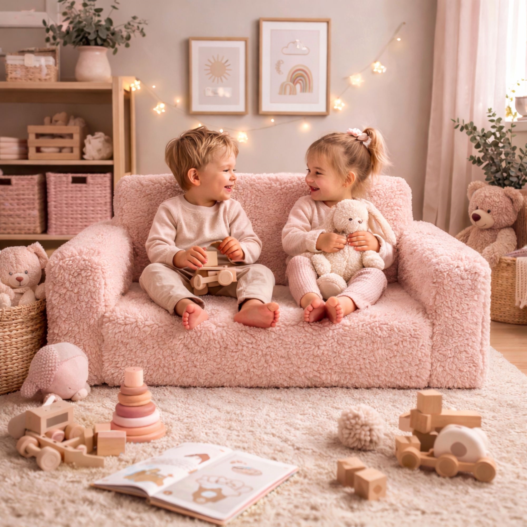 Skap et koselig og funksjonelt hjørne på barnerommet med denne fine foldesofaen i plysj for barn fra Nordstrand Home. Den utrolig myke barnesofaen er laget i et lyserosa plysjtrekk som passer perfekt inn i et nordisk inspirert barnerom eller stue. Her får du en praktisk 2-i-1 løsning som både fungerer som sofa i hverdagen og som utfoldbar madrass når det skal slappes av, leses bok eller tas en liten lur.
