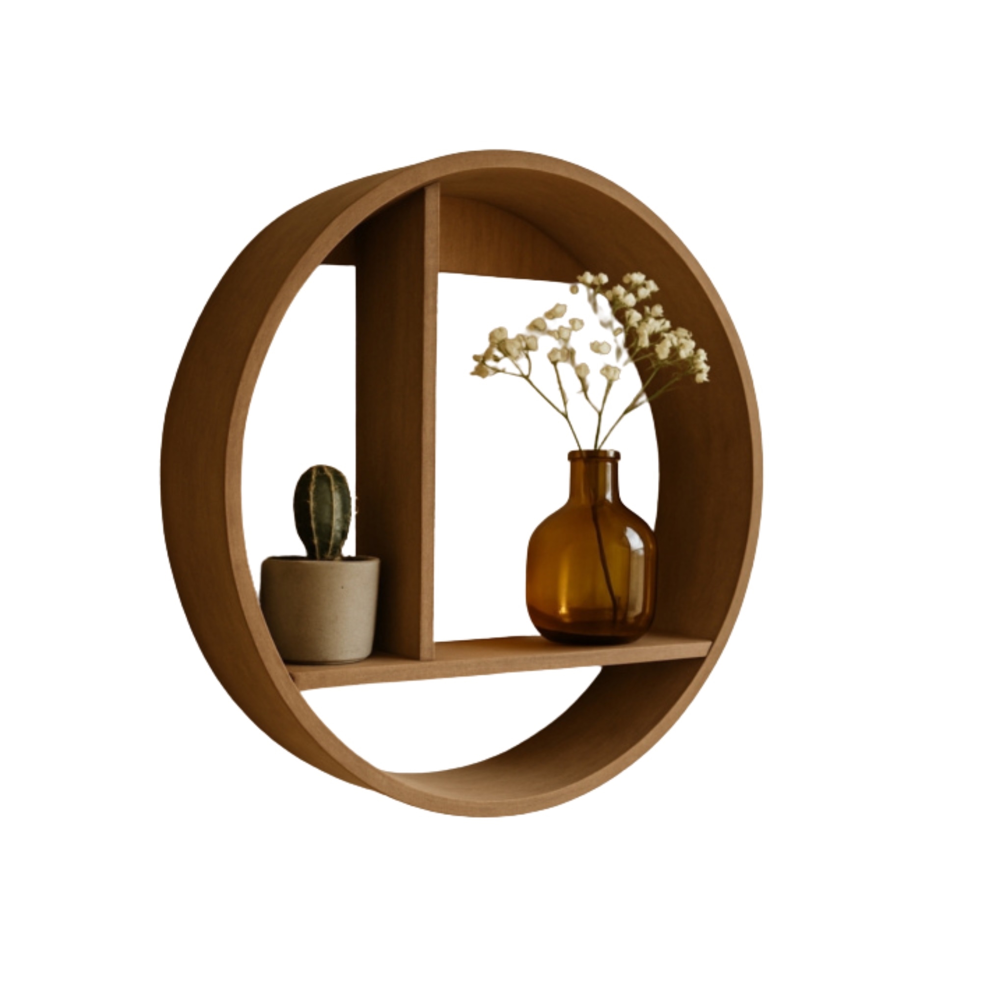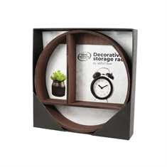 Skap et stilfullt og personlig uttrykk i hjemmet ditt med denne runde vegghyllen i tre. Med sitt moderne og dekorative design er hyllen både praktisk og pen - perfekt for å fremheve dine favoritting.