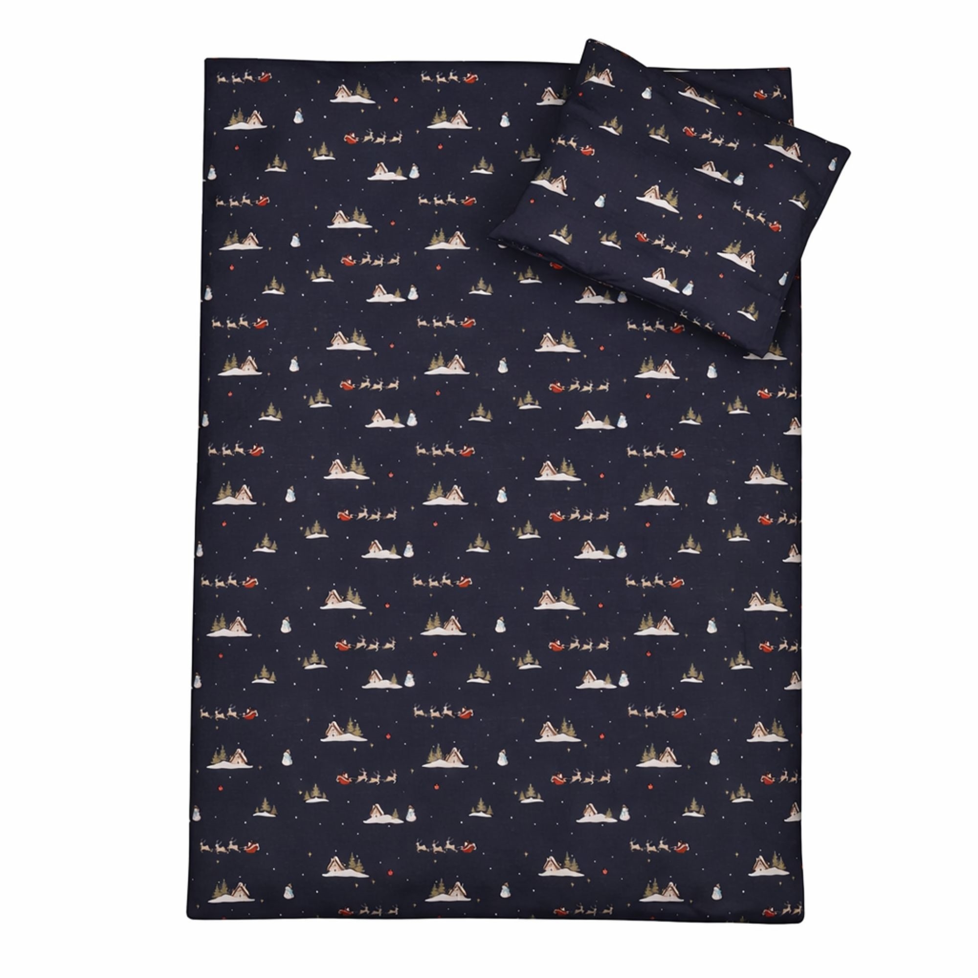Gjør desember ekstra koselig med dette stemningsfulle julesengetøyet fra By Mats i babyens størrelse 70x100 cm. Det mørkeblå designet med julenisse, reinsdyr og små vintermotiver skaper en magisk julestemning på barnerommet og gjør leggetid i sprinkelsengen ekstra trygg og koselig i juletiden.