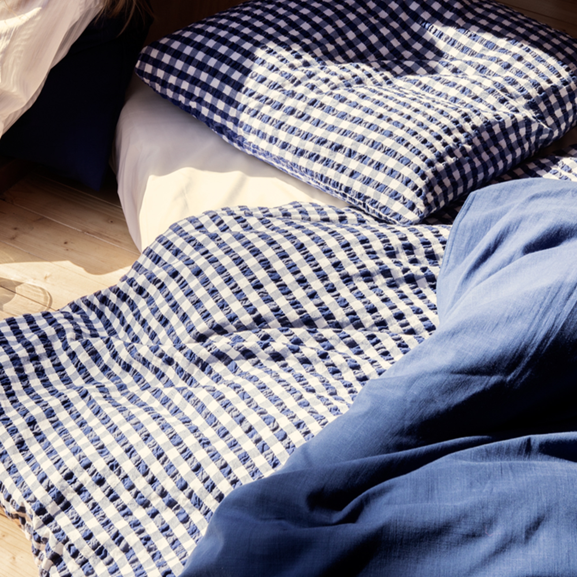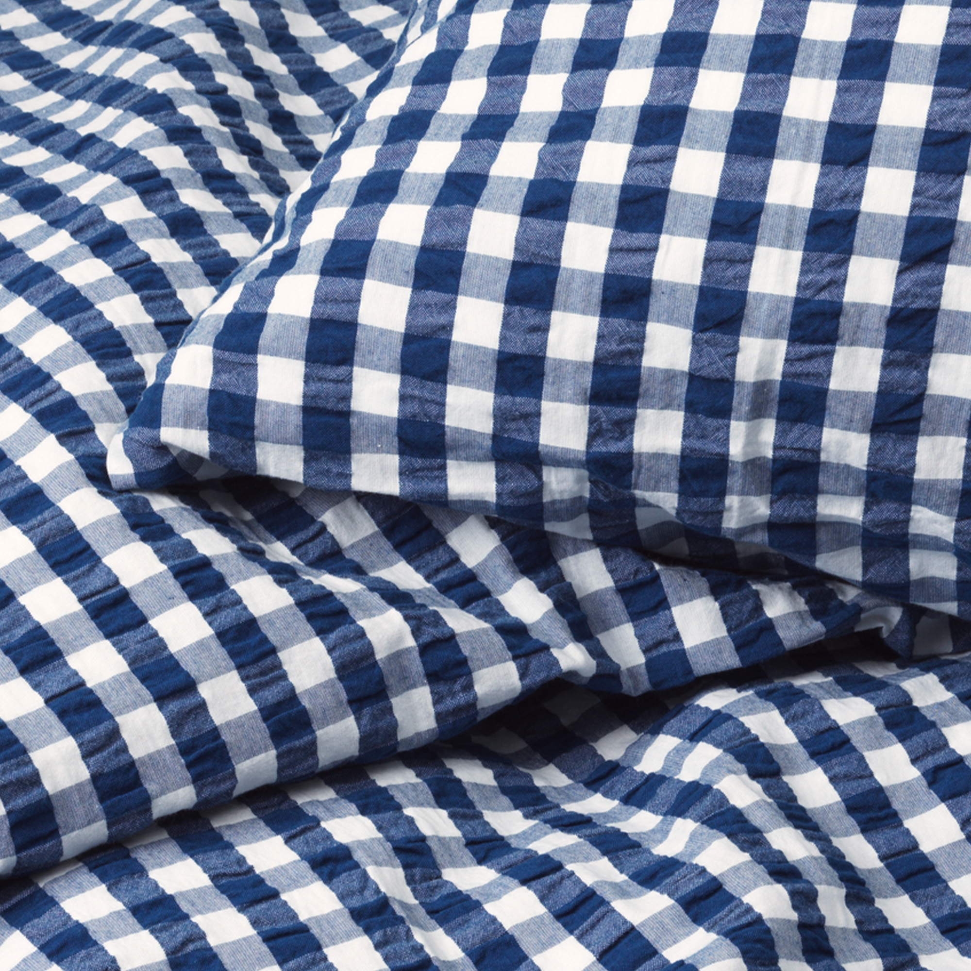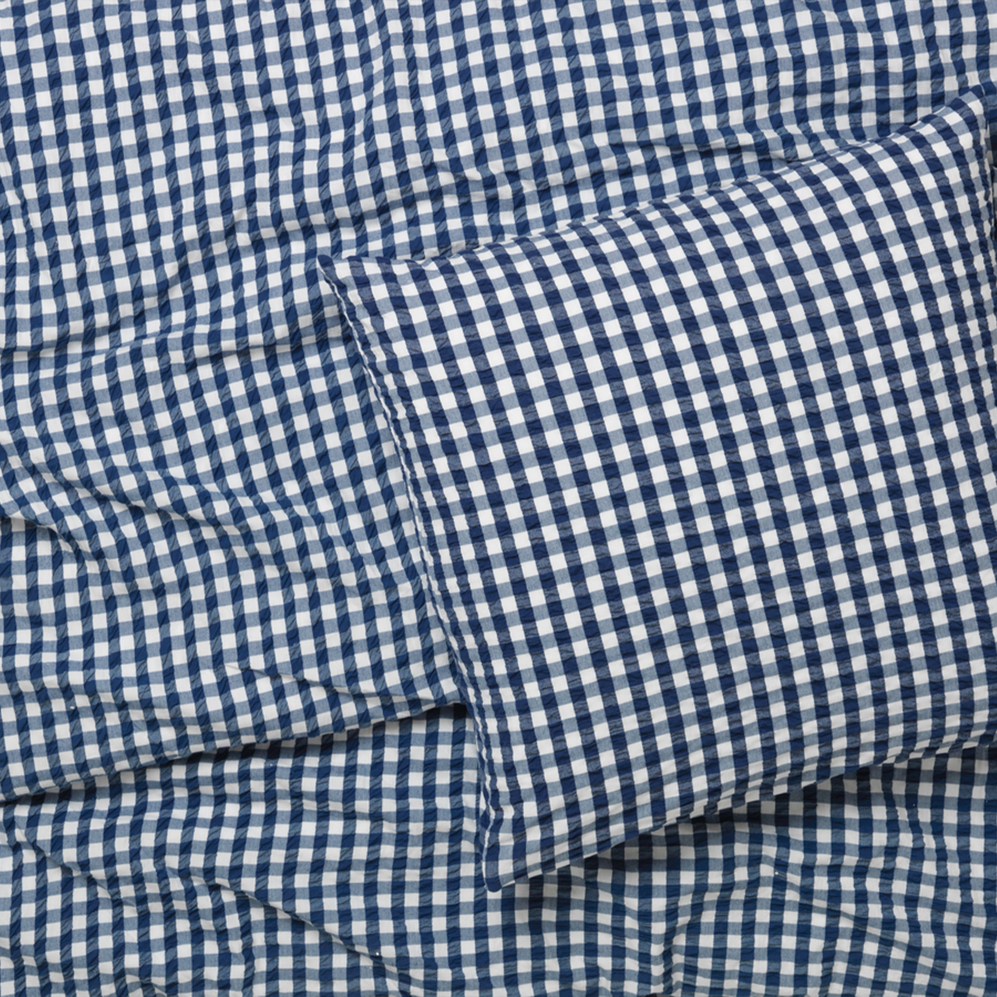 Den myke bomullen kombinert med den krøllede strukturen gir en unik følelse av luksus. Samtidig er sengetøyet praktisk i hverdagen, da det ikke krever stryking og holder sitt flotte uttrykk vask etter vask. De fine rutene i mørkeblå gir et rolig og stilrent uttrykk som passer inn i både moderne og klassiske soverom.