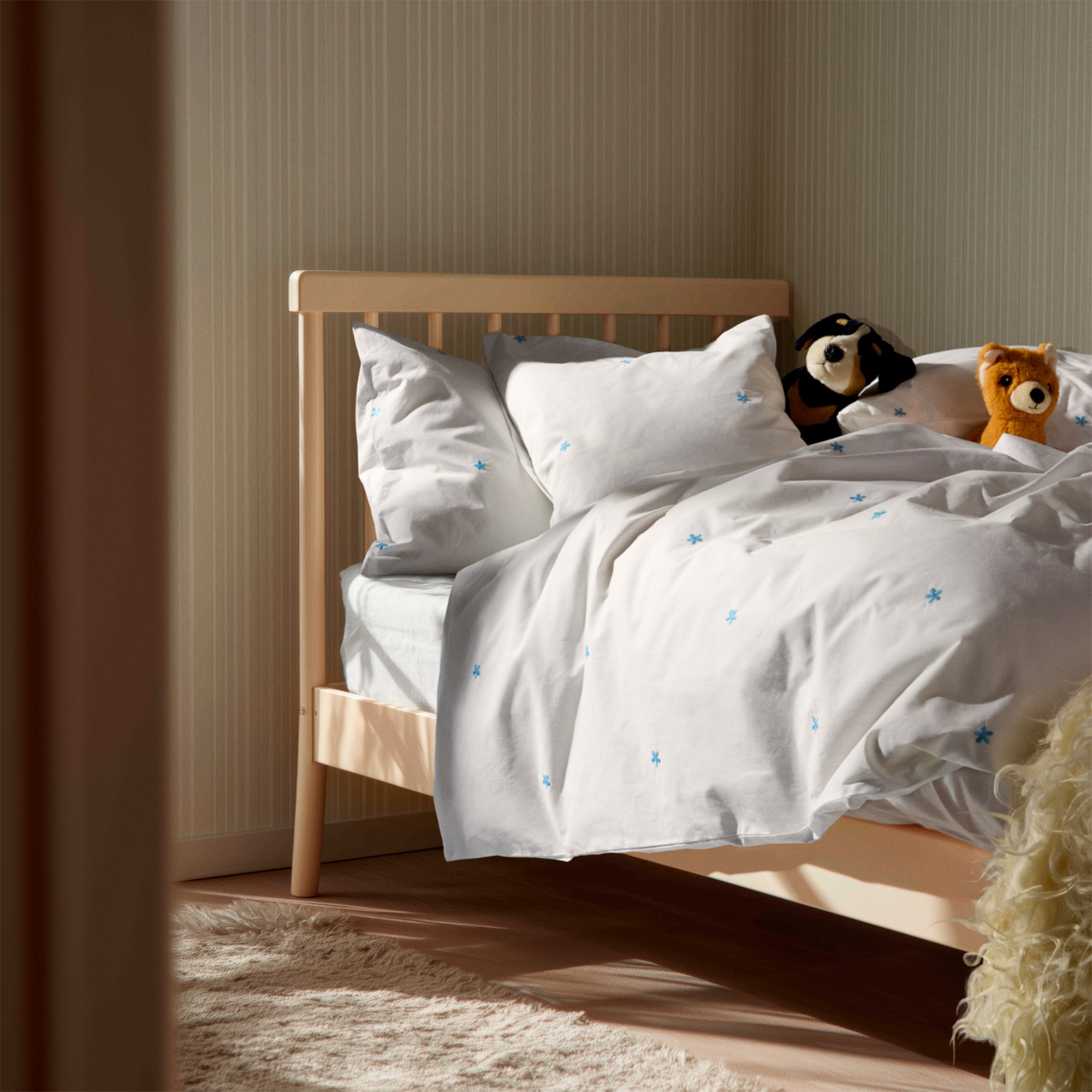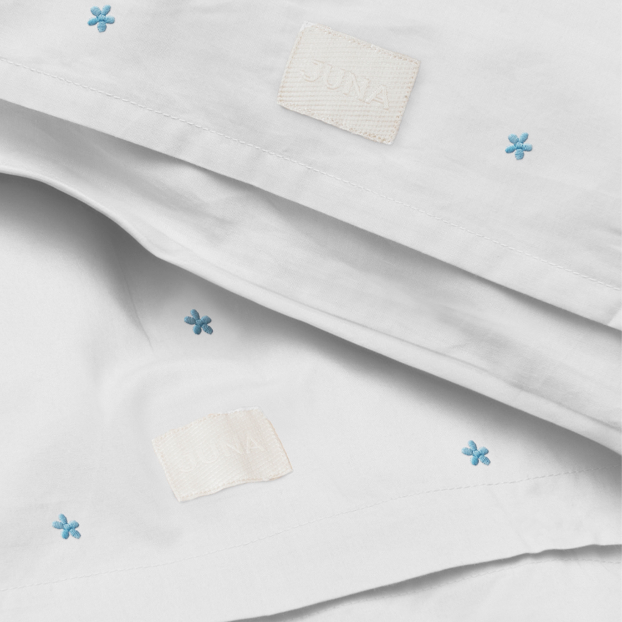 Forside »Sengetøy » Sengetøy til barn » Junior sengetøy 100x140 cm JUNA sengetøy - 100% økologisk bomull - Daisy junior sengetøy 100x140 cm - Hvit med broderte blomster JUNA Knallpris:749,00NOK På lager Trustpilot Antall Legg i kurv Se mer fra: JUNA Artikkelnummer:646618-8 Les vår sengetøyguide Se vårt store utvalg av laken Se vårt store utvalg av dyner 100x140 Har du spørsmål om produktet? Pustende materiale som sikrer god komfortSengetøyet er perfekt for barn med sensitiv hudSlitesterk kvalitet som holder seg flott vask etter vask Dynetrekk: 100x140 cm - junior sengetøysett Putetrekk: 40x45 cm Materiale: 100% økologisk bomull Farge: Hvit Design: Broderte blå blomster Serie: Daisy Merke: Rosendahl - JUNA Lukking: Dyne- og putetrekk med glidelås Vask: 60° Tørketrommel: Ja Tåler stryking: Ja Sertifisering: STANDARD 100 by OEKO-TEX®. Din garanti for at produktet er fritt for helseskadelig kjemi. Sertifisering: GOTS-sertifisert (GOTS Organic Certified by CU1026087). Din garanti for økologisk tekstilproduksjon med fokus på miljø, ansvarlighet og frihet fra skadelig kjemi gjennom hele produksjonsprosessen. Juniorsengetøy 100x140 cm - Daisy fra JUNA Skap en trygg og drømmende nattesøvn med dette vakre juniorsengetøyet fra JUNA Daisy-serien. Det klassiske hvite designet med broderte blå blomster gir et tidløst og rolig uttrykk. Sengetøysettet er laget i 100% økologisk bomull i en eksklusiv percaleveving, som sikrer en myk, glatt og pustende kvalitet. Den fine percalevevingen gir en lett og behagelig tekstur, samtidig som materialet er slitesterkt og holder seg flott vask etter vask. De små broderte blomstene skaper et koselig og lekent uttrykk som passer perfekt inn i både moderne og klassiske barnerom. Sengetøyet er både GOTS-sertifisert og OEKO-TEX®-sertifisert, noe som sikrer at det er fremstilt med fokus på miljø, ansvarlighet og uten skadelige kjemikalier. Se alt junior sengetøy her JUNA - Rosendahl JUNA er en del av Rosendahl Design Group og representerer boligtekstiler med fokus på både estetikk, kvalitet og ansvarlig produksjon. Merket kombinerer klassisk skandinavisk design med moderne trender og skaper tekstiler som tilfører personlighet og varme i hjemmet. JUNA er spesielt kjent for sitt fargerike og lekne univers, hvor mønstre, striper og grafiske uttrykk går hånd i hånd med myke materialer og høy komfort. Med et sterkt fokus på miljøet bruker JUNA sertifiserte materialer og ansvarlige produksjonsmetoder, slik at du kan velge tekstiler med omtanke. Se hele utvalget fra Juna her Tilbake til Junior sengetøy 100x140 cm