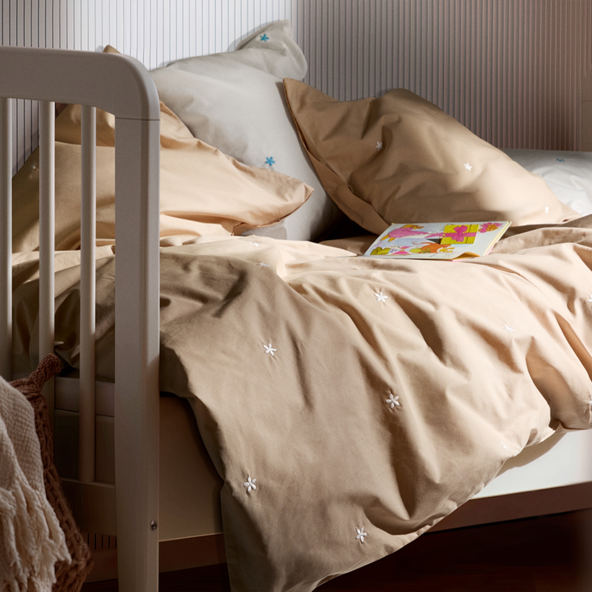 Forside »Sengetøy » Sengetøy til barn » Junior sengetøy 100x140 cm JUNA sengetøy - 100 % økologisk bomull - Daisy juniorsengetøy 100x140 cm - Sand med broderte blomster JUNA Knallpris:749,00NOK På lager Trustpilot Antall Legg i kurv Se mer fra: JUNA Artikkelnummer:646625-8 Les vår sengetøyguide Se vårt store utvalg av laken Se vårt store utvalg av dyner 100x140 Har du spørsmål om produktet? Pustende materiale som sikrer god komfortSengetøyet er perfekt for barn med sensitiv hudSlitesterk kvalitet som holder seg fin vask etter vask Dynetrekk: 100x140 cm - juniorsengesett Putetrekk: 40x45 cm Materiale: 100 % økologisk bomull Farge: Sand Design: Broderte hvite blomster Serie: Daisy Merke: Rosendahl - JUNA Lukning: Dyne- og putetrekk med glidelås Vask: 60° Tørketrommel: Ja Tåler stryking: Ja Sertifisering: STANDARD 100 by OEKO-TEX®. Din garanti for at produktet er fritt for helseskadelig kjemi. Sertifisering: GOTS-sertifisert (GOTS Organic Certified by CU1026087). Din garanti for økologisk tekstilproduksjon med fokus på miljø, ansvarlighet og frihet fra skadelig kjemi gjennom hele produksjonsprosessen. Juniorsengetøy 100x140 cm - Daisy fra JUNA Skap en trygg og drømmende nattesøvn med dette vakre juniorsengetøyet fra JUNA Daisy-serien. Det klassiske sandfargede designet med broderte hvite blomster gir et tidløst og rolig uttrykk. Sengesettet er fremstilt i 100 % økologisk bomull i en eksklusiv percaleveving, som sikrer en myk, glatt og pustende kvalitet. Den fine percalevevingen gir en lett og behagelig tekstur, samtidig som materialet er slitesterkt og holder seg fint vask etter vask. De små broderte blomstene skaper et koselig og lekent uttrykk som passer perfekt inn i både moderne og klassiske barnerom. Sengetøyet er både GOTS-sertifisert og OEKO-TEX®-sertifisert, noe som sikrer at det er produsert med fokus på miljø, ansvarlighet og uten skadelige kjemikalier. Se alt juniorsengetøy her JUNA - Rosendahl JUNA er en del av Rosendahl Design Group og representerer boligtekstiler med fokus på både estetikk, kvalitet og ansvarlig produksjon. Merket kombinerer klassisk skandinavisk design med samtidige trender og skaper tekstiler som bringer personlighet og varme inn i hjemmet. JUNA er særlig kjent for sitt fargerike og lekne univers, hvor mønstre, striper og grafiske uttrykk går hånd i hånd med myke materialer og høy komfort. Med et sterkt fokus på miljøet bruker JUNA sertifiserte materialer og ansvarlige produksjonsmetoder, slik at du kan velge tekstiler med omtanke. Se hele utvalget fra JUNA her Tilbake til Junior sengetøy 100x140 cm