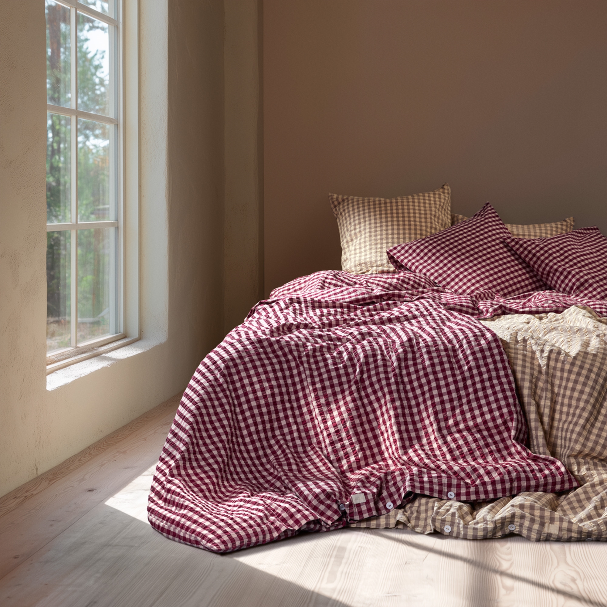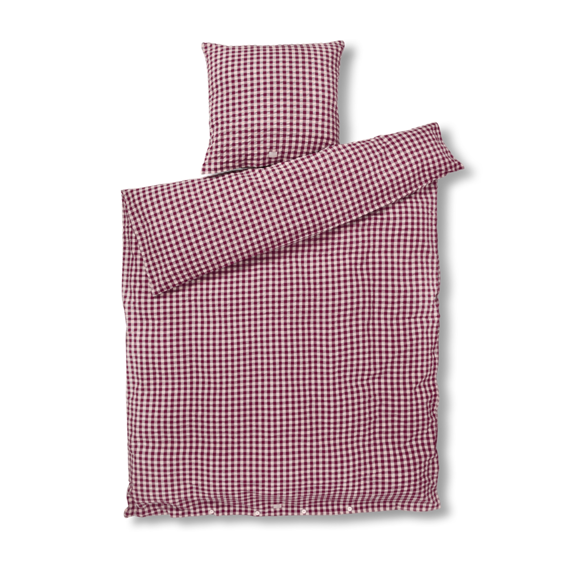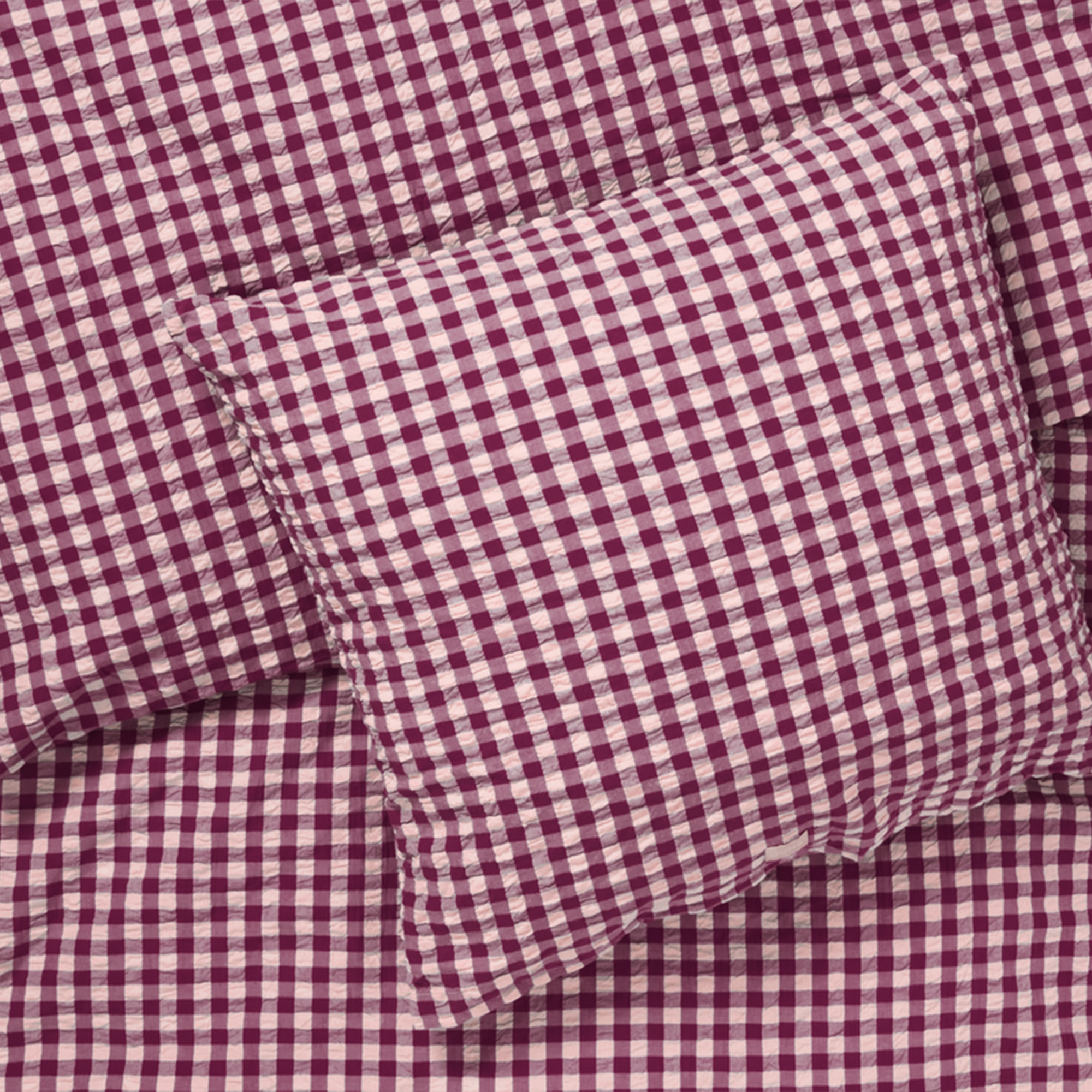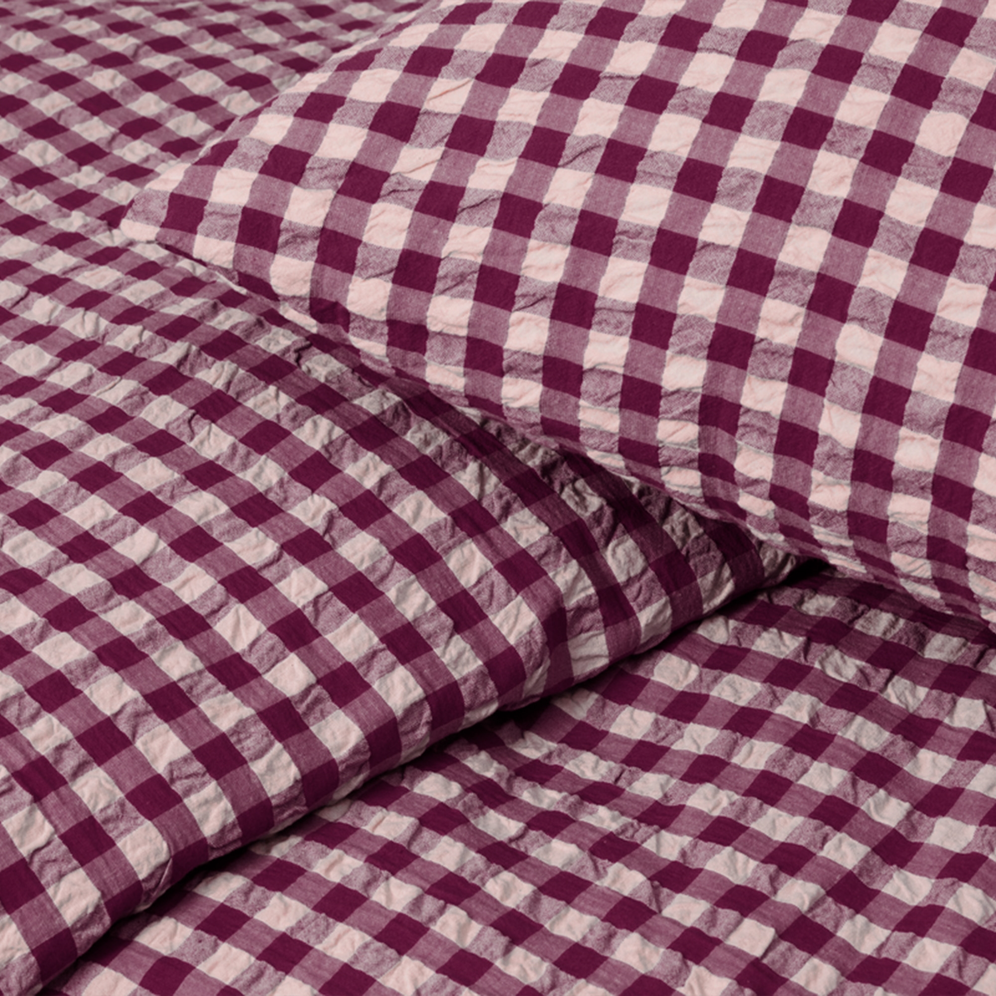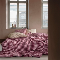Det myke bomullsstoffet kombinert med den rynkete strukturen gir en unik følelse av luksus. Samtidig er sengetøyet praktisk i hverdagen, da det ikke krever stryking og beholder sitt flotte uttrykk vask etter vask. Det fine rutemønsteret i plomme og rosa gir et rolig og stilrent uttrykk som passer både moderne og klassiske soverom.
