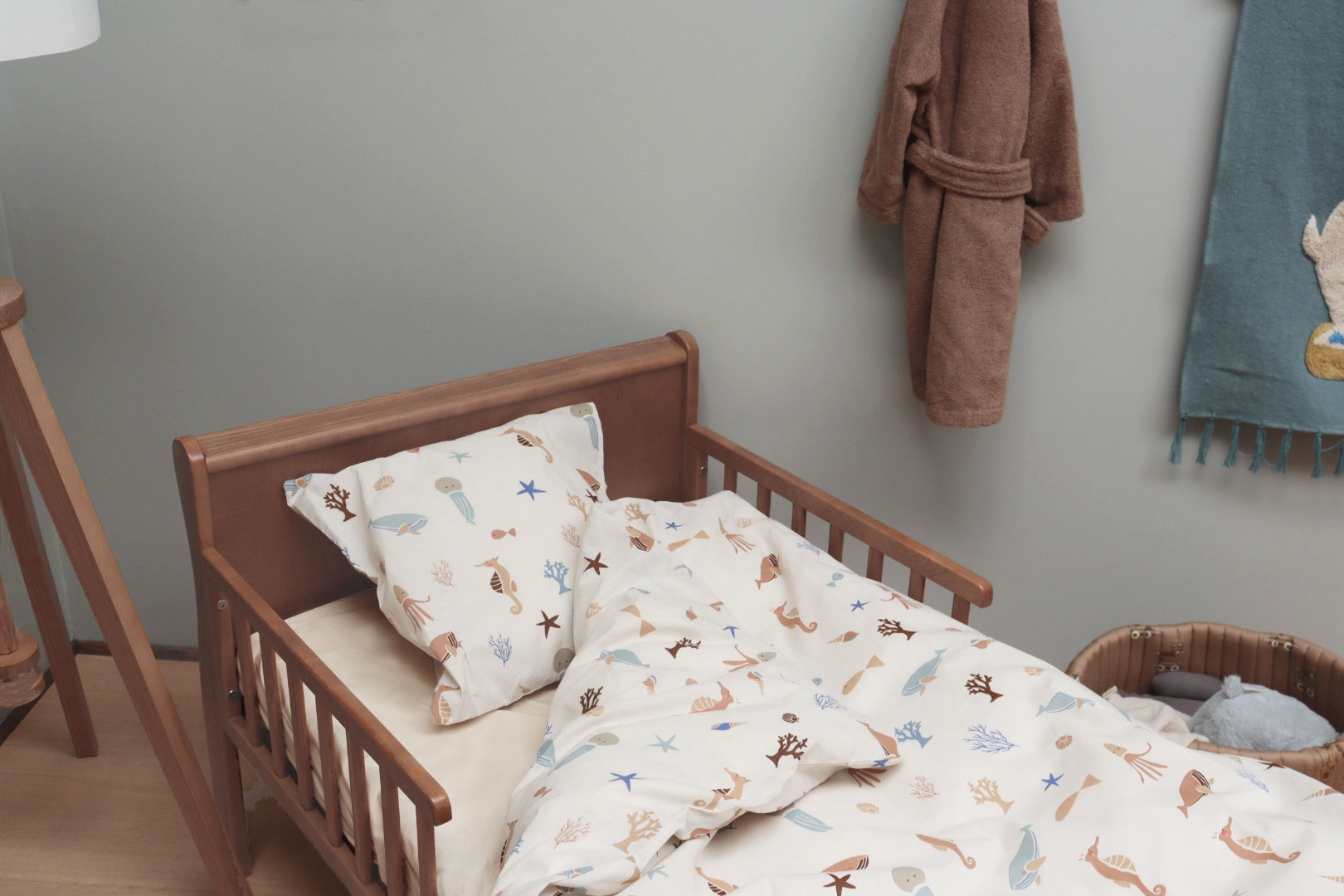 Forside »Sengetøy » Sengetøy til barn » Junior sengetøy 100x140 cm Junior sengetøy 100x140 cm - Hvitt sengesett med undervannsmotiver - 100% mykt bomulls sengetøy Spar34% By Mats 349,00229,00NOKSpar 120,- På lager Trustpilot Antall Legg i kurv Se mer fra: By Mats Artikkelnummer:12118-8 Les vår sengetøyguide Se vårt store utvalg av lagner Se vårt store utvalg av dyner 100x140 Har du spørsmål om produktet? Høy pusteevne100% myk bomullOEKO-TEX® sertifisert Dynetrekk: 100x140 cm - junior sengesett Putetrekk: 40x45 cm Materiale: 100% myk bomull Farge: Hvit Motiv: Undervannsmotiver Lukking: Dyne med knapper og putetrekk med overlapp Vask: 60° Tørketrommel: Ja Tåler stryking: Ja Sertifisering: STANDARD 100 by OEKO-TEX® (2016OK0709 AITEX). Din garanti for at produktet er fritt for helsefarlig kjemi. Mykt junior sengetøy i 100% bomull, med undervannsmotiver. Produsert med lette og pustende bomullstråder som gir sengesettet en følelse av mykhet, som gjør at dynen føles deilig for barnet å sove med. Balansen i naturlige egenskaper og komfort fra det myke materialet, kombinert med det koselige designet, gjør dette settet til en sikker favoritt hos barnet ditt. Flott junior sengesett med et heltrykk av undervannsmotiver, som ikke bare er mykt og behagelig, men også pynter og er dekorativt på barnerommet. Sengsettet er produsert i 100% bomull som gjør settet slitesterkt, mykt og gir høy absorbering samt pusteevne. Den rene bomullskvaliteten gir et lekkert og mykt sengesett, som i tillegg er lett å vedlikeholde og skaper et deilig sovemiljø for barnet ditt. Bomullssengetøy kan vaskes ved 60° i vaskemaskin, noe som også bidrar til å opprettholde et høyt hygienisk nivå. Sengetøyet er i tillegg fremstilt med OEKO-TEX sertifisering, som er din garanti for at settet er fritt for skadelig kjemi. Gå på utkikk etter favorittene og mye mer i vårt store utvalg av tilbehør til barneuniverset For barnet bør sengen være et trygt sted og alle elementene skal sammen skape myke og deilige omgivelser for barnet å finne ro i. Bruk derfor gjerne barnets interesser for å skape et trygt soverom for barnet. Hos oss kan du finne et stort utvalg av tilbehør til sengen og barnerommet, fra laken til dyner, puter, sengetøy og mye mer, og masse produkter med alle barnas favoritter. Alt sammen elementer som kan bidra til å skape det rette sovemiljøet og rommet for barnet ditt. Her kan du finne deilige og myke kvalitetslaken Tilbake til Junior sengetøy 100x140 cm Du kan også være interessert i: Junior sengetøy 100x140 cm - Mykt hvitt sengesett i 100% egyptisk bomullssatin - Turiform sengetøyHøy kvalitet Ekstra fin, myk & pustende Jacquardvevd 799,00 NOK485,00 NOK Formsydd laken 70x140 cm - Hvit - 100% ekstra fin bomullssateng - Formsydd laken til juniormadrassFormsydd laken - Hvit 100% bomullssateng 70x140x15 cm Veiledende utsalgspris : 434,00 Spar : 35,00 599,00 NOK399,00 NOK Madrassbeskytter junior - 70x140 cm - Kokesikker bomull - Borg LivingPustende og allergivennlig Myk bomull OEKO-TEX®-sertifisert Veiledende utsalgspris : 434,00 Spar : 85,00 599,00 NOK349,00 NOK Juniordyne - Moskusdun - 100x140 cm - Helårs juniordyne - Borg Living dundyne100 % moskusdundyne Bæreevne: over 12 Helårsdyne Veiledende utsalgspris : 1.594,00 Spar : 609,00 2.599,00 NOK985,00 NOK