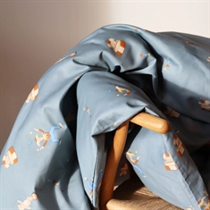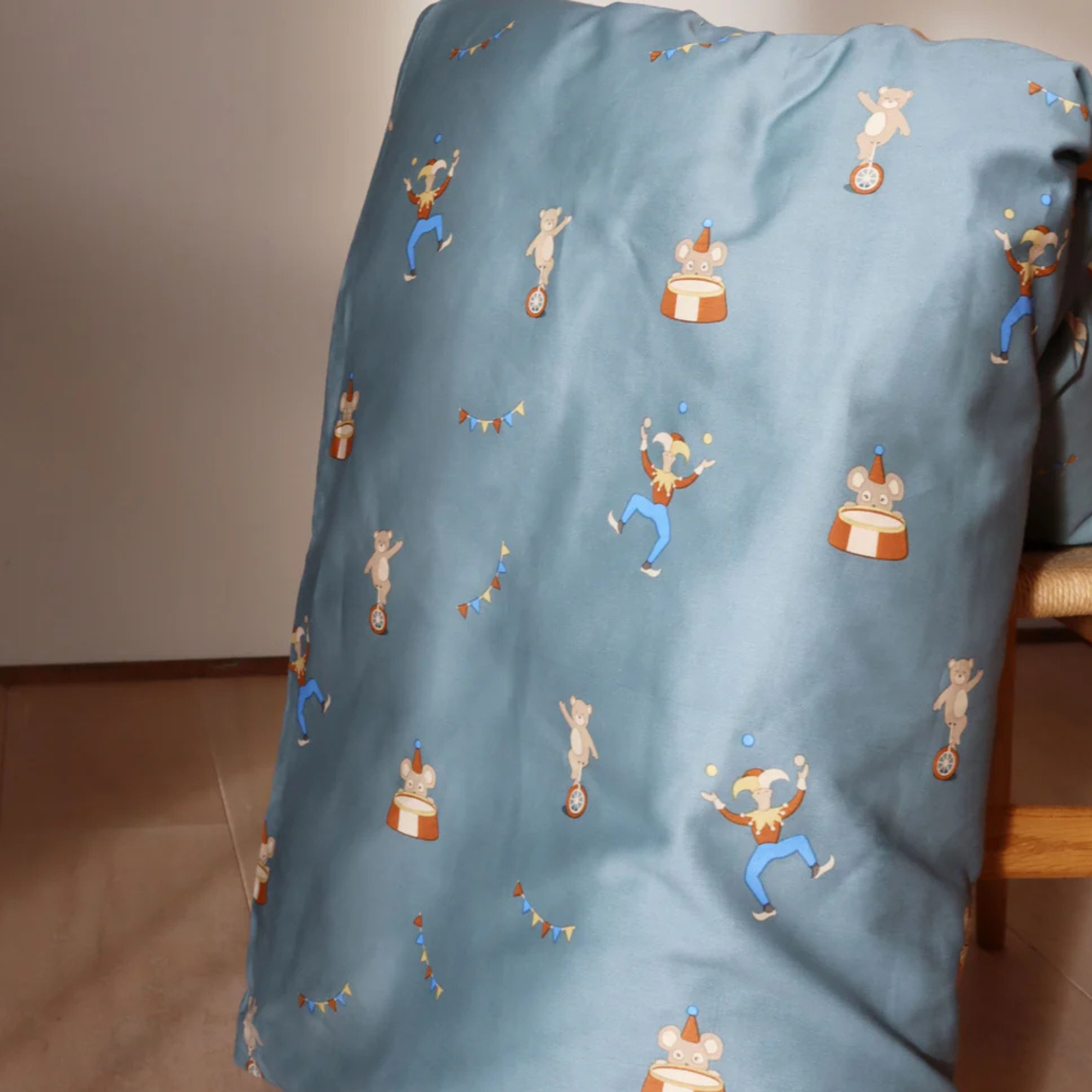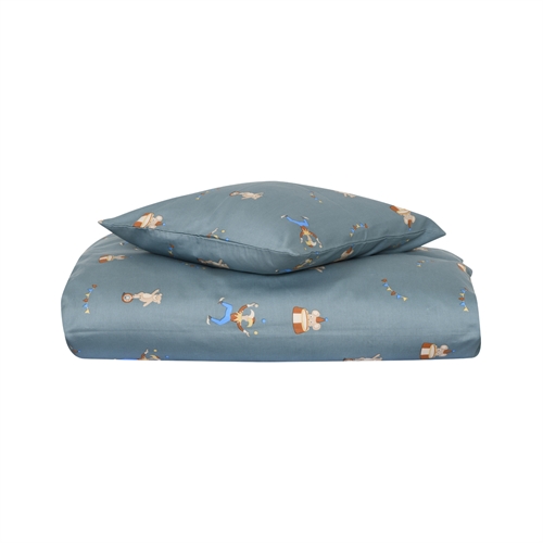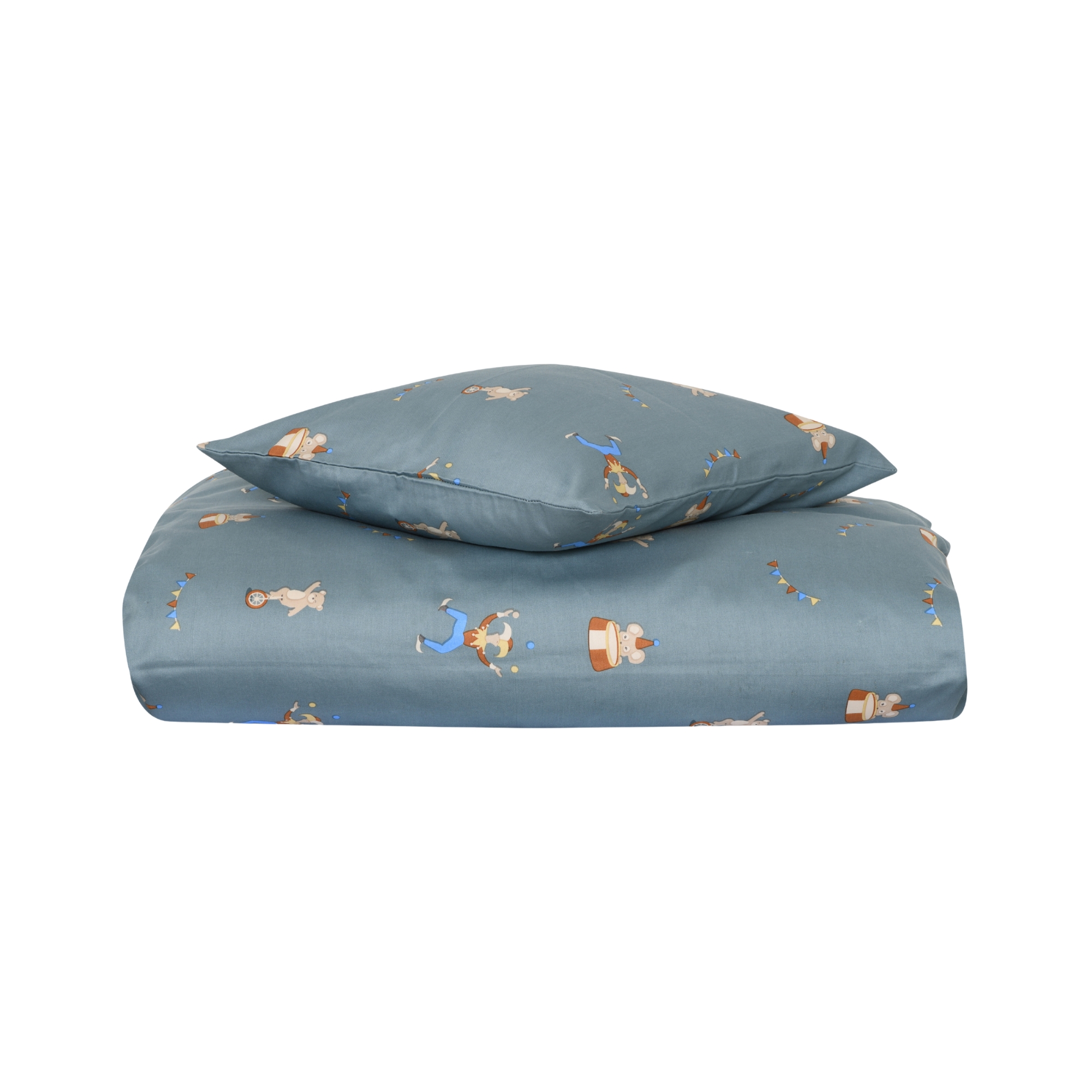 Dette fine junior sengesettet har et hyggelig og fantasifullt design med små lekne figurer inspirert av sirkus og morsomme aktiviteter. Den blå bakgrunnen gir sengetøyet et rolig uttrykk, mens de små illustrasjonene tilfører liv og sjarm til barnerommet.
