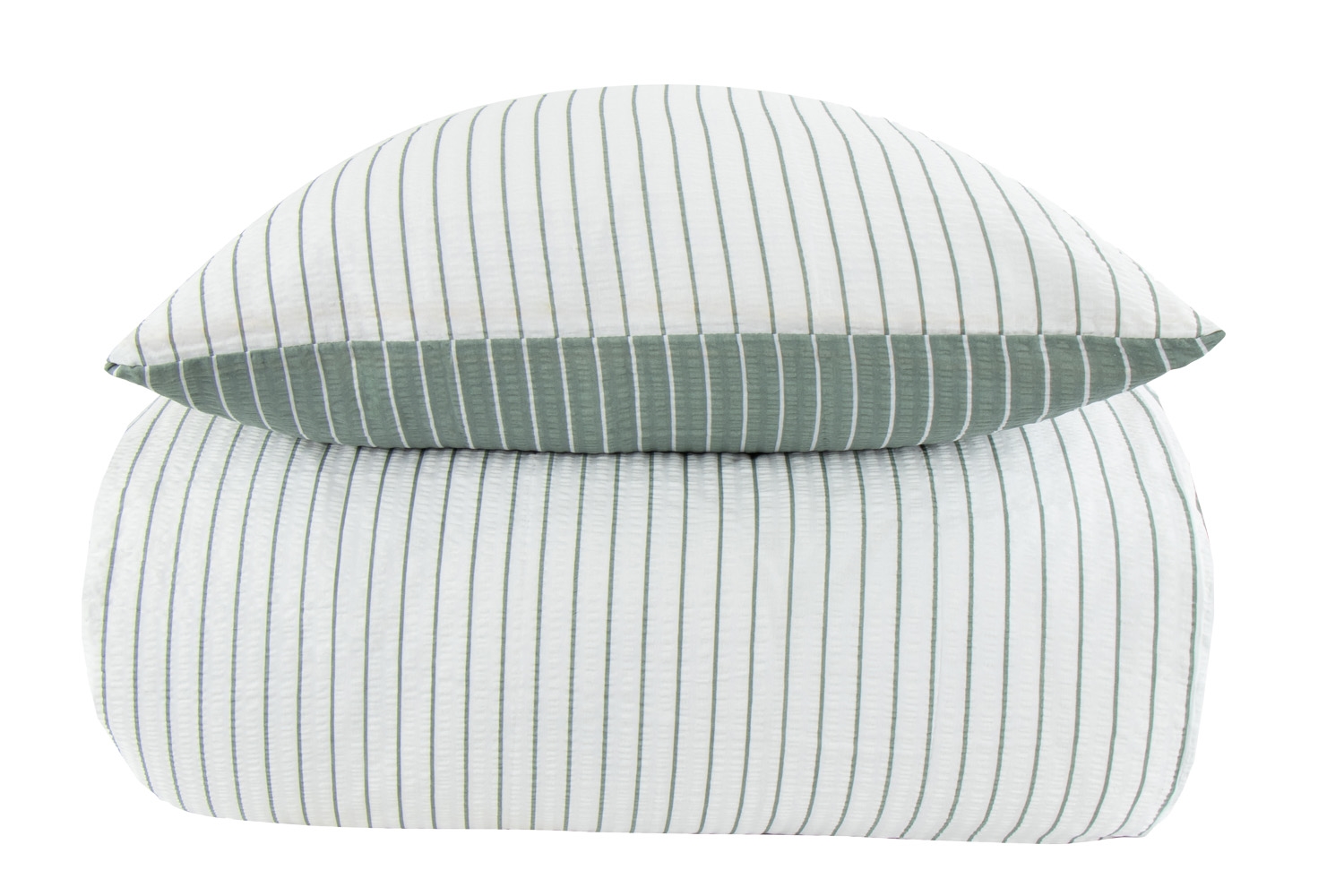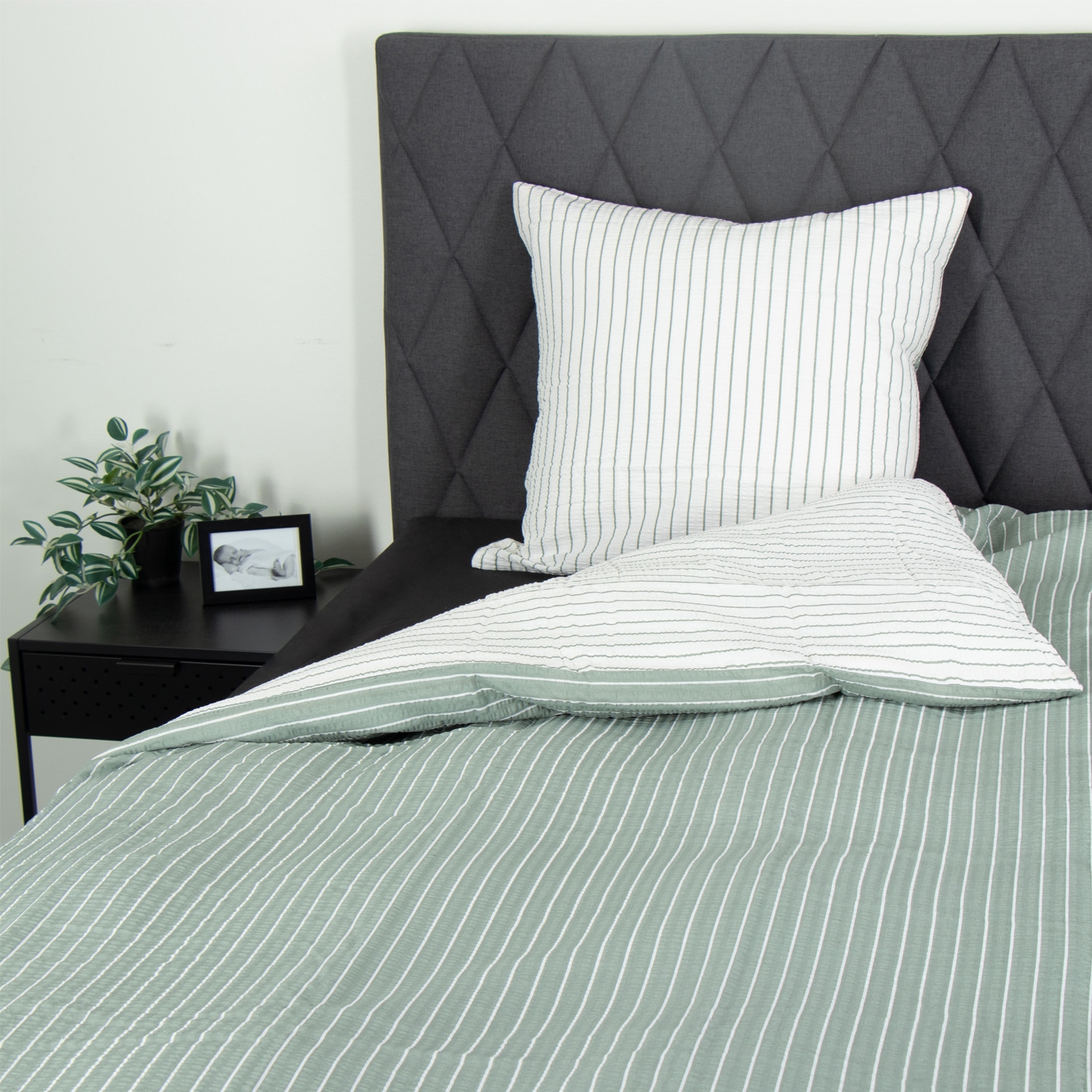 Forside »Sengetøy Kreppsengetøy 150x210 cm - Grønt sengesett med striper i vendbart design - 100% bomull - Krepp sengelinned - By Night Spar38% By Night 799,00499,00NOKSpar 300,- På lager Trustpilot Antall Legg i kurv Se mer fra: By Night Artikkelnummer:264-3 Les vår sengetøysguide Se vårt store utvalg av laken Se vårt store utvalg av dyner 150x210 Har du spørsmål om produktet? 100% pustende bomullLett og luftig vevingStripet design Dynetrekk: 150x210 cm Putetrekk: 1 stk. á 50x60 cm Materiale: 100% bomull Veving: 200 TC - Kreppsengetøy (Thread count = antall tråder pr. kvadrattomme) Farge: Grønn og hvit Design: Vendbar - Striper Merke: By Night Lukking: Dyne- og putetrekk med glidelås Vask: 60° Tørketromling: Ja Tåler stryking: Ja Sertifisering: STANDARD 100 by OEKO-TEX® (2018OK0658). Din garanti for at produktet er fri for helseskadelige stoffer. Luftig sengetøy i deilig myk bomull produsert i den velkjente kreppvevingen. Sengesettet er en lekker kombinasjon av flott stilrent design, moderne farger og deilige kvalitetsmaterialer med høy pusteevne. Sengetøy av denne typen kan brukes av alle, og tilfører en deilig letthet til din dyne og pute. Sengetøyet er produsert av 100% myk bomull med vevemetoden krepp, også kalt bomullskrepp. Denne vevingen gir rynkeeffekten og skaper hulrom til små luftlommer i materialet, som gjør at sengetøyet føles lett, luftig og ofte kjøligere enn andre typer materialer. Om sommeren vil sengetøyet føles luftig, og om vinteren vil du kunne merke varmen fra den myke bomullen, hvilket er en unik fordel som denne skjønne kombinasjonen av materiale og veving gir. Sengesettet bør ikke strykes, da det har sine luftlommer i selve vevingen. Sengetøy med denne vevingstypen er spesielt godt for deg som til tider opplever å ha det varmt om natten, her kan sengetøyet tilføre økt pusteevne og høy absorbering. Sengetøyet fra By Night er fargeekte, hvilket betyr at materialet holder på fargen selv etter gjentatte vask. Kjøp lett putetrekk til dine ekstra puter her Frisk opp sengen og soverommet med et flott og lekkert sengesett som dette. Benytt samtidig muligheten for å sikre deg en økt sovekomfort, ved å tilføre et nytt mykt laken av høy kvalitet. Du finner vårt store sortiment av kvalitetslaken her By Night er kjennetegnet av dansk design - de gir deg behagelige sovekomponenter til ditt nattmiljø i aller høyeste kvalitet. By Night produserer sengetøy og laken til hele familien og legger stor vekt på tidens trender, slik at produksjonen alltid innebærer moteriktige farger og design. Tilbake til Sengetøy