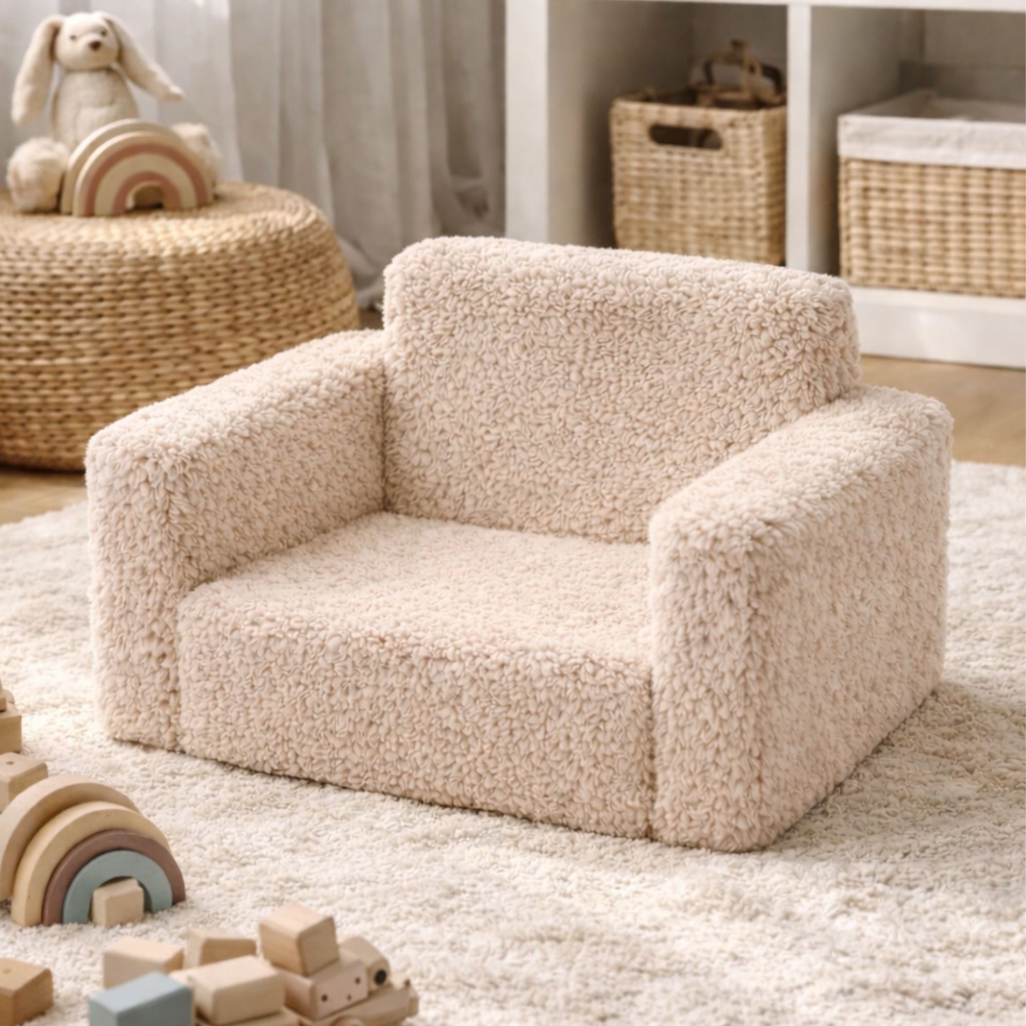 Det nøytrale sandfargede plysdesignet gir stolen et nordisk og tidløst uttrykk som passer naturlig inn i moderne interiør - både på barnerommet og i stuen.