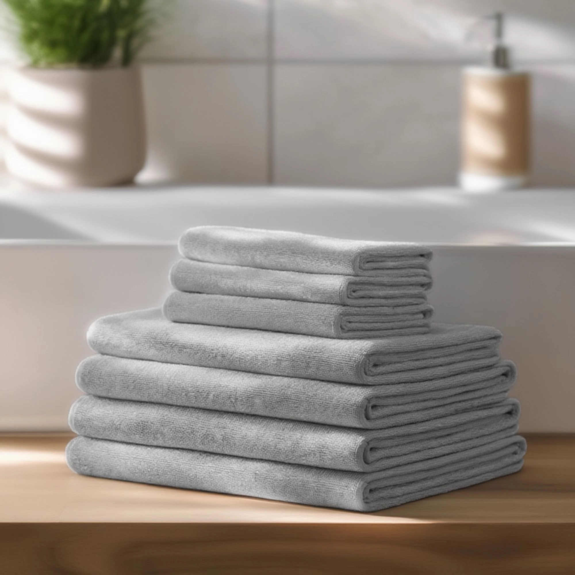 Slipp tunge og langsomt tørkende håndklær - med disse lysegrå mikrofiberhåndklærne får du en lett og praktisk løsning som passer perfekt for en aktiv hverdag. Den myke mikrofiberen føles behagelig mot huden og absorberer effektivt, så du blir raskt tørr - enten du er på treningssenteret, i svømmehallen eller på farten. Håndklærne tørker raskt og fyller minimalt, noe som gjør dem ideelle både i sportstasken og i kofferten. Perfekt for deg som ønsker funksjonalitet uten å gå på kompromiss med komfort. Den pustende kvaliteten motvirker fukt og lukt, slik at håndklærne føles friske igjen og igjen. Et smart og hygienisk valg for både trening, reise og daglig bruk. I denne 8-pakken får du 4 håndklær i str. 70x140 cm og 4 stk. i str. 50x100 cm.