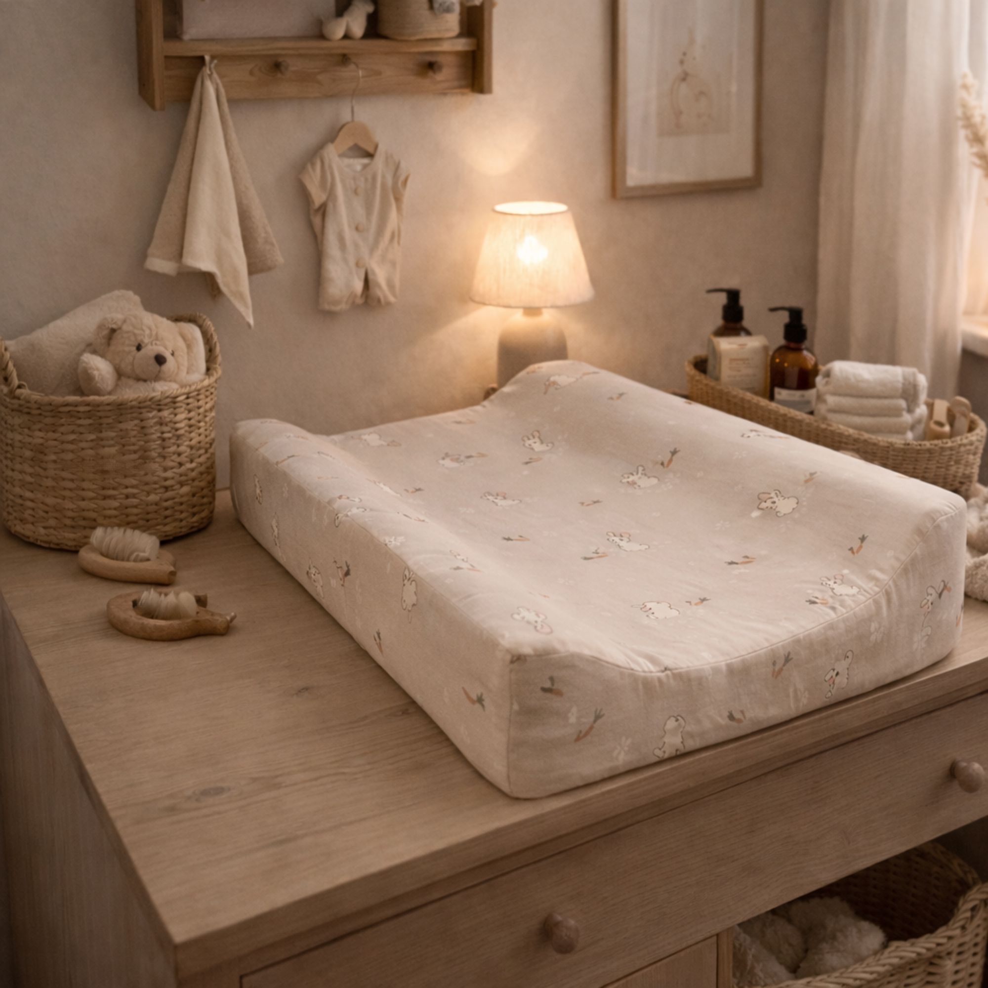 Skap et trygt og komfortabelt stelleområde med denne pusleputen fra Nordstrand Home i et pent sandfarget design med kaniner. Pusleputen måler 65x50 cm og passer til de fleste stellebord og kommoder. De forhøyede kantene på 9 cm og den 4 cm tykke midten gir ekstra støtte og bidrar til å holde barnet trygt plassert gjennom hele stelletiden.