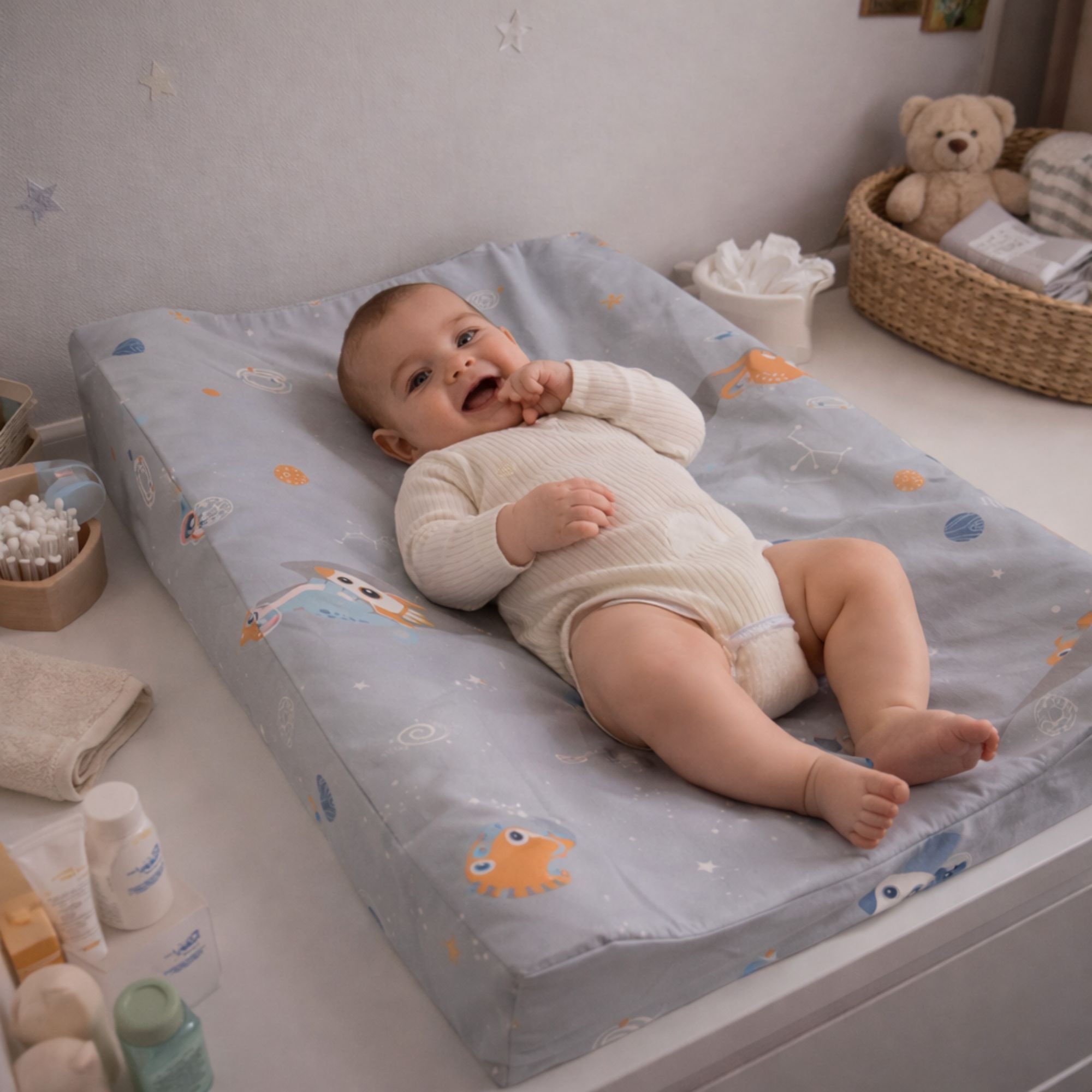 Den vannavvisende overflaten gjør det enkelt å tørke bort små uhell med en fuktig klut. Materialet er slitesterkt og beholder formen, selv ved daglig bruk. Kombinasjonen av komfort og funksjonalitet gjør pusleputen ideell til både raske stelleøkter og koselige stunder ved puslebordet.