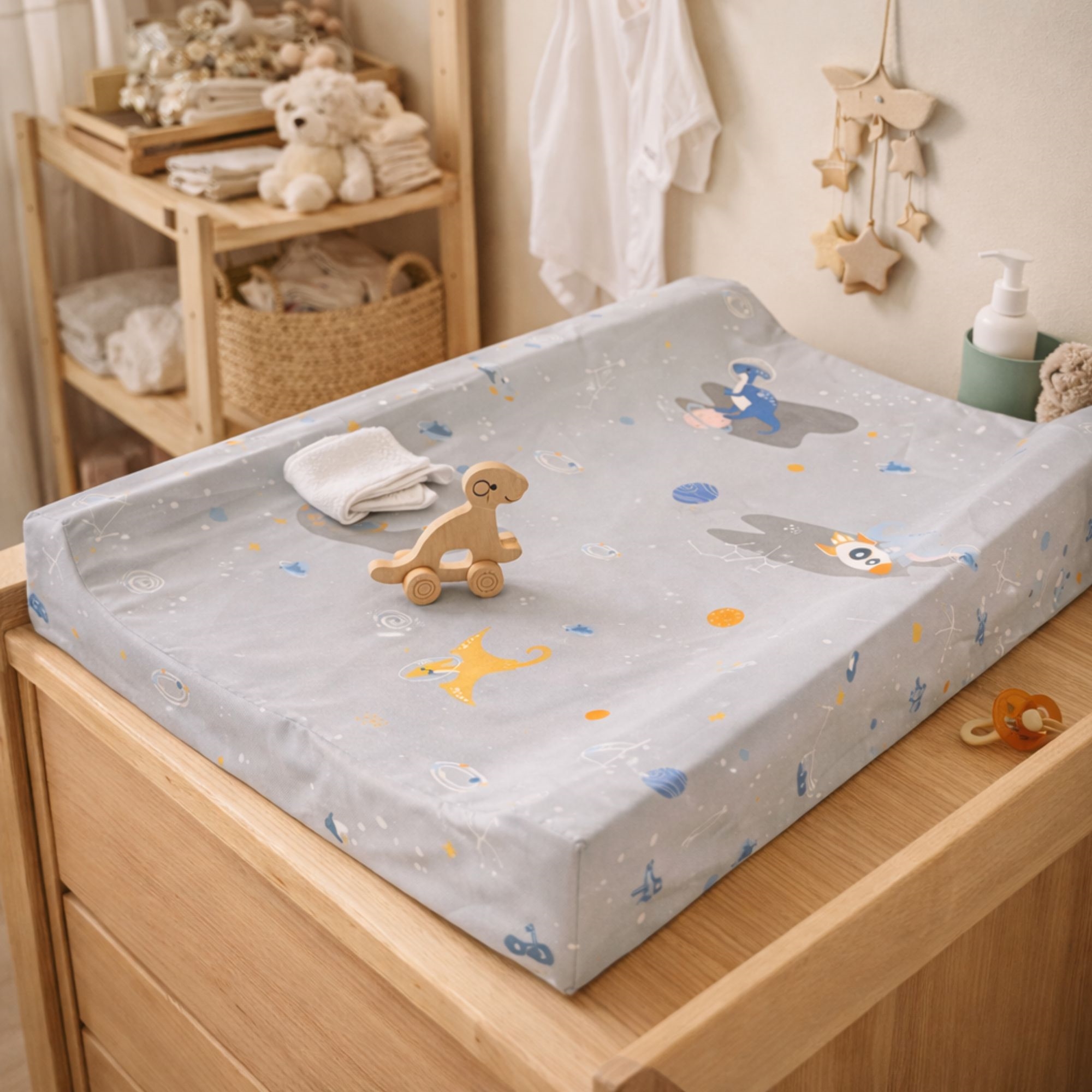 Skap en trygg og komfortabel pusleplass med denne pusleputen fra Nordstrand Home i et fint grått design med romdinosaur. Pusleputen måler 65x50 cm og passer til de fleste puslebord og kommoder. De forhøyede kantene på 9 cm og den 4 cm tykke midten gir ekstra støtte og hjelper med å holde barnet sikkert plassert under hele pusletiden.