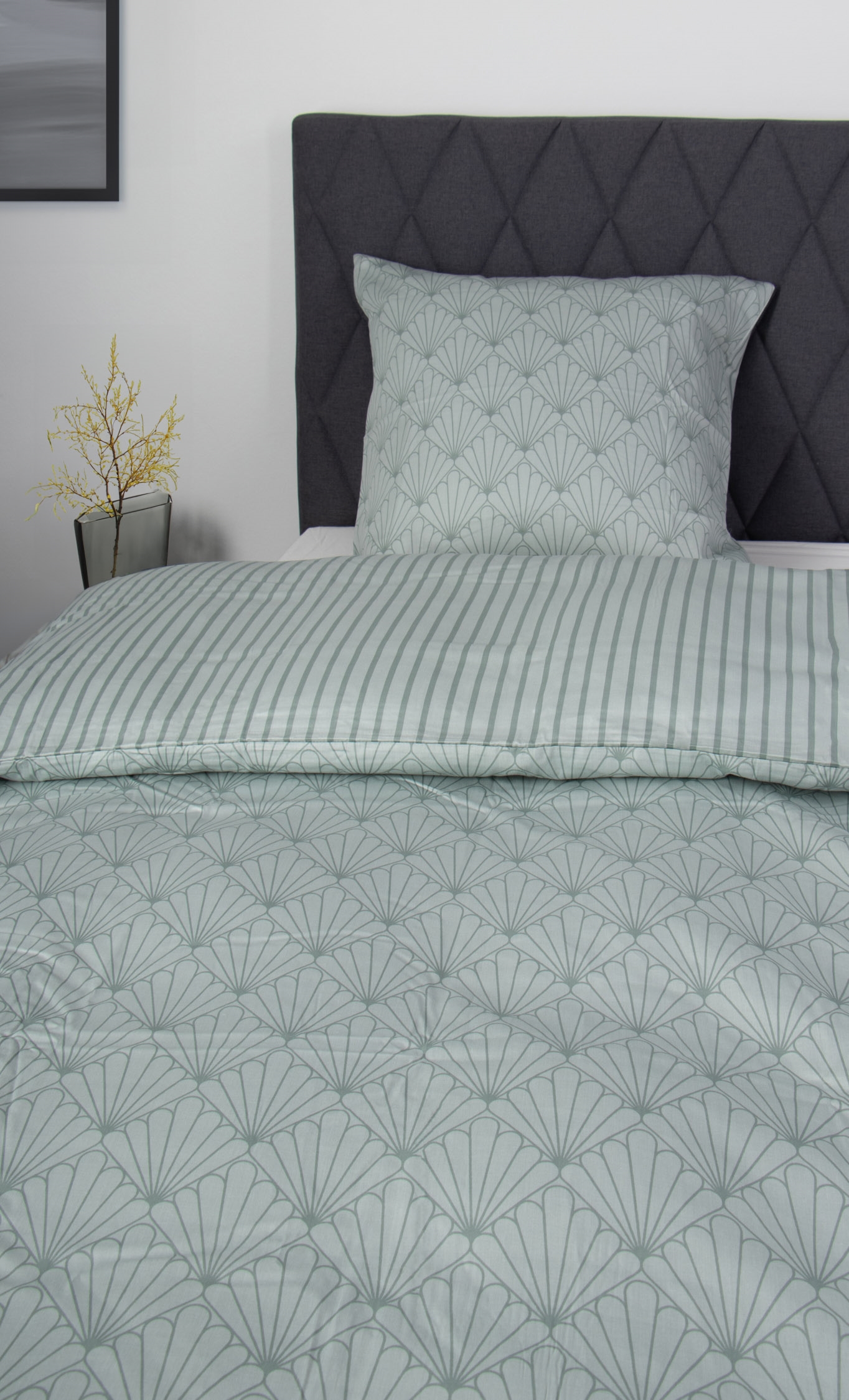 Forside »Hodeputer » Putetrekk Putetrekk 60x63 cm - Vendbart design i 100% bomullssateng - Fan green - Fra By Night Spar56% Borg LivingBy Night 339,00149,00NOKSpar 190,- På lager Trustpilot Antall Legg i kurv Se mer fra: Borg Living Artikkelnummer:490-9 Les vår sengetøyguide Se vårt store utvalg av laken Se vårt store utvalg av puter 60x63 Har du spørsmål om produktet? Kvalitets putetrekkEkstra fin satengvevningMykt og skinnende Putetrekk: 1 stk. á 60x63 cm Materiale: 100% bomullssateng Veving: Ekstra fin 240TC satengveving (trådantall = antall tråder per kvadrattomme) Farge: Grønn Design: Fan Vendbart: - Forside: Grafisk mønster - Bakside: Striber Merke: By Night Lukning: Med skjult YKK-glidelås Vask: 60° Tørketrommel: Ja Kan strykes: Ja Sertifisering: STANDARD 100 by OEKO-TEX® (2018OK0658) Putetrekk i 100 % tettvevd bomullssateng. Dette trekket fra By Night er kjent for sin vakre og glatte overflate som føles deilig og myk mot huden. Fordelen med bomullssateng er at det er pustende og holder deg behagelig kjølig om sommeren og varm om vinteren, en egenskap som gjør putetrekket anvendelig året rundt. I tillegg er trekket 100 % gjennomfarget, noe som betyr at fargen er bundet i bomullsfibrene under produksjonen. Dette gir utrolig høy farge- og vaskeekthet. Sengesettet er OEKO-TEX®-sertifisert. Sertifiseringen sikrer at produktet ikke inneholder helseskadelige stoffer og at det er produsert under ordentlige forhold, slik at du kan sove trygt om natten. Vi tar også godt vare på miljøet. Vendbart design: Putetrekket er laget i et vendbart design, som betyr at begge sider er mønstret eller farget. Et vendbart putetrekk gir deg muligheten til å endre utseende ved å snu det. Dette gir deg også muligheten til å matche med forskjellige dekorasjoner eller farger på soverommet. Vendbart design – for en mer fleksibel innredning! Frisk opp sengen og soverommet med et flott og behagelig sett sengetøy som dette. Benytt anledningen til å sikre maksimal sovekomfort ved å legge til et nytt, mykt laken av høy kvalitet. Du finner vårt store utvalg av kvalitetslaken her By Night kjennetegnes av dansk design – de gir deg behagelige sovekomponenter for ditt nattmiljø i aller høyeste kvalitet. By Night produserer sengetøy og laken for hele familien og legger stor vekt på tidens trender, slik at produktene alltid involverer moteriktige farger og design. Tilbake til Putetrekk