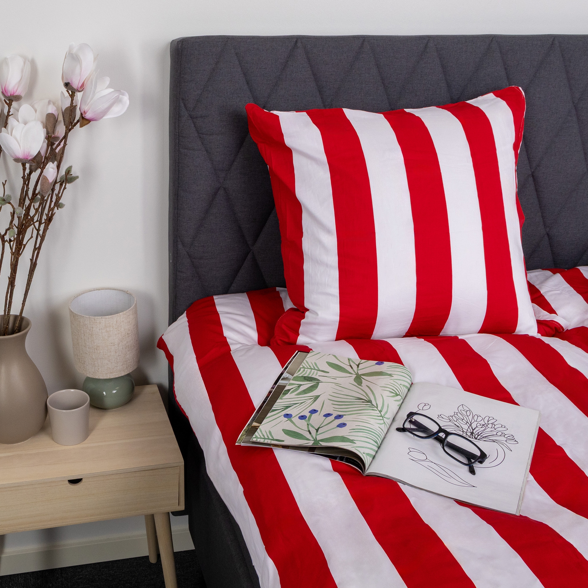 Det brede stripete trykket gir et skarpt og harmonisk uttrykk. Kombinasjonen av røde og hvite striper gir soverommet et avslappet og rolig uttrykk, samtidig som designet er lett å kombinere med ulike puter.