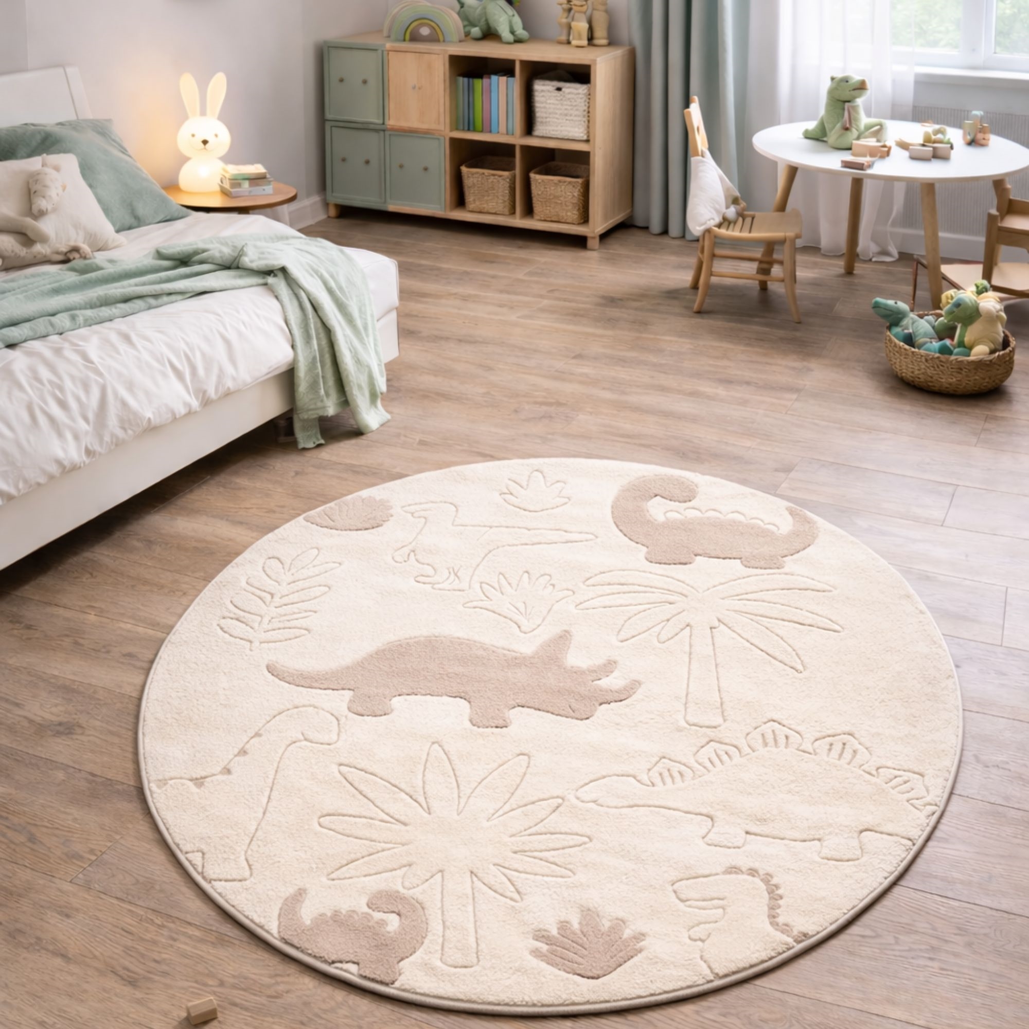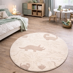 Savner du en enkel og lett måte å skape helhet i hjemmet ditt? Da kan dette flotte gulvteppet være det elementet som binder innredningen sammen. Skap et koselig og fantasifullt univers på barnerommet med dette runde beige gulvteppet med dinosaurer fra Eclipse Kids. Det fine dino-motivet i rolige naturfarger gjør teppet til et dekorativt og lekent element som barn vil elske. Den runde formen fungerer perfekt som samlingspunkt for lek. På grunn av teppets materialer (PP og PES) er det robust og egnet for daglig bruk på barnerommet, hvor det både lekes, koses og leses godnattfortellinger. Det runde dinosaur-gulvteppet er ideelt som leketeppe midt i rommet, under et lite bord eller som et mykt underlag ved sengen. Et åpenbart valg for deg som ønsker et praktisk og dekorativt barnegulvteppe i beige nyanser som skaper varme og trygghet i innredningen. OBS: Gulvteppet fås også i firkantet form. Se vårt store utvalg av forskjellige barne tekstiler her Med Nordstrand Home er du sikret boligtekstiler i dansk design - i nordisk stil. Nordstrand Home legger stor vekt på følelsen av velvære i et flott, men samtidig avslappet miljø. Med Nordstrand Home trenger du ikke gå på kompromiss, du finner alltid produkter i klassiske og moteriktige farger. Nordstrand Home – Så føler du deg hjemme!