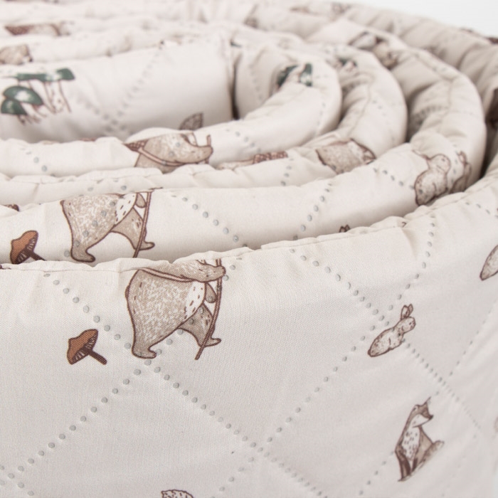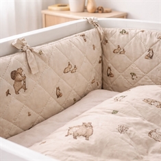 Det myke trekket og det fine trykket med skogens dyr i sandfargede nyanser skaper et koselig og barnevennlig uttrykk i babysengen. Sengekanten festes enkelt med de påsydde knytebåndene, slik at den sitter trygt på plass.