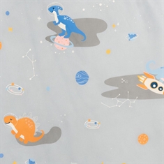Trekket er laget i 100% myk bomull, som kjennes behagelig og naturlig mot barnets hud. Det fine designet i grå nyanser med rom-dinosaur gir et søtt og rolig uttrykk i barnerommet.