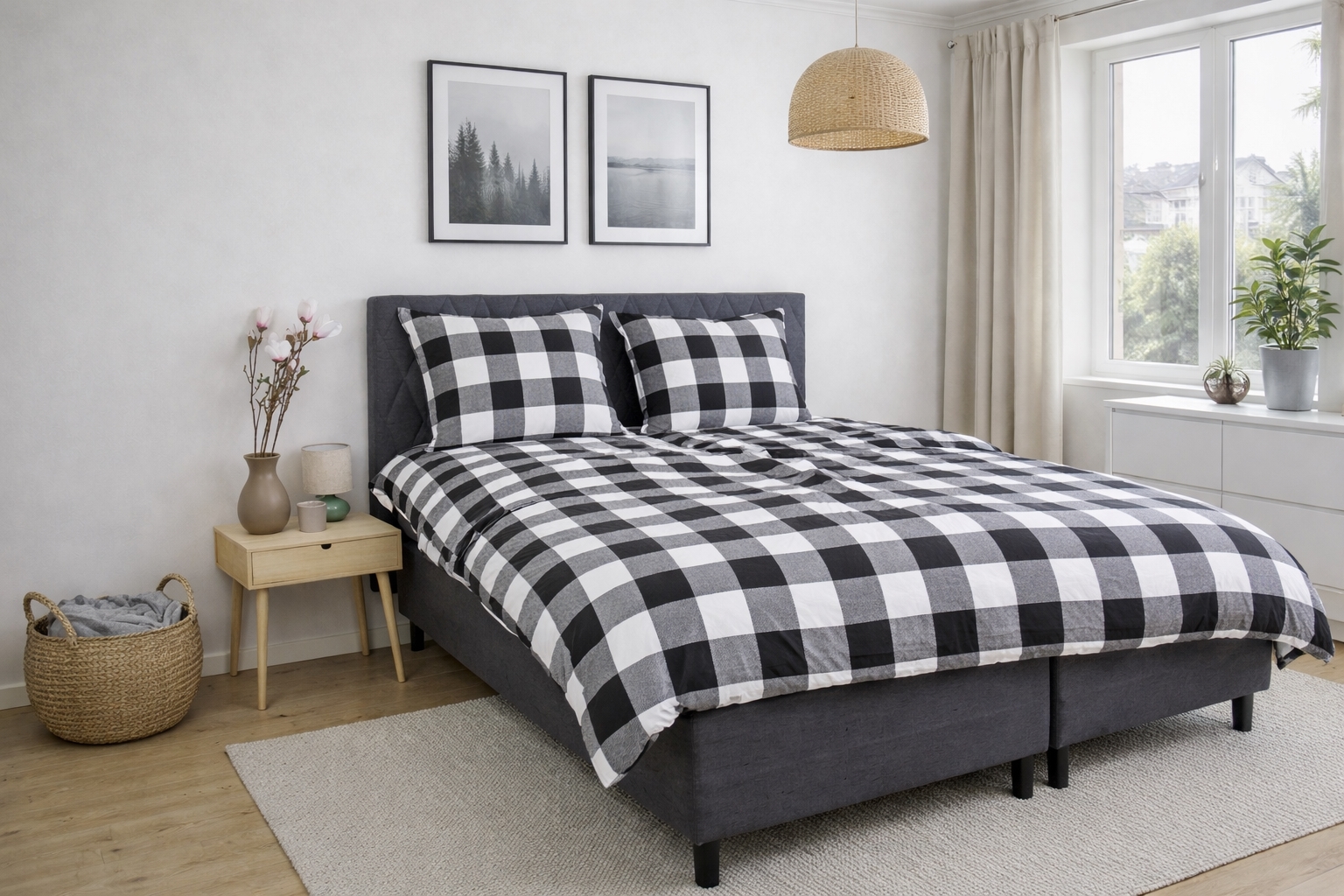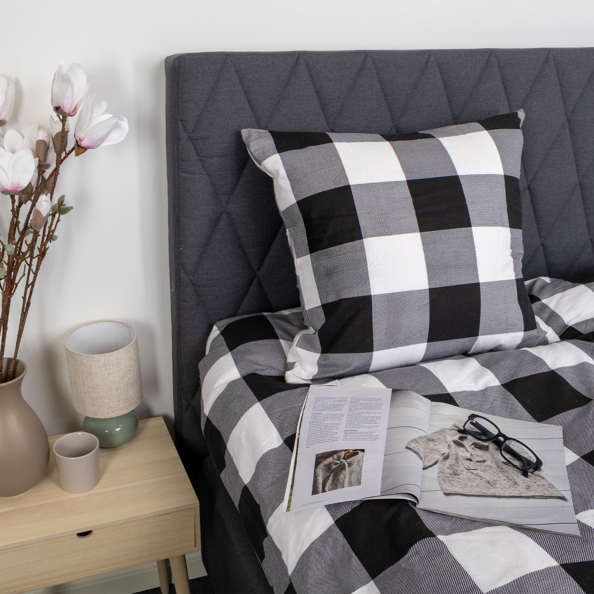 Forside »Sengetøy Sengetøy 140x200 cm - Bomulls sengetøy av flanell - Svarte og hvite ruter Spar50% By Night 899,00449,00NOKSpar 450,- På lager Trustpilot Velg størrelse Velg variant Antall Legg i kurv Se mer fra: By Night Artikkelnummer:263-1 Har du spørsmål om produktet? Varmt og lunt sengesett, som føles behagelig mot hudenÅndbart og mykt materiale med høy komfortUtrolig myk og ludden overflate Dynetrekk: 140x200 cm Putetrekk: 1 stk. á 60x63 cm Materiale: 100% bomulls sengetøy av flanell Vev: 200TC (Thread count = antall tråder per kvadrattomme) Farge: Svarte og hvite ruter Design: Rutemønster Merke: By Night Lukking: Dyne- og putetrekk med innvendig glidelås Vask: 60° Tørketromling: Ja Tåler stryking: Ja Sertifisering: STANDARD 100 by OEKO-TEX® (20182KO658). Din garanti for at produktet er fri for helseskadelig kjemi. Bomullssengetøy av flanell med ruter - ekstra mykt og varmt Skap en koselig og innbydende stemning på soverommet med dette rutete flanellsengetøyet. Den myke bomullsflanellen gir en lun og behagelig komfort - perfekt for kjølige netter. Sengetøyet er laget i 100% bomulls sengetøy av flanell med en tett 200TC vev. Flanell kjennetegnes ved at bomullsfibrene er oppruet og børstet på overflaten. Denne behandlingen skaper den velkjente, luddene myke strukturen som gjør flanell sengetøy ekstra behagelig å ligge i. Den børstede overflaten holder varmen nær kroppen og gir en deilig lun følelse, uten at materialet mister sin naturlige åndbarhet. Bomullsflonel er derfor et åpenbart valg for deg som ofte fryser om natten eller ønsker et varmere sengetøy i høst- og vintermånedene. Samtidig er materialet slitesterkt og holder seg mykt vask etter vask. Det rutete designet kombinerer flotte svarte og hvite ruter, noe som skaper et rolig og harmonisk uttrykk på soverommet. Et rutete sengetøy som både føles lunt og ser elegant ut. Dyne- og putetrekk lukkes med innvendig glidelås, som sikrer en pen og praktisk avslutning. Sengetøyet er sertifisert etter STANDARD 100 by OEKO-TEX, noe som er din garanti for at produktet er testet og fritt for helseskadelig kjemi. Det kan vaskes ved 60 grader og tåler både tørketromling og stryking. Se alt vårt sengetøy av flanell her By Night By Night som er produsert av Borg Design er preget av dansk design - de gir deg behagelige produkter til din søvn i aller høyeste kvalitet. By Night produserer sengetøy og laken til hele familien og legger stor vekt på tidens trender, slik at produksjonen alltid inneholder moteriktige farger og design. Se hele utvalget fra By Night her Tilbake til Sengetøy