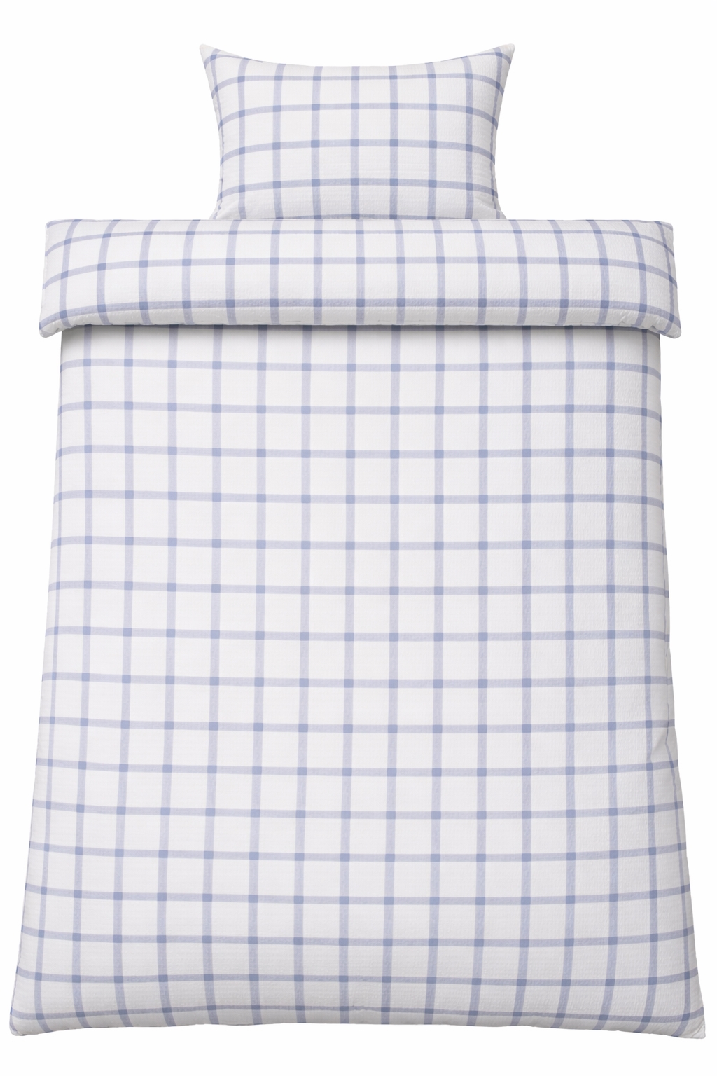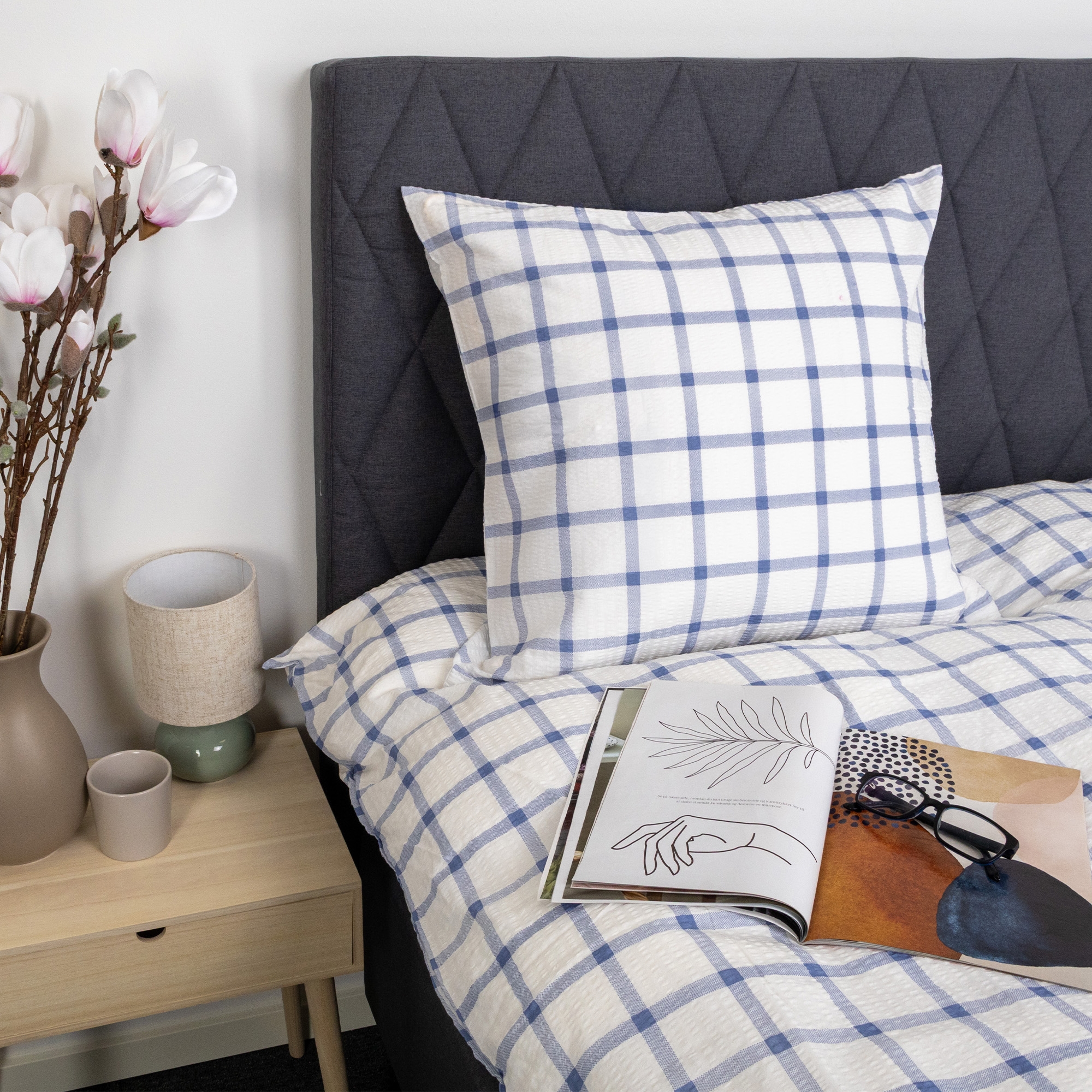 Dyne- og putetrekk lukkes med glidelås, som gjør det enkelt å skifte sengetøy og holder både dyne og pute sikkert på plass natten igjennom. Det rutete designet gir et rolig og tidløst uttrykk, som passer godt inn i både moderne og klassiske soverom.