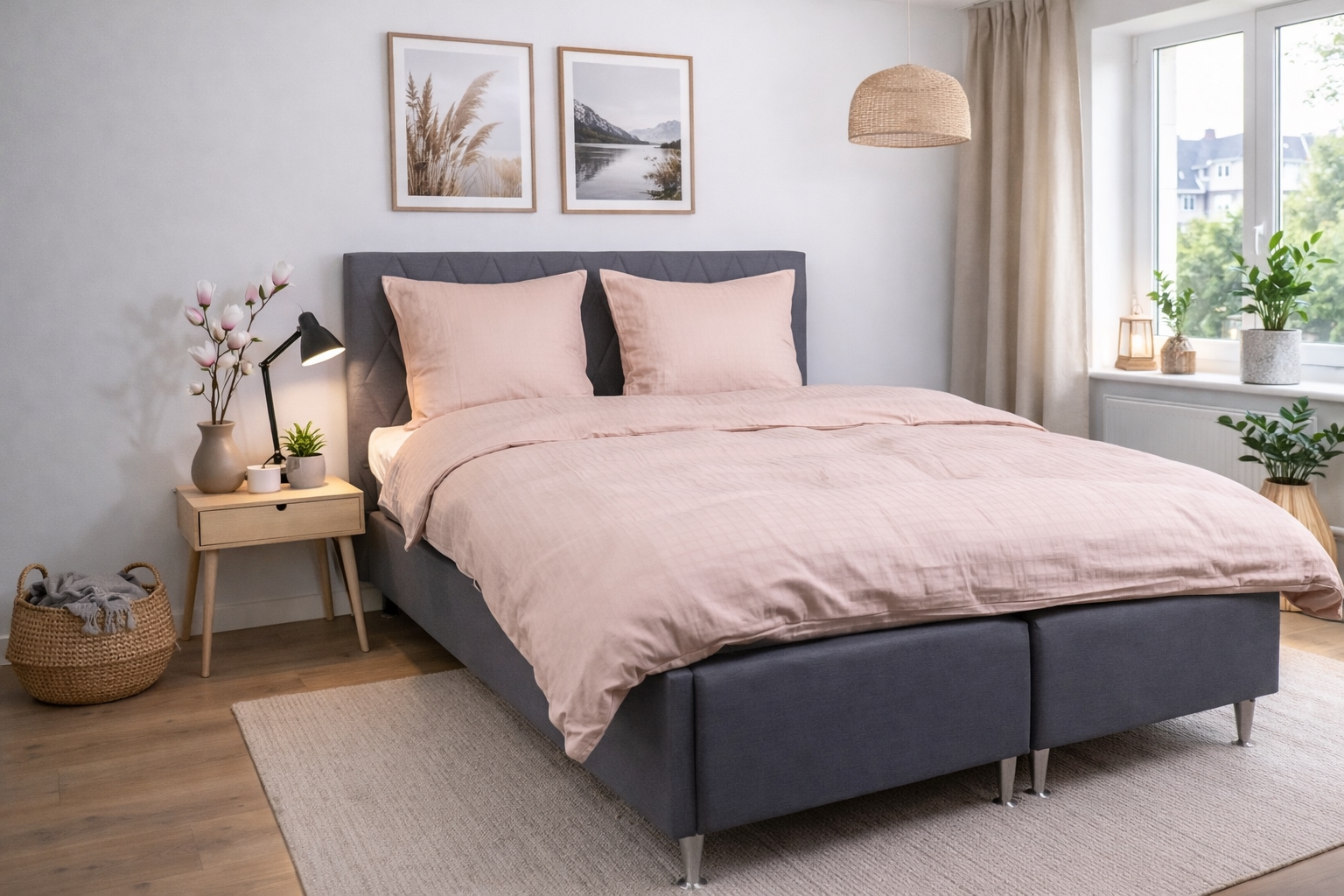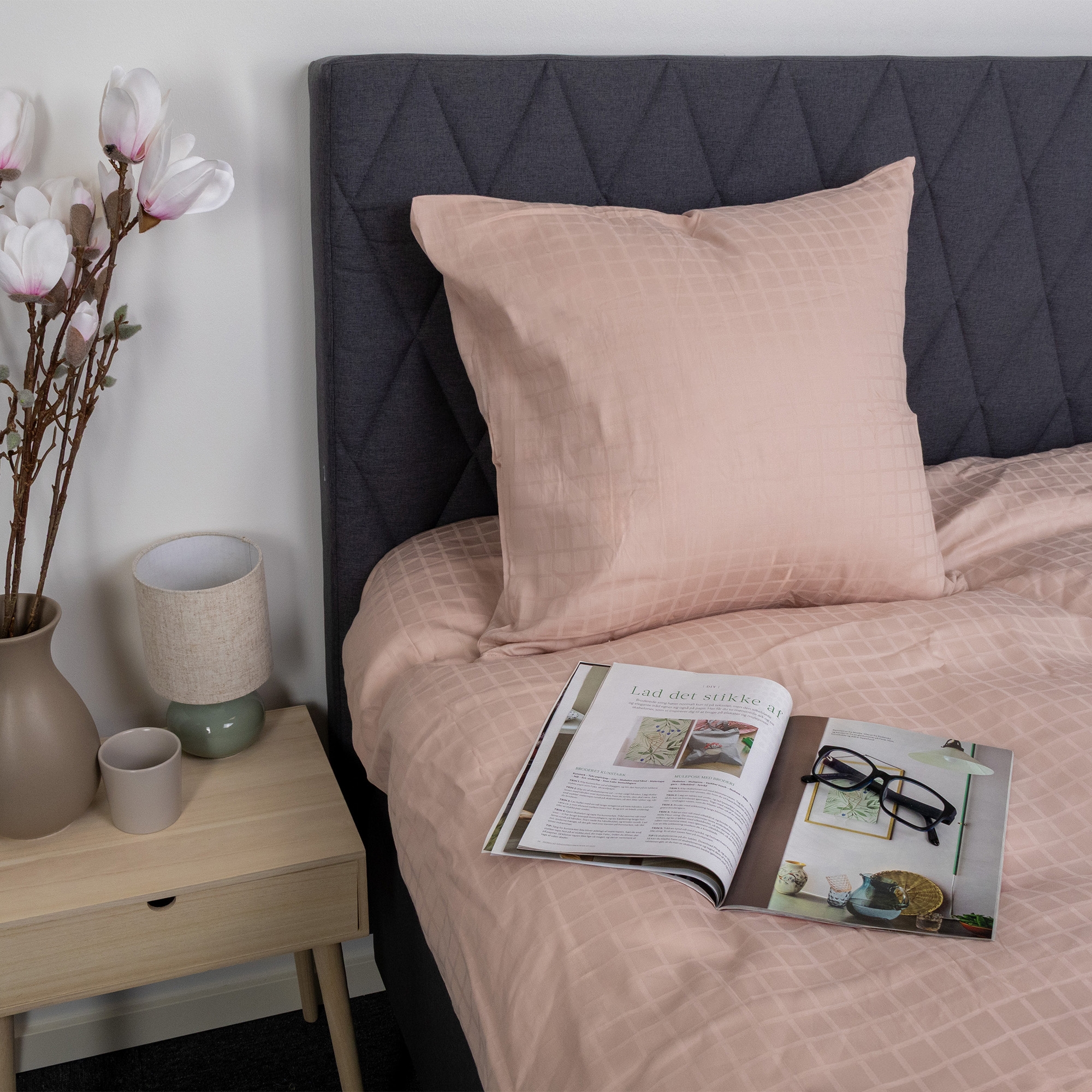 De rosa firkantene gir et moderne og sofistikert uttrykk som passer perfekt både i minimalistiske og klassiske soverom. Dynetrekk og putetrekk lukkes med skjult glidelås, som gir en pen finish og holder dynen sikkert på plass.