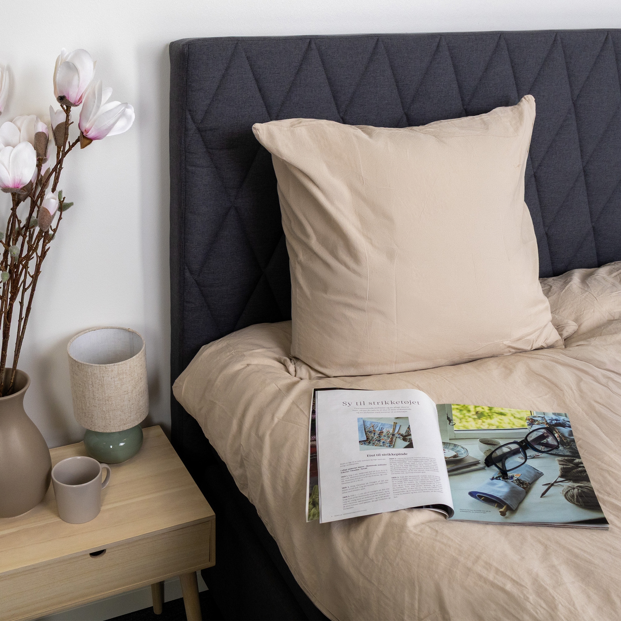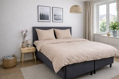 Dyne- og putetrekk lukkes med innvendig skjult glidelås, som gir et stilrent uttrykk og gjør det enkelt å skifte sengetøy. Den sandfargede nyansen og det ensfargede designet gjør sengesettet lett å kombinere med både lyse og mørke elementer i soverommet.
