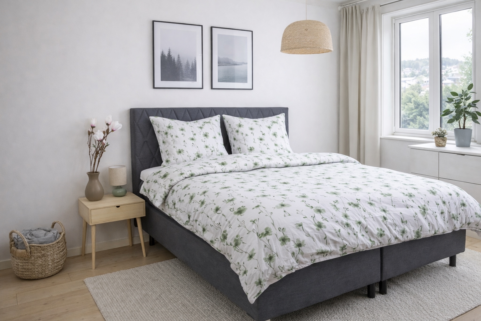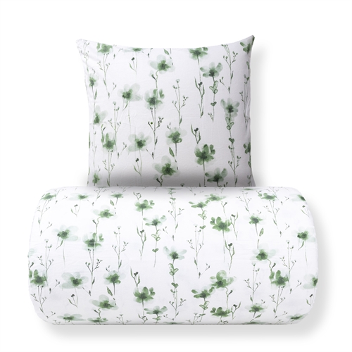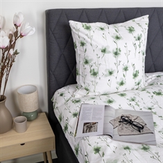Det blomstrede designet kombinerer flotte grønne blomster med en lys bakgrunn, noe som skaper et rolig og harmonisk uttrykk på soverommet. Et blomstrete sengetøy som både føles lunt og ser elegant ut.