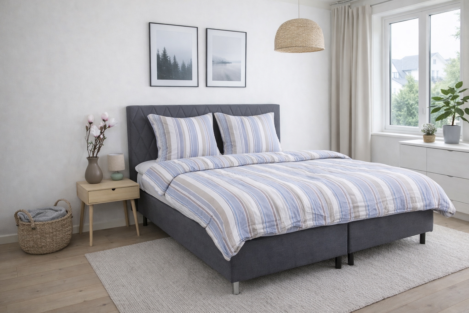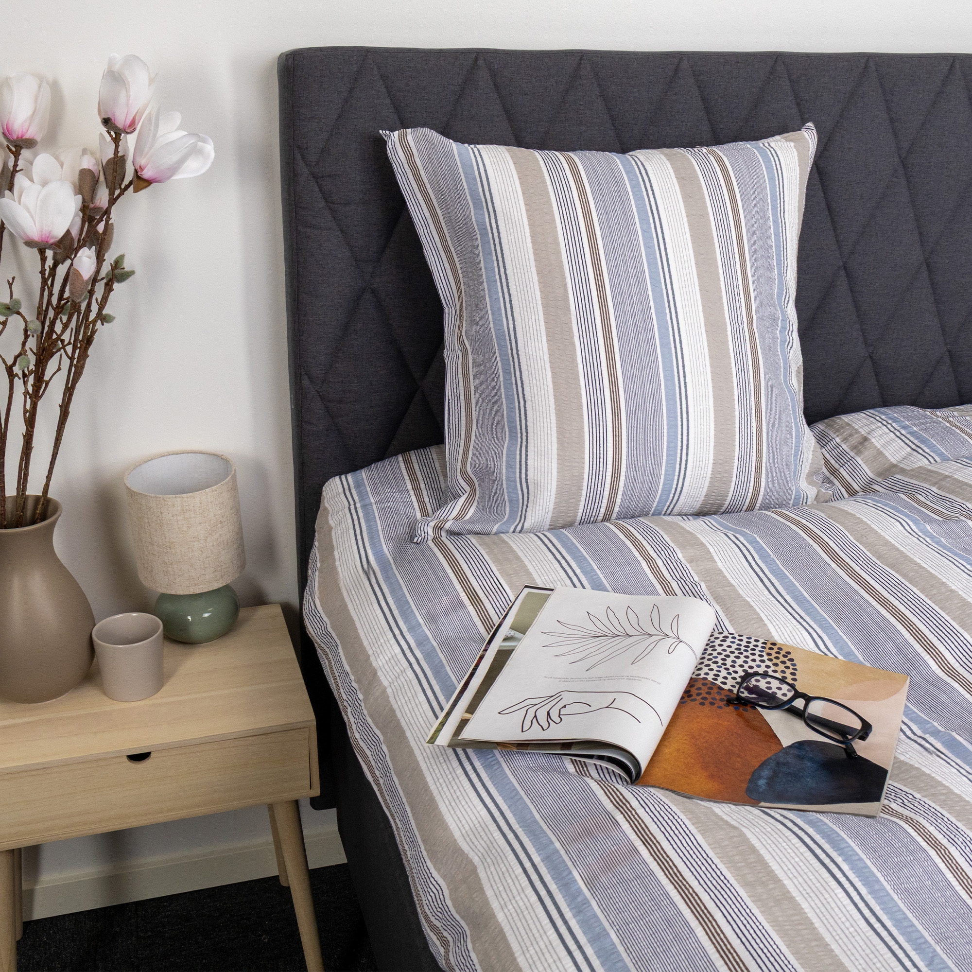 Dynetrekk og putetrekk lukkes med glidelås, som gjør det enkelt å skifte sengetøy og holder både dyne og pute sikkert på plass gjennom natten. Det stripete designet gir et rolig og tidløst uttrykk som passer godt inn i både moderne og klassiske soverom.