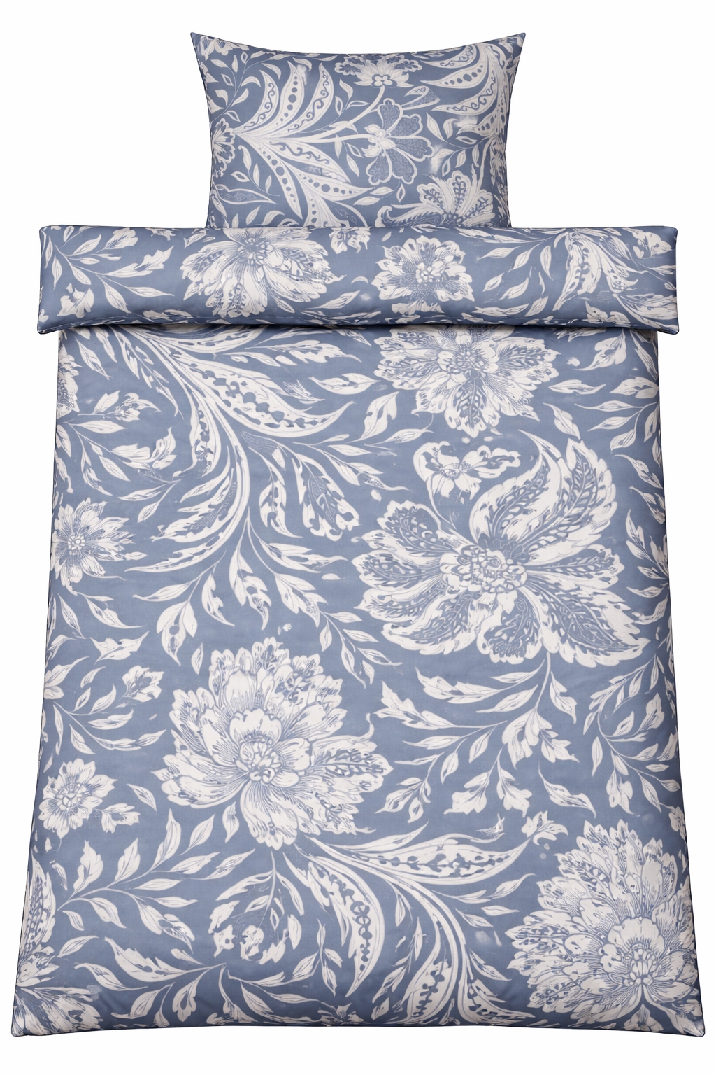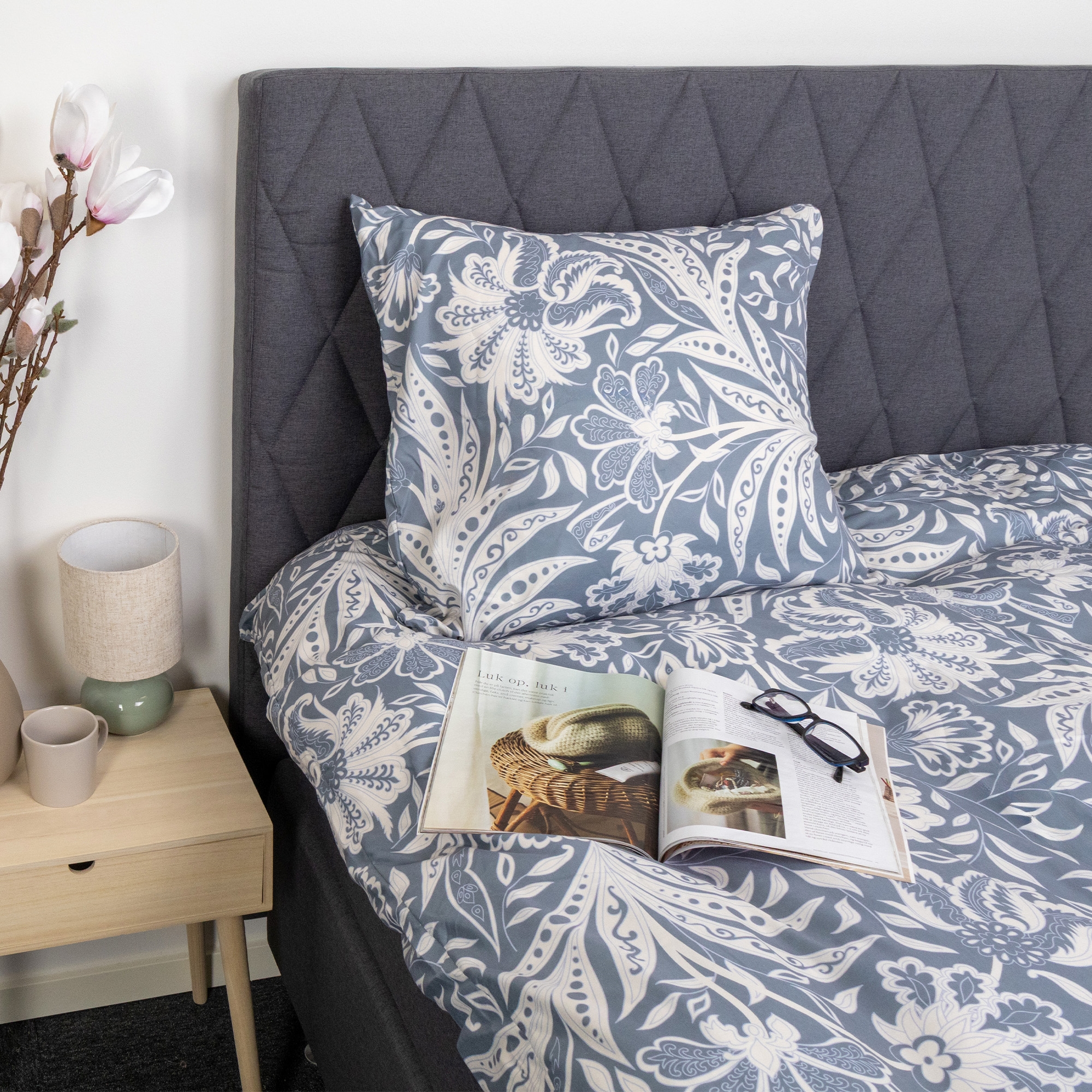 Både dynetrekk og putetrekk lukkes med innvendig glidelås, som sikrer at dyne og pute holder seg på plass, og gjør det enkelt å skifte sengetøy. Det blå blomsterdesignet skaper et rolig og dekorativt uttrykk som passer inn i både moderne og klassiske soverom.