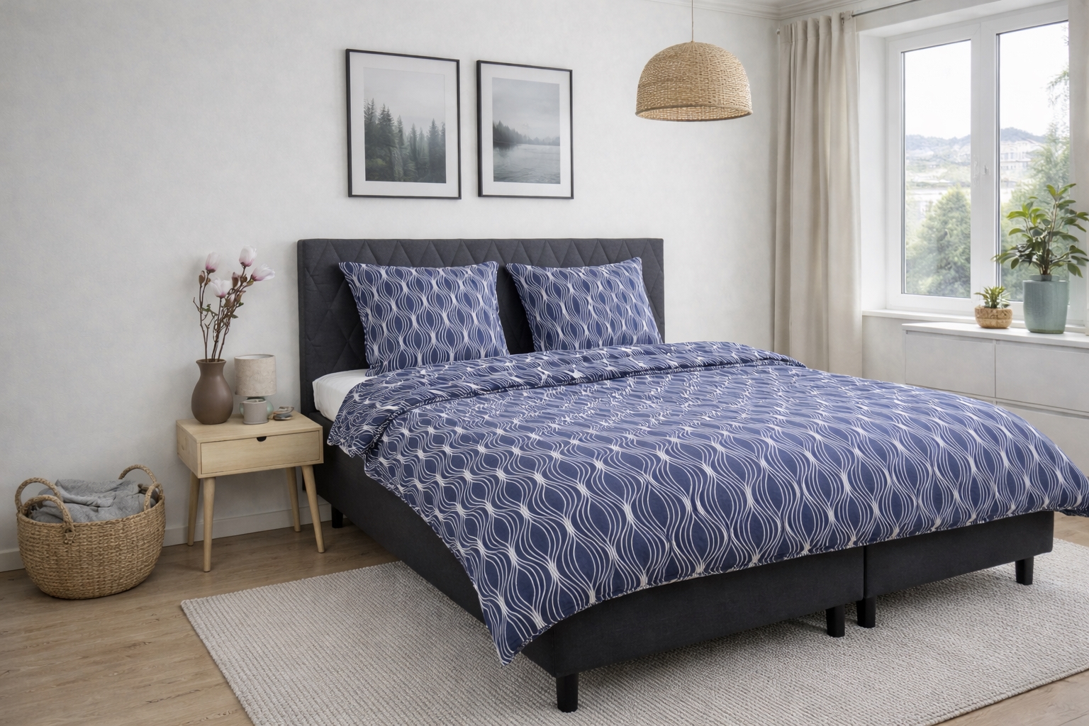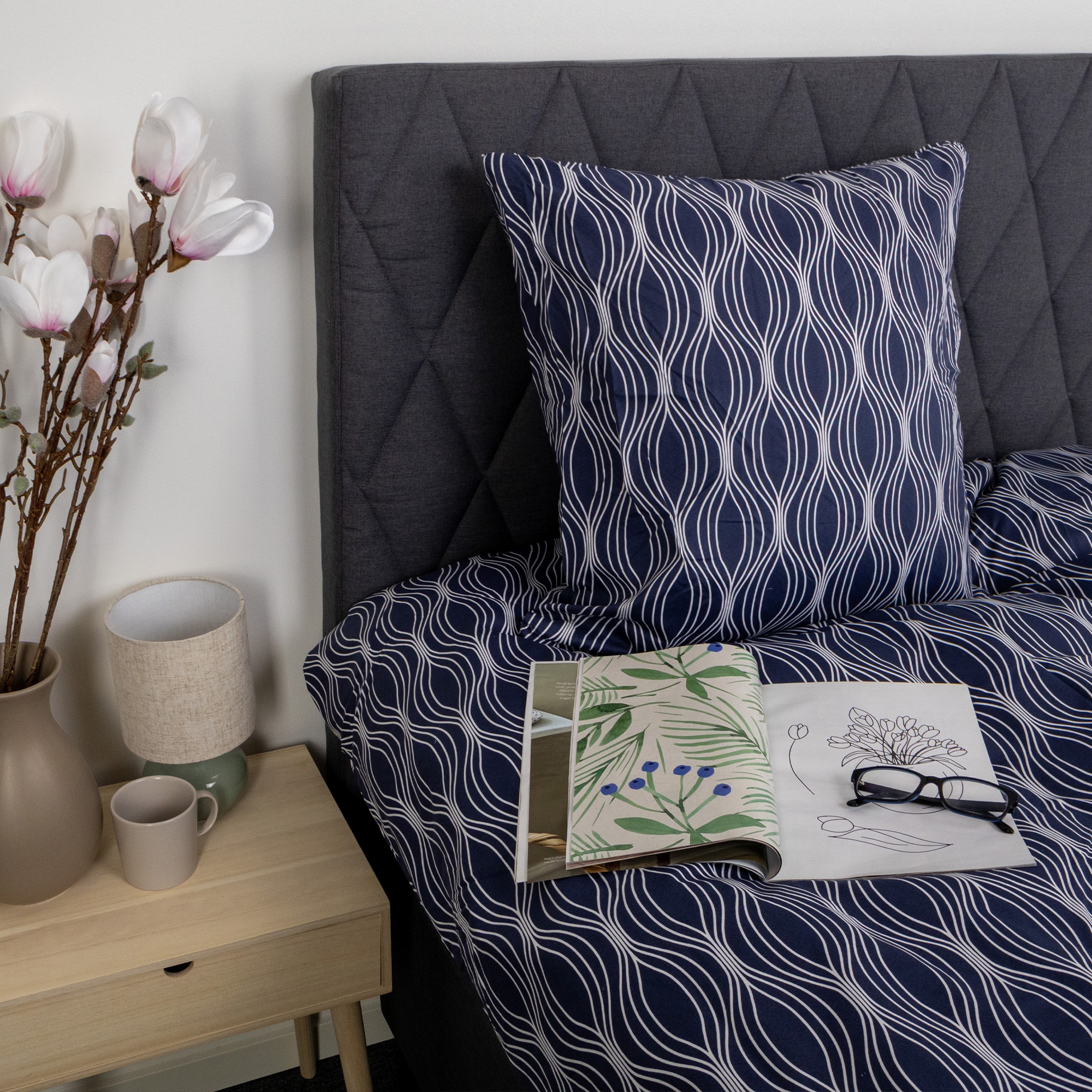Både dynetrekk og putetrekk lukkes med innvendig glidelås, som sørger for at dynen og puten blir på plass, og gjør det enkelt å skifte sengetøy. Det mønstrede designet skaper et rolig og dekorativt uttrykk som passer inn i både moderne og klassiske soverom.