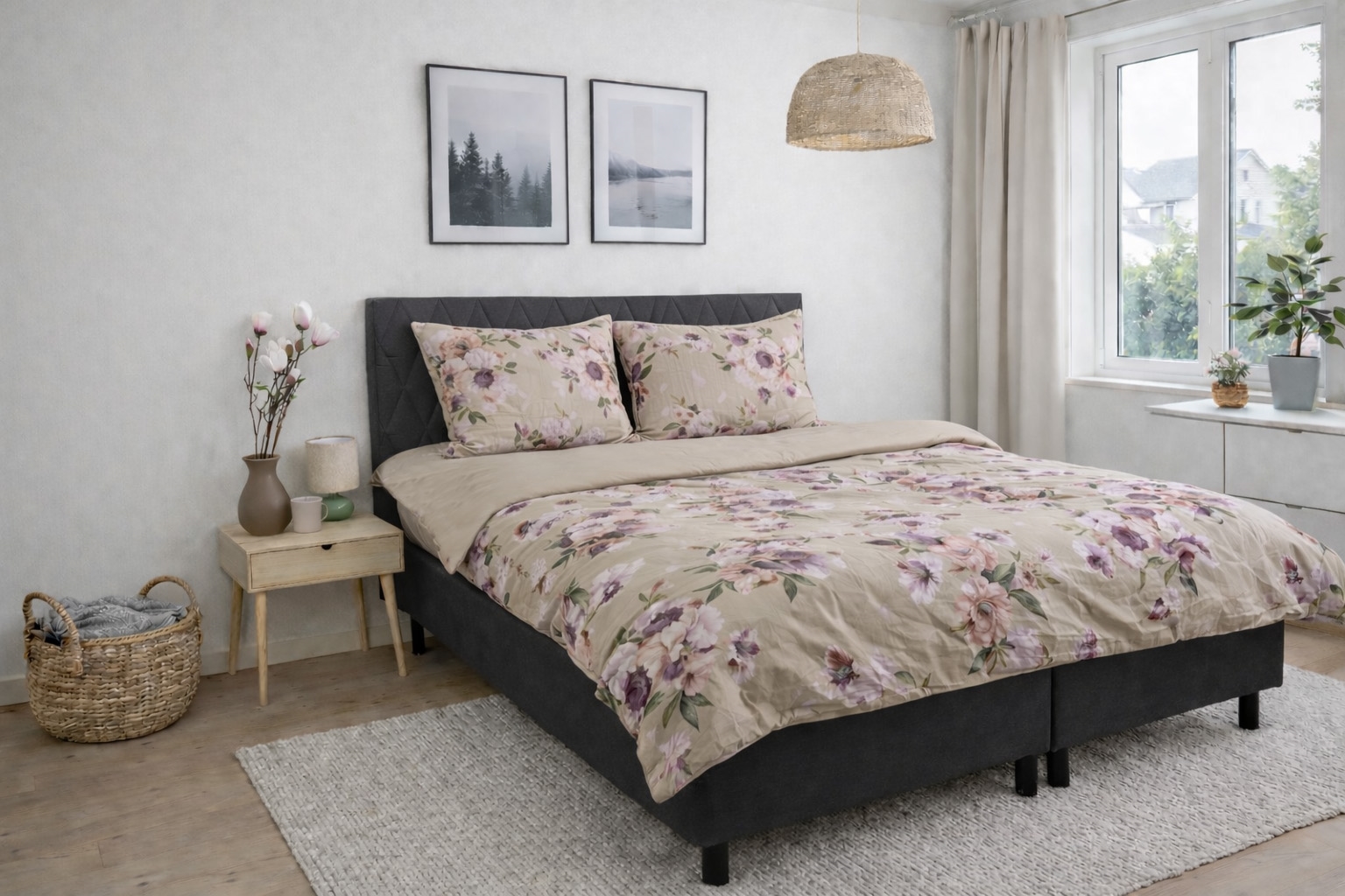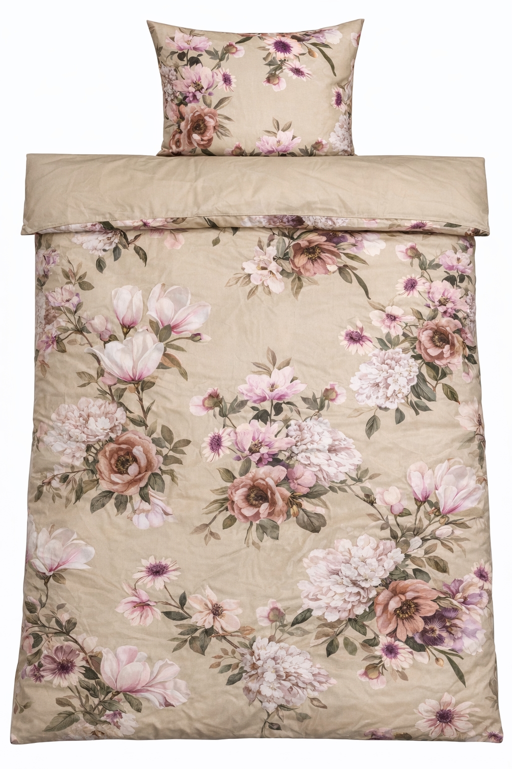 Skap et elegant og personlig uttrykk på soverommet med dette vendbare sengesettet i 100 % bomullssatin. Sengetøyet kombinerer et vakkert blomsterprint i sandtoner og beige nyanser på den ene siden med en rolig, ensfarget bakside, så du enkelt kan skifte uttrykk etter stemning og innredning.