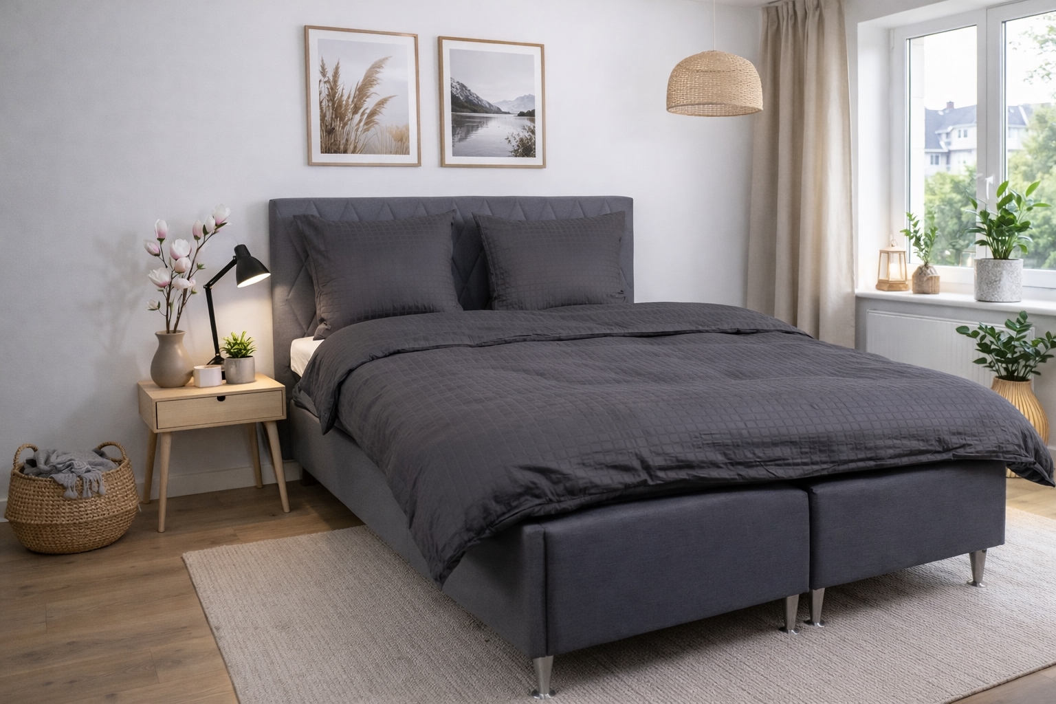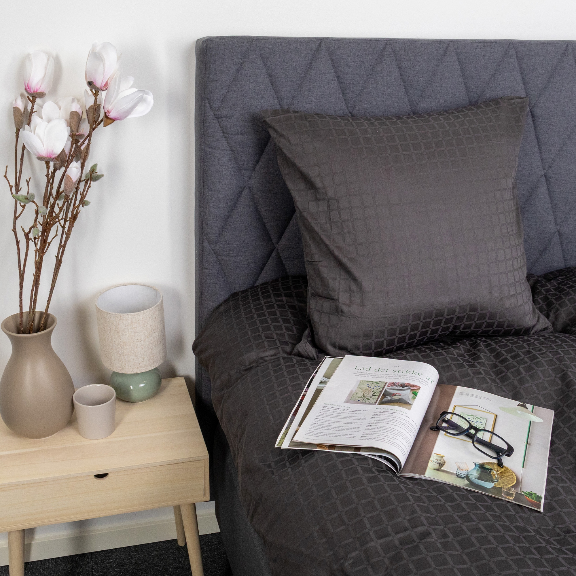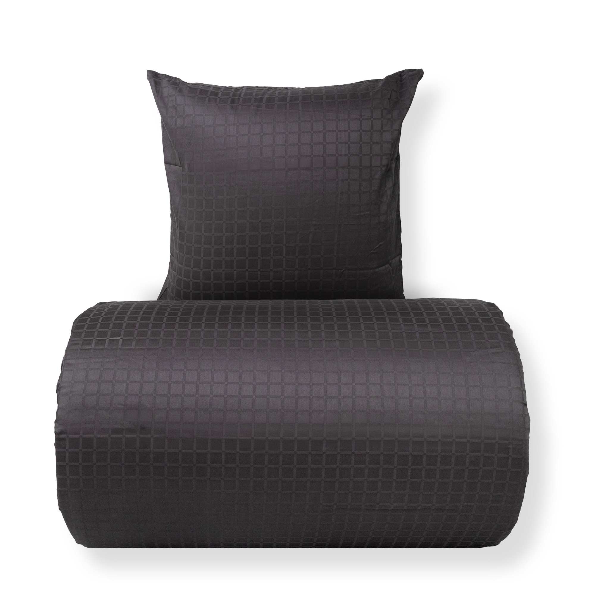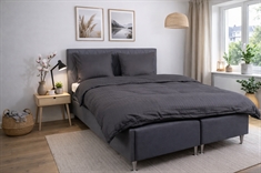 De mørkegrå rutene gir et moderne og sofistikert uttrykk, som passer perfekt i både minimalistiske og klassiske soverom. Dyne- og putetrekk lukkes med skjult glidelås, som gir en pen finish og holder dynen på plass.