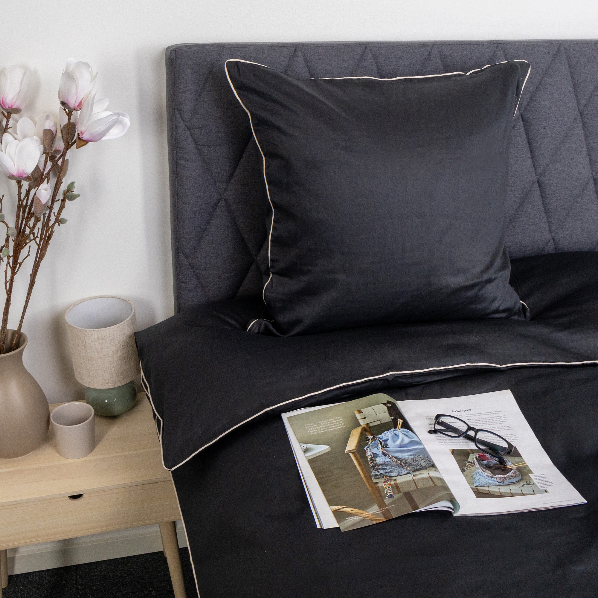 Skap et elegant og luksuriøst uttrykk på soverommet med dette eksklusive sengesettet i 100% bomullssatin med dekorativ pipingkant fra By Borg. Det ensfargede designet i dyp sort kombinert med en hvit pipingkant gir et stilrent og sofistikert uttrykk som løfter helhetsinntrykket på soverommet.